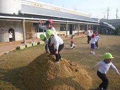 今日の出来事 大きなお山がある!(2025.11.14) 朝、幼稚園に来ると「大きなお山がある!」「早く遊びたい!」と大興奮の子どもたちです。前日、近畿砂利協同組合さんより、たくさんの砂をいただきました。外に出るとすぐに大きなお山に登ったり穴を掘り温泉をつくったりする姿が見られました。 2025.11.14 今日の出来事