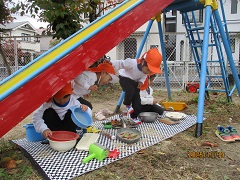 今日の出来事 すべりだいの下で(2025.11.19) ほし組の子どもたちは木の実や落ち葉を使い、ごちそうをつくる遊びに夢中になっています。ここ数日間はすべりだいの下に出掛け、そこをお家に見立てて過ごしています。「はい、ご飯できたよ。」「ピンポーン、ジュースお届けです。」とやり取りを楽しんでい... 2025.11.19 今日の出来事