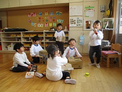 今日の出来事 もう1回しよ〜(2026.01.27) 2学期に引き続き、コンサートごっこを楽しんでいる子どもたち。最近は太鼓やピアノの演奏隊や撮影のカメラマンも登場しています。「もう1回しよ〜。」「写真撮って!」とみんなで一緒に楽しんでいます。 2026.01.27 今日の出来事