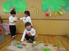 今日の出来事 いっぱいとれたよ〜。(2026.02.10) 土曜日の発表参観を終え子どもたちは余韻を楽しんでいます。「にんじん、ぬいちゃお〜。」「いっぱいとれたよ〜。」「これ持ってピクニックにでかけよう。」と場面を再現したり遊びに取り入れたりしていました。 2026.02.10 今日の出来事