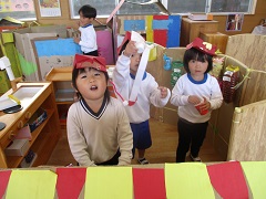 幼稚園では今日もマクドナルドが開店しています。今日はほし組が店員になって働いていました。そら組につくってもらった帽子をかぶり大はりきりです。「ジュースは何にしますか?」「おもちゃは要りますか?」と楽しく働いていましたよ。