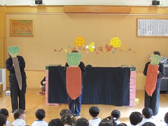 今日は11月うまれのお友達のお祝いをしました。今日の質問コーナーは、好きなフルーツは?好きなおもちゃは?などが出ていました。小さい時の思い出の品物を見せてもらったり、お話を聞かせてもらったりして楽しく過ごしました。今日の出し物は、職員の劇の『にんじん、だいこん、ごぼう』のお話です。野菜たちがお風呂を嫌がったり、気持ち良く入ったりするお話ですが、途中、今みんなが楽しんでいる“アイドルごっこ”も盛り込んだオリジナルの部分もあり、楽しんで見ていました。