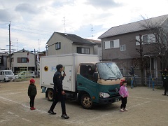今日はヤマト運輸さん、城陽警察の方に来ていただき親子セーフティークラブを行いました。ネコのミケちゃんと横断歩道の渡り方を紙芝居で確認し、実際に信号を見たり手を挙げたりしておさらいをしました。保護者の方にもトラックの運転席からの死角について教えていただき、交通安全について再確認することができました。これからも安全に過ごせるよう意識していきたいですね。