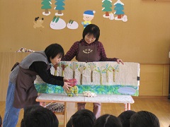 2月のお誕生日のお友達をみんなでお祝いしました。“頑張っていること”や“好きなところ”をお家の方に教えていただいたり、小さな頃の写真を見せていただき「めっちゃ小さい〜。」「かわいいなあ。」という声がたくさん聞かれました。城陽お話サークルさんにも素敵なお話も聞かせてもらい笑顔で楽しんでいました。素敵な誕生会になりました。