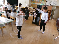 富野小学校の先生に来ていただき授業の体験をしました。少し緊張した様子でしたが始まるとすぐにワクワクの表情に。最初はクイズからスタートしました。いろんなヒントから答えを導き出します。隣の席の友達と相談する姿も可愛かったです。正解すると「やった〜!」と大喜びでした。次にぐるぐるうずまきをハサミで慎重に切って製作をしました。ゆっくり丁寧に切る表情は真剣そのもの。カラフルに色付けし、ぐるぐるヘビの完成です。嬉しそうでしたよ。学校の雰囲気を味わう貴重な体験となりました。
