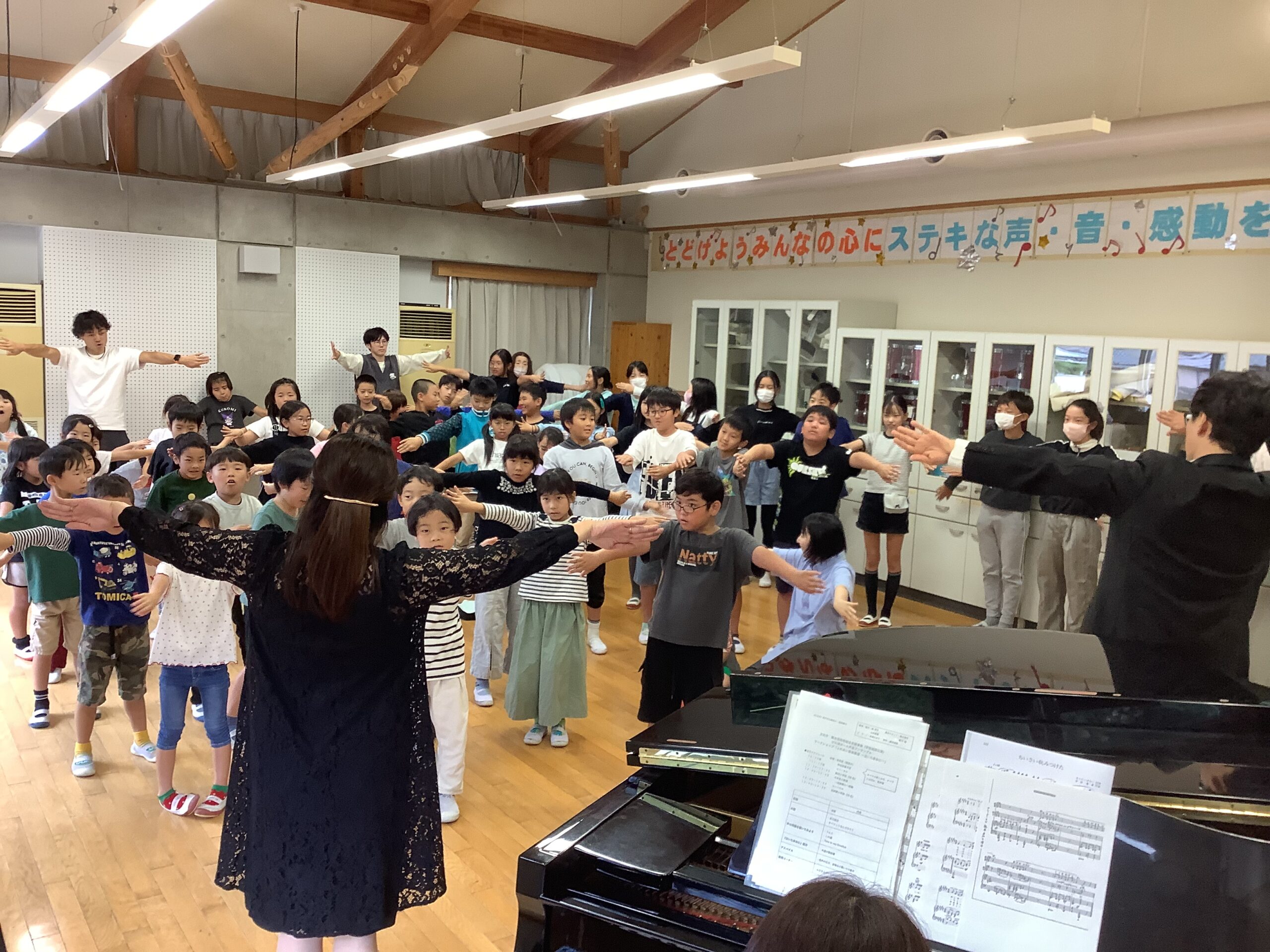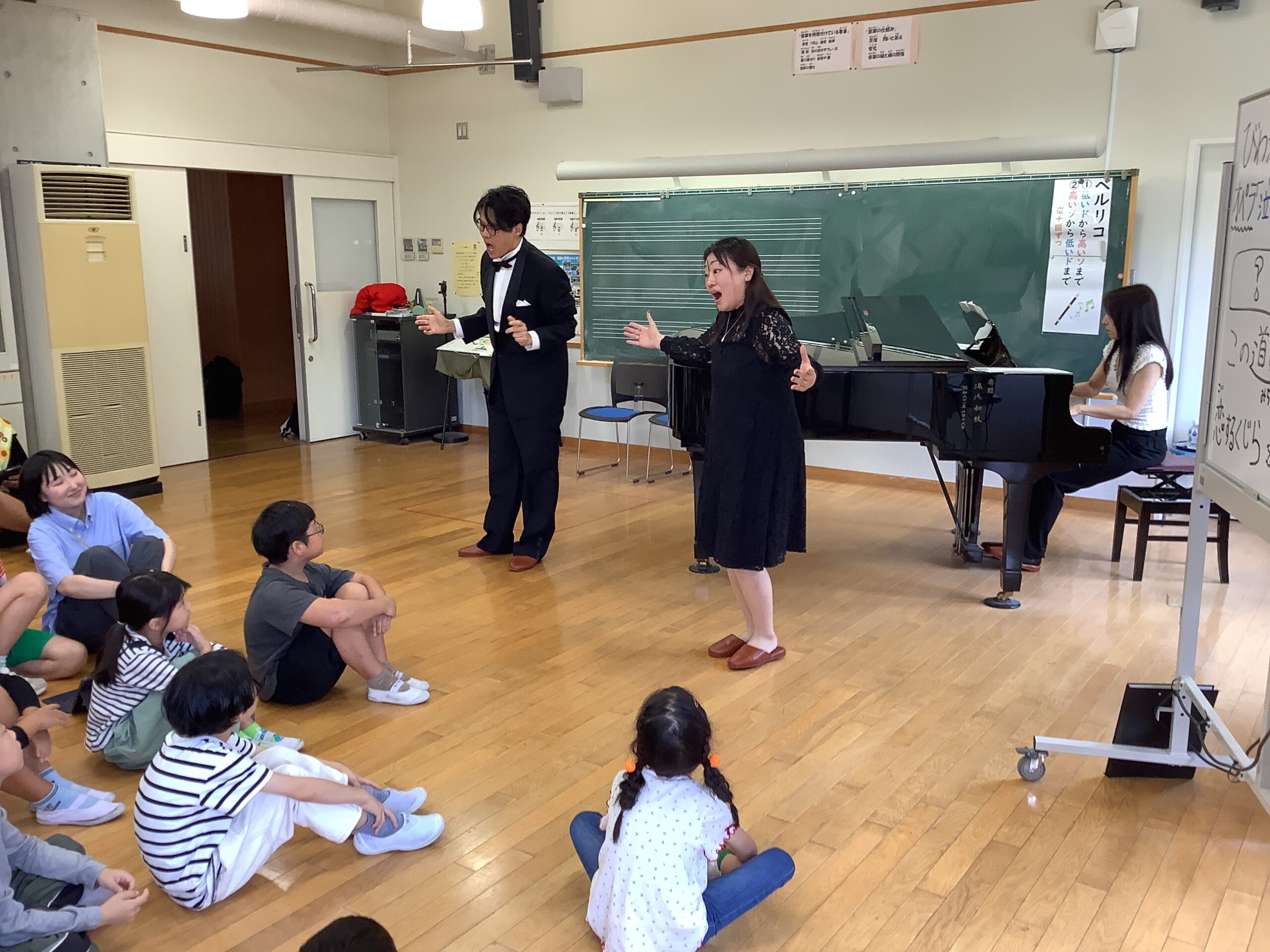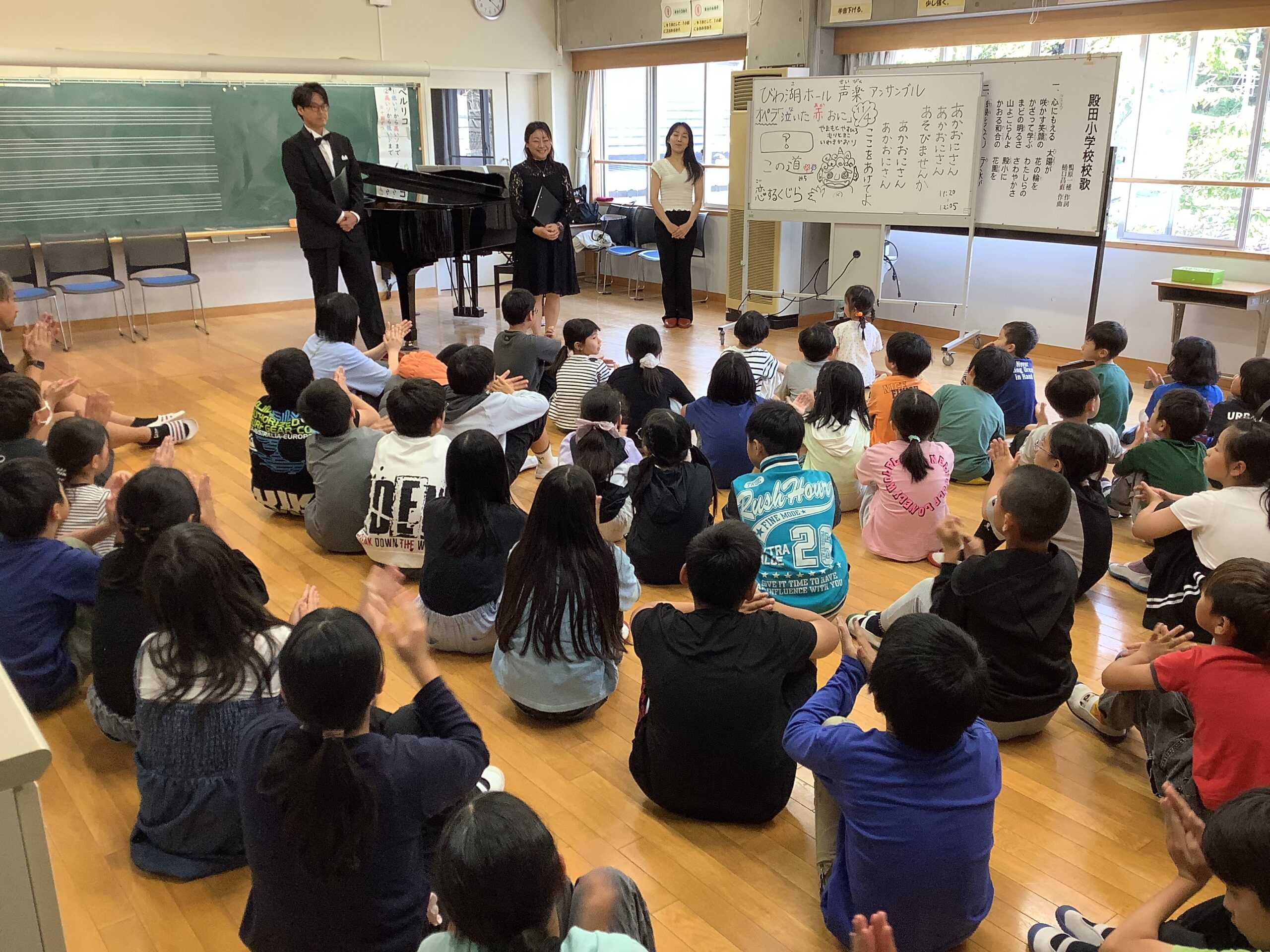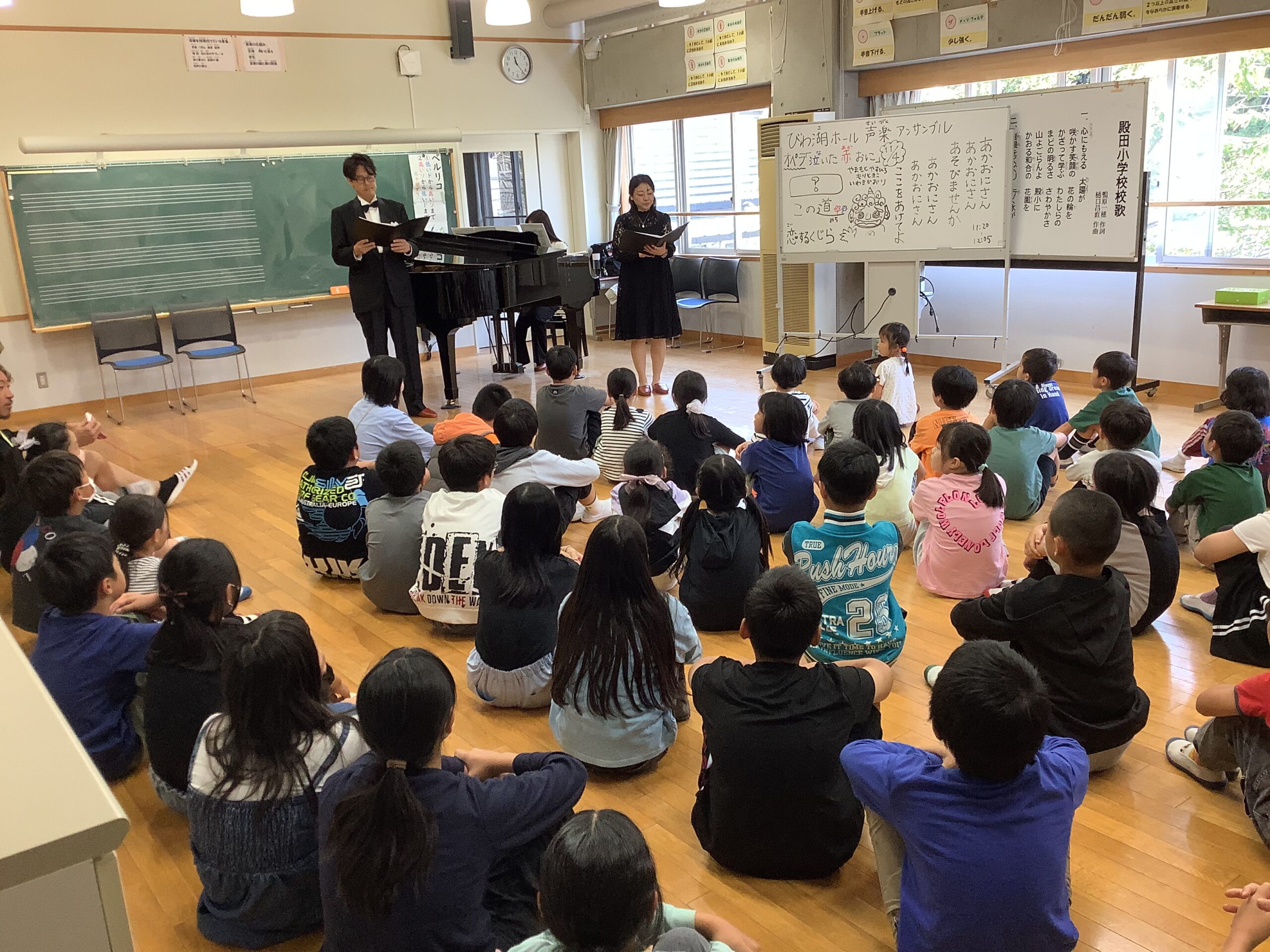 とのだっ子日記今日は、11月にある芸術鑑賞会のワークショップで「びわ湖ホール声楽アンサンブル」の皆さんに来ていただきました。校歌を歌っていただいたり、オペラでいろいろな曲を聴かせていただきました。また、お月見給食を6年生と食べてもらいました。本番が楽しみです。