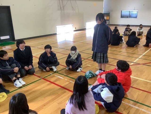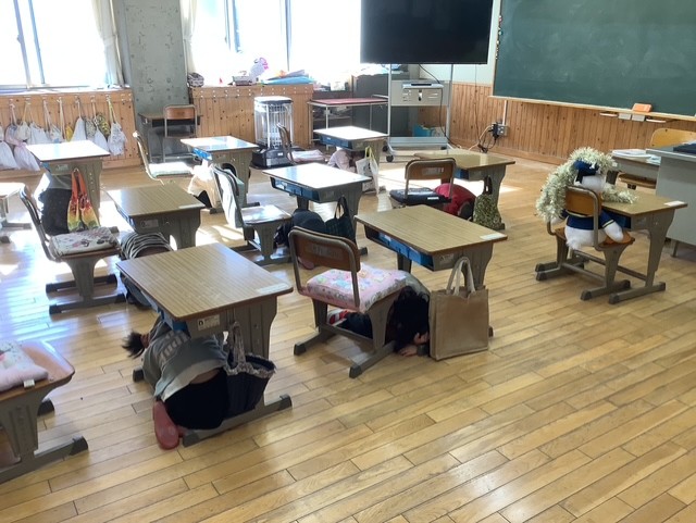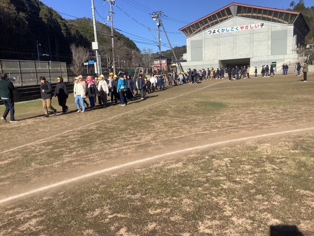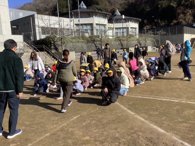 12月19日(金)に殿中1年生と避難訓練を行いました。地震後の土砂災害による洪水の恐れも想定して、一次避難場所の校庭から二次避難場所の旭山グラウンドに避難しました。訓練後には、中学校の体育館で振り返りをしました。
