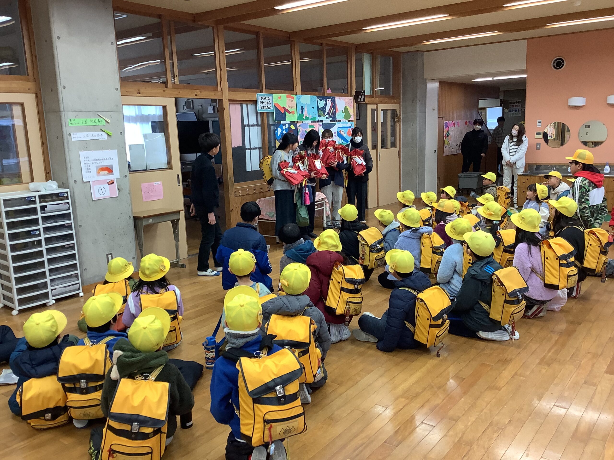 12日(木)の下校集会では、2つの取組の紹介がありました。1つ目は、4年生からの@「6年生のおすすめの本」です。図書室に行くと、6年生のおすすめの本が並んでいます。2つ目は、図書委員会からの「ラッピングブック」のお知らせでした。これも各学年の多目的室に置いてありました。どんな本に出会えるか…楽しみですね。