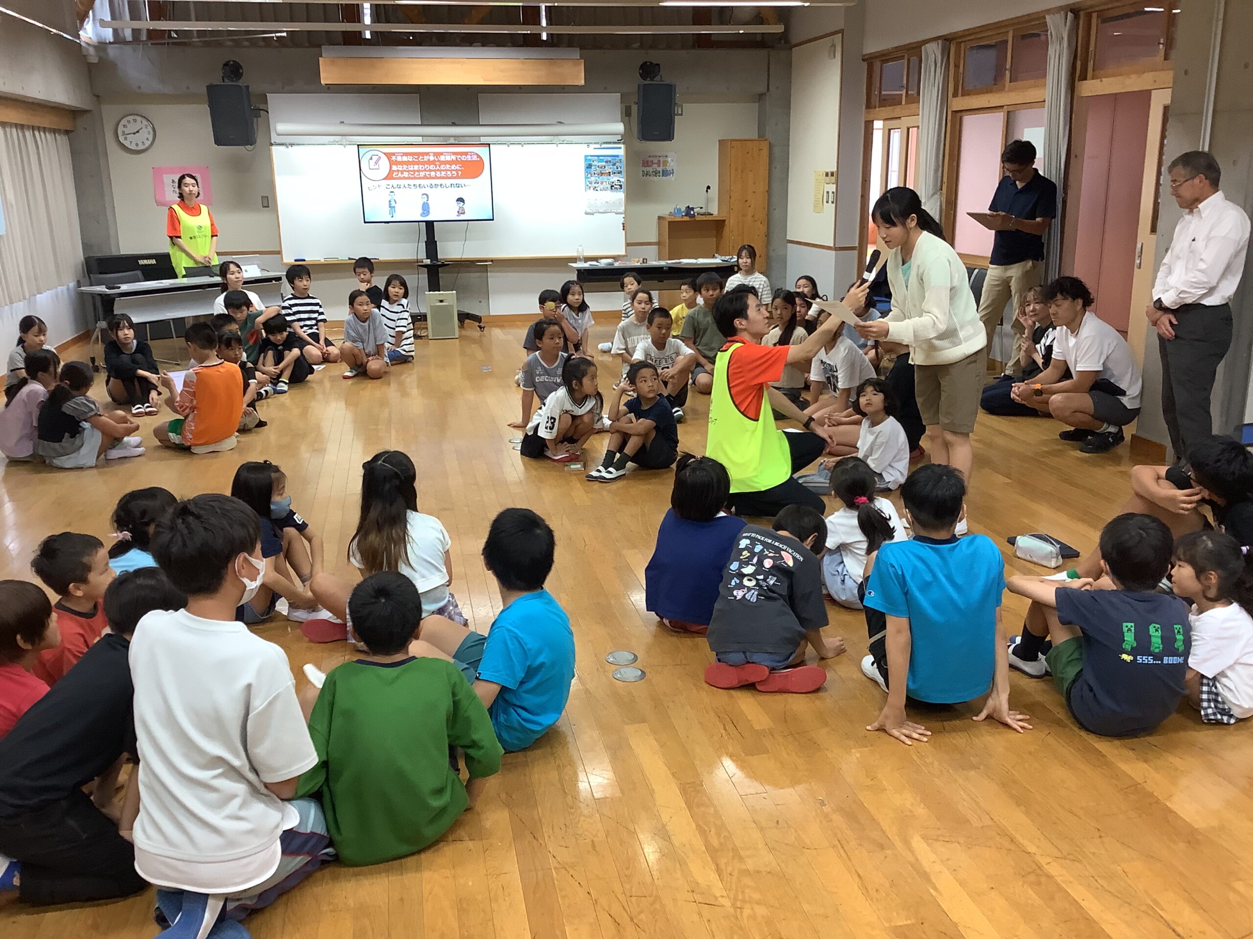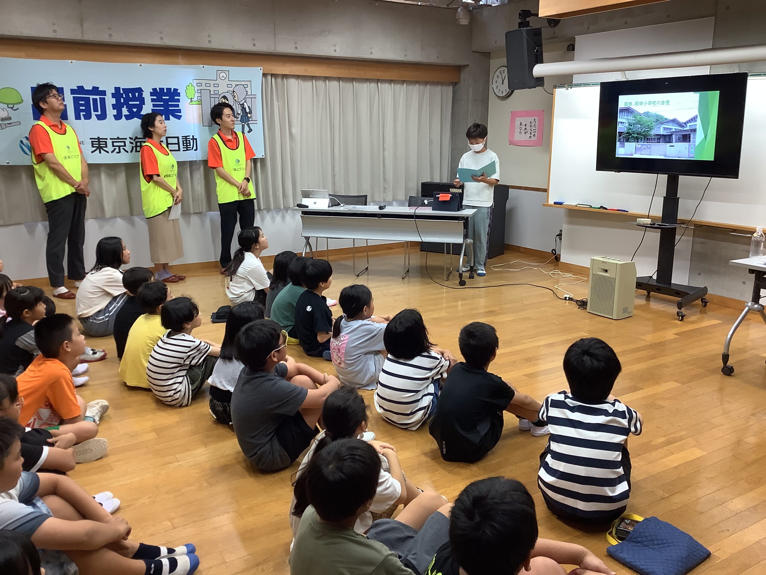 18日(木)には、防災イベントの事前指導として、講師を招いて防災出前授業を行いました。初めに、「市長と語ろう」に出た代表児童による殿田小学校ならではの学びについての発表を聞きました。