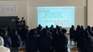 1年生は「防災学習」の中間発表、2年生は「職場体験」を終えて、3年生は「修学旅行」を終えてという内容でした。全校での発表の前に、各クラス...