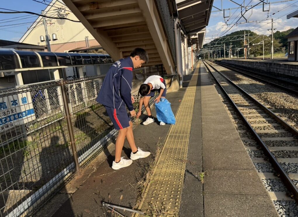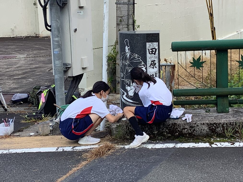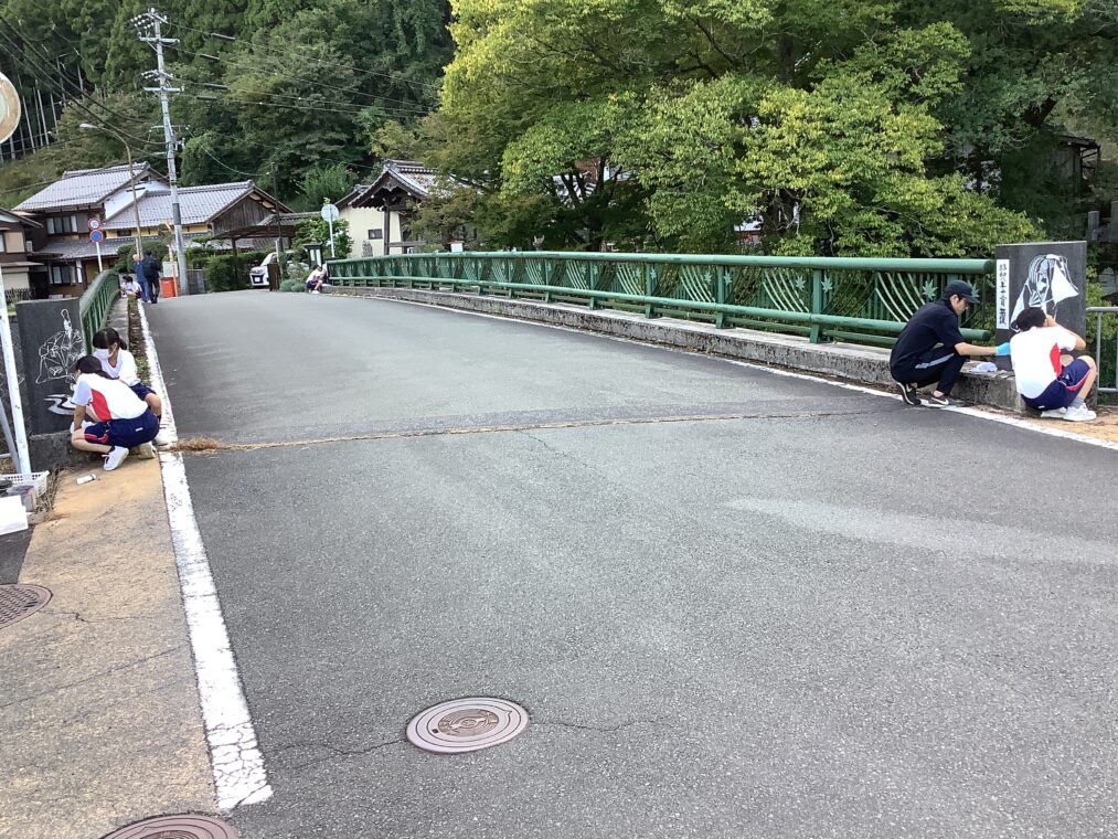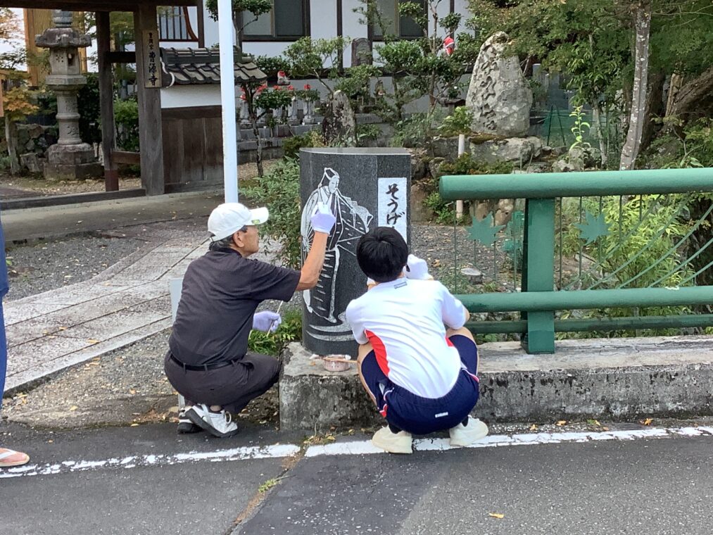 生徒は10グループに分かれ、町内の各施設やいつも通っている通学路の清掃を行いました。駅では、自動販売機の下にあるごみを見つけ、丁寧に撤去してくれる生徒もいました。また、今年は殿田にある曹源寺橋の欄干にある、梅若流能楽の図柄の色が薄くなってきたので、新たに色づけをしてほしいという地域の方からの依頼があり、中学生たちがそのお手伝いをさせていただきました。