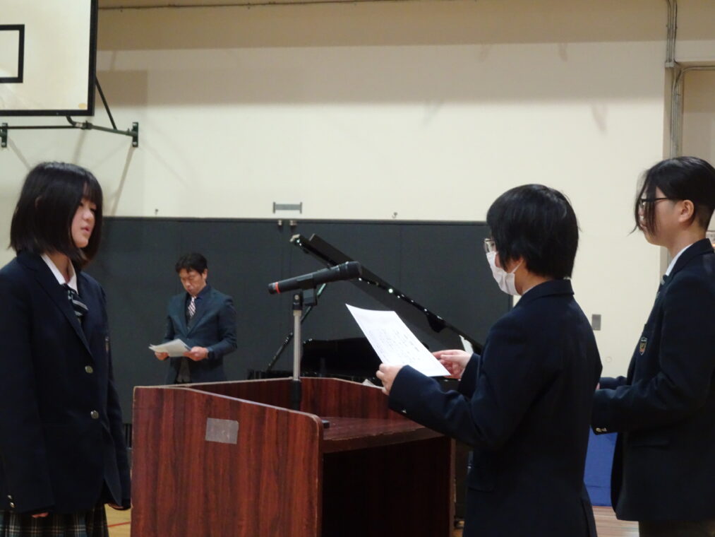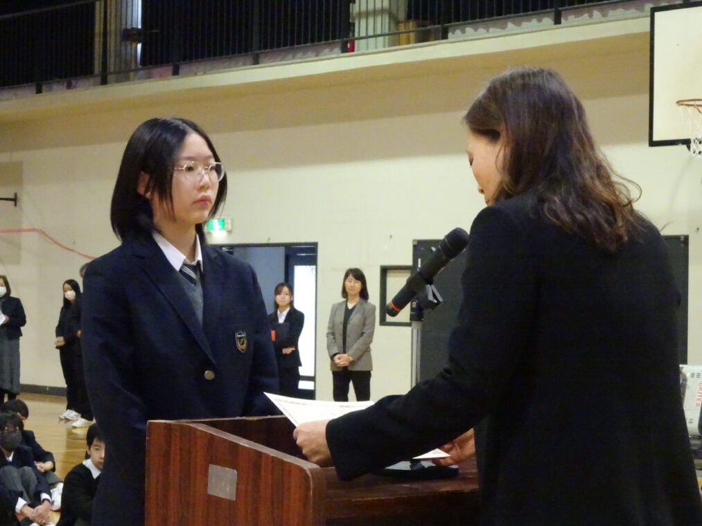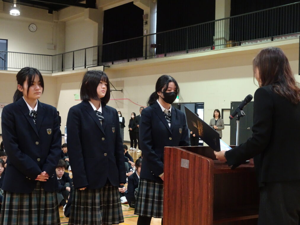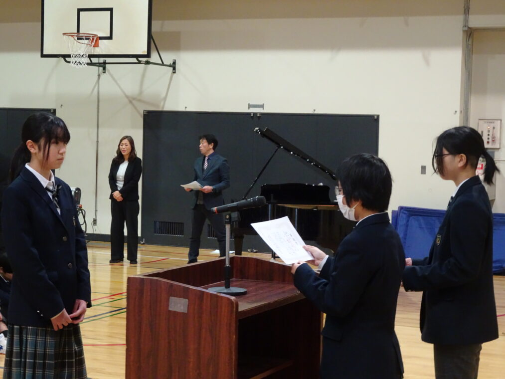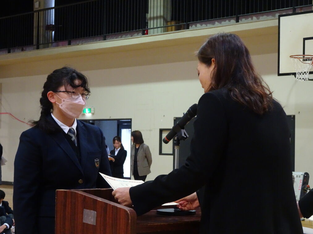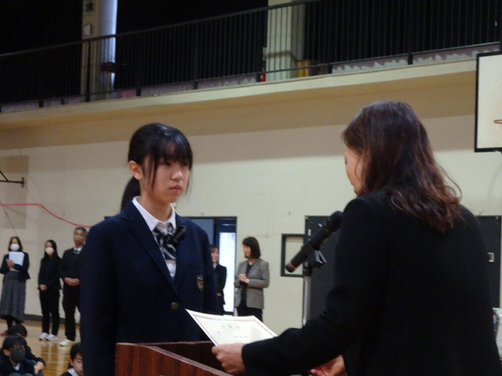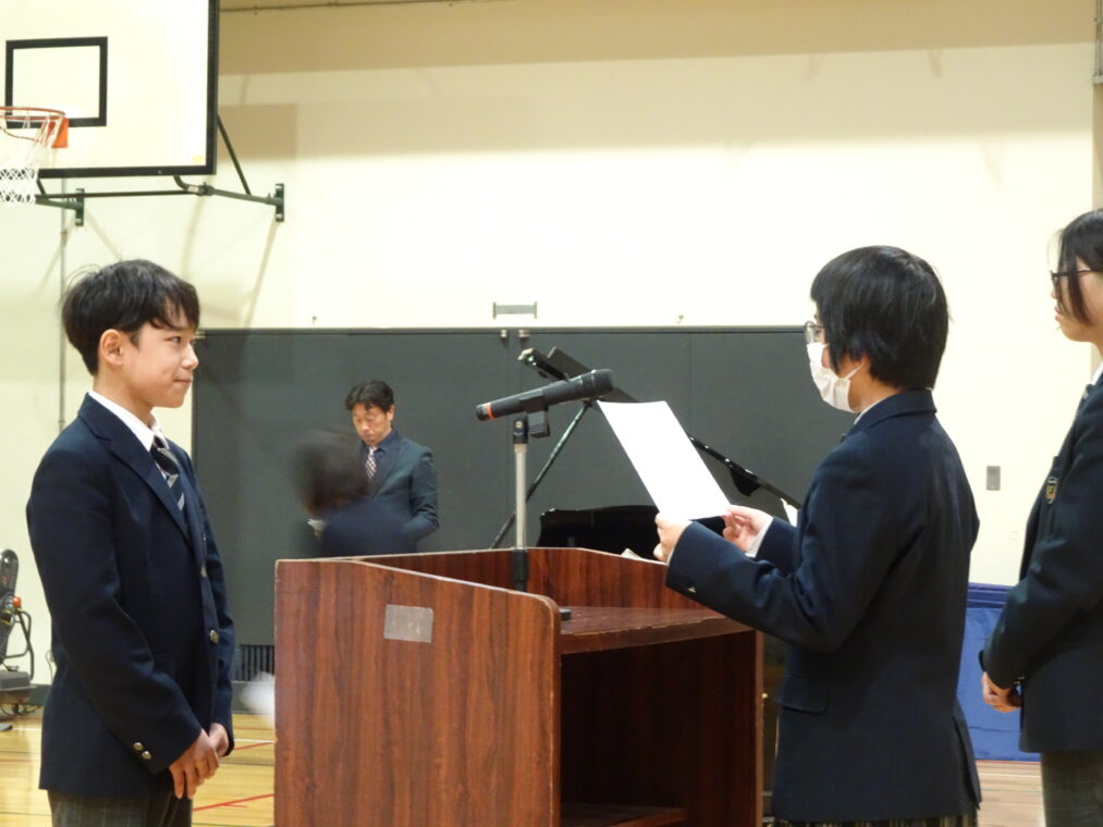 式典のあとで、生徒たちがそれぞれの分野で頑張ったことを讃える伝達表彰を行いました。生徒会図書部は2学期にたくさん本を読んだ生徒に、保健部は2学期の欠席が0だった生徒を表彰しました。数学検定結果や小論文グランプリ、交通安全CMコンテストで入選した科学工芸部の表彰も行い、生徒たちからは大きな拍手が送られました。