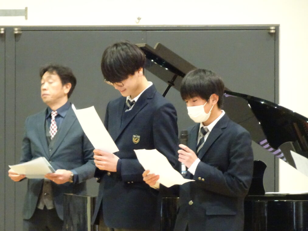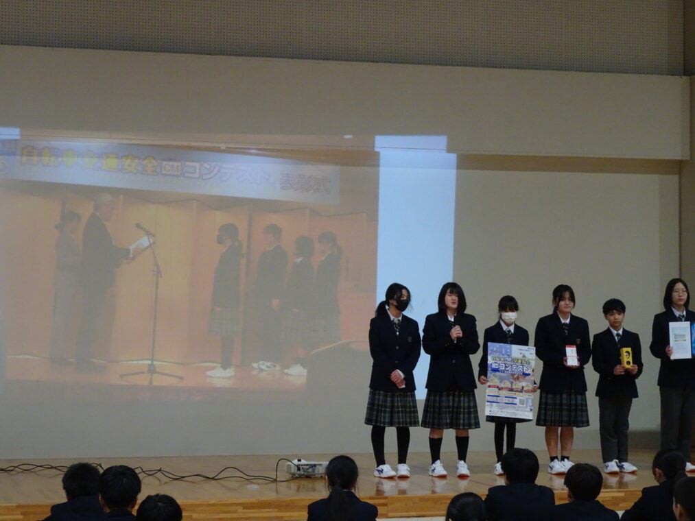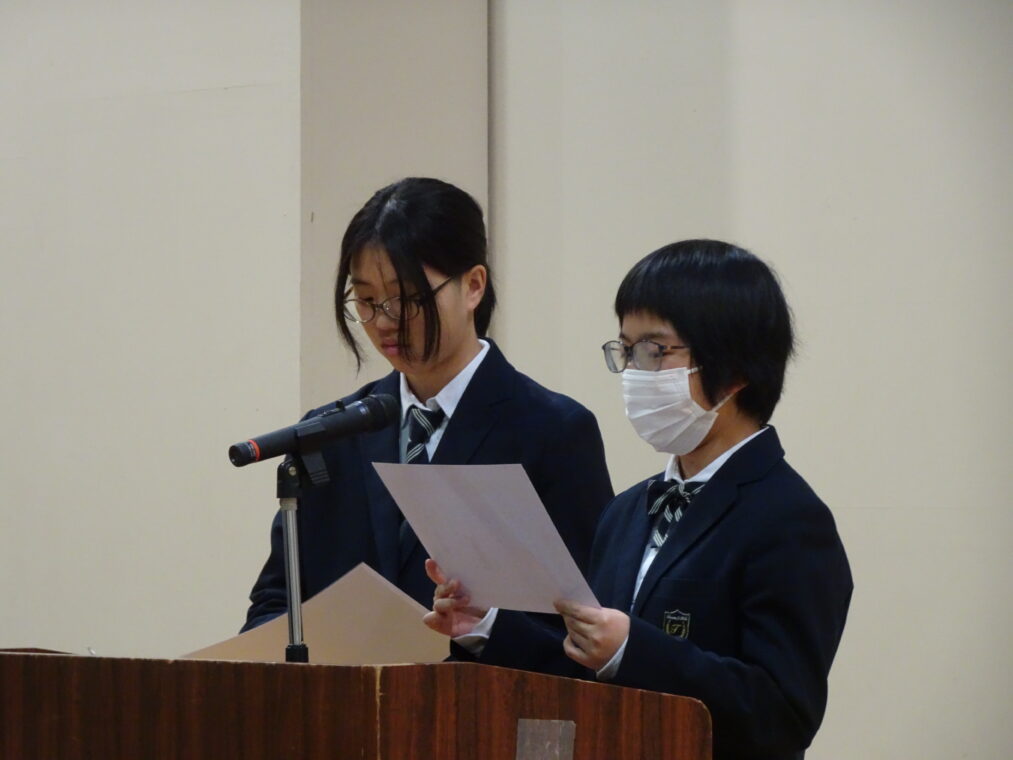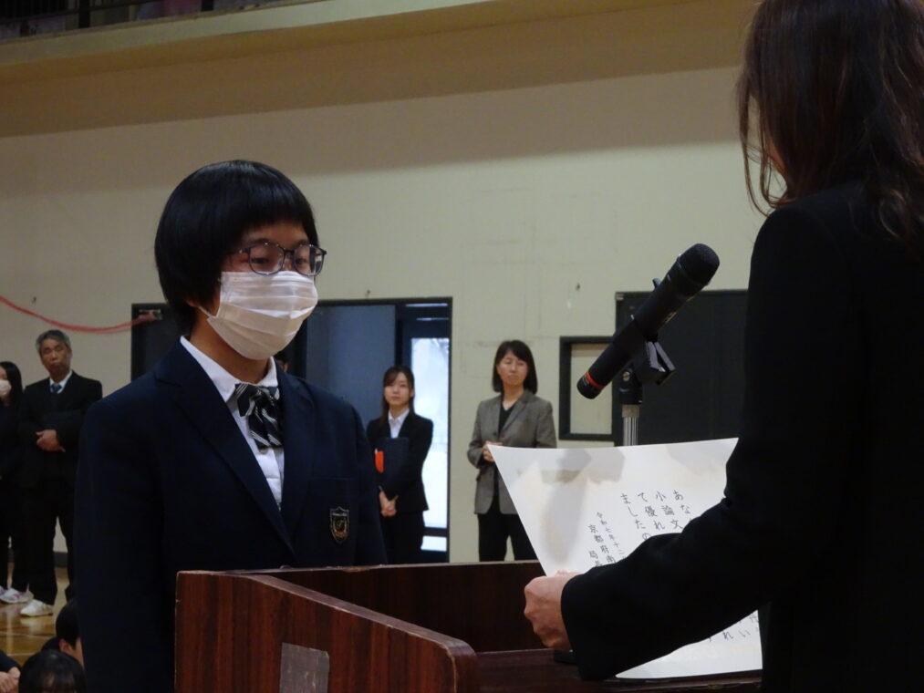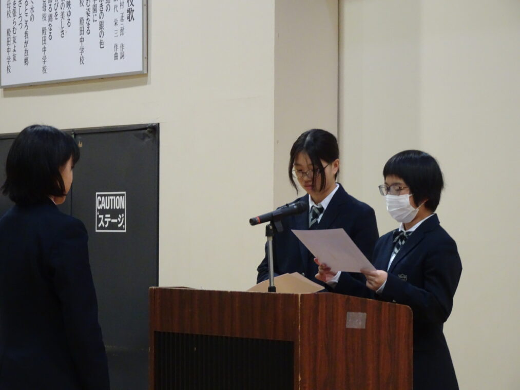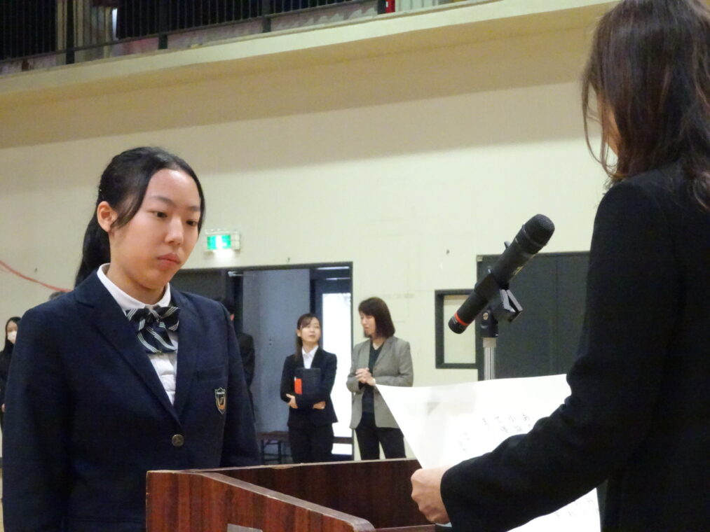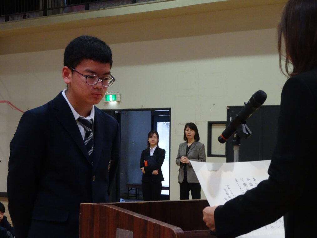 式典のあとで、生徒たちがそれぞれの分野で頑張ったことを讃える伝達表彰を行いました。生徒会図書部は2学期にたくさん本を読んだ生徒に、保健部は2学期の欠席が0だった生徒を表彰しました。数学検定結果や小論文グランプリ、交通安全CMコンテストで入選した科学工芸部の表彰も行い、生徒たちからは大きな拍手が送られました。
