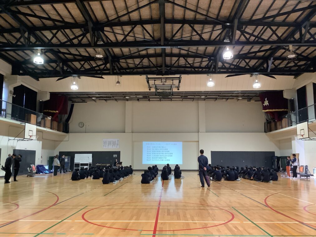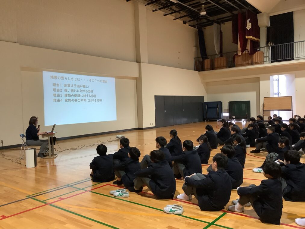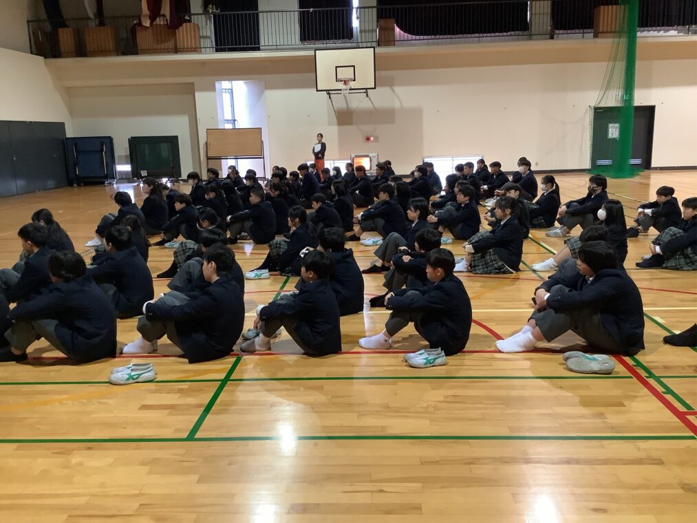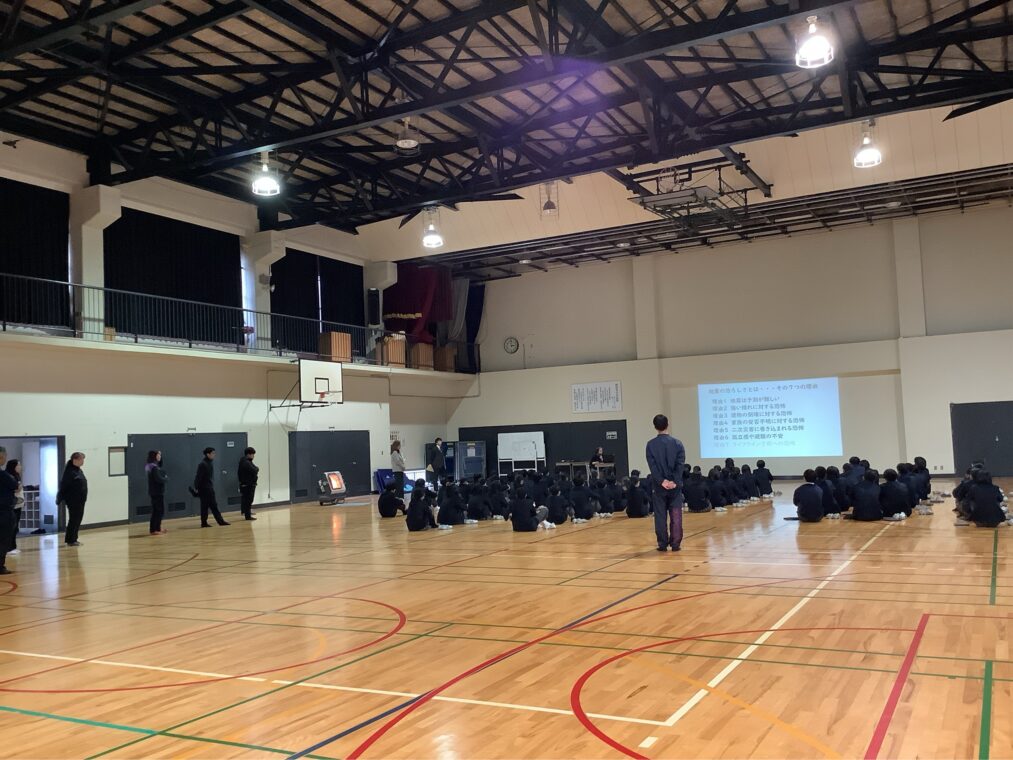 1月9日(金)、地震が発生した設定で避難訓練を行いました。校内の安全確認が終わった後で、避難指示が出て、生徒たちは体育館に避難しました。当日は、気温がかなり低く、事後の指導もあったので体育館に避難しましたが、実際に避難する時はどこが適切なのか、また、屋内に避難する時は何に気を付けるべきなのかについても話をしました。