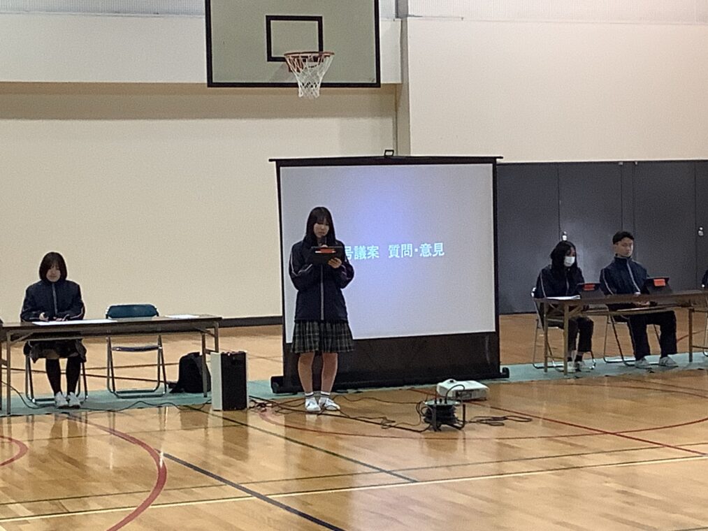 生徒会本部や各専門部の活動のまとめ議案については、事前に各教室で討議した上で、今日は全校生徒が出席する中で質疑応答を行いました。すべてのまとめ議案が承認され、いよいよバトンは次の生徒会に渡ることになります。