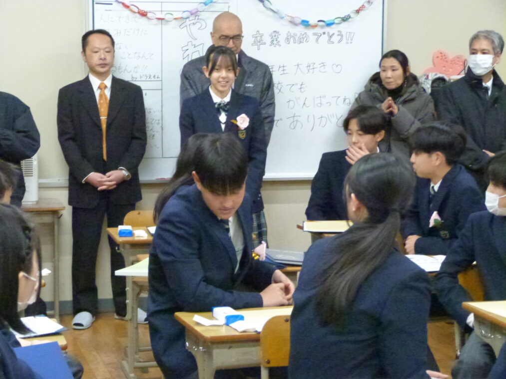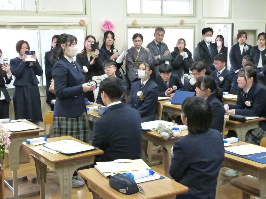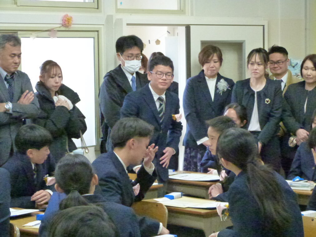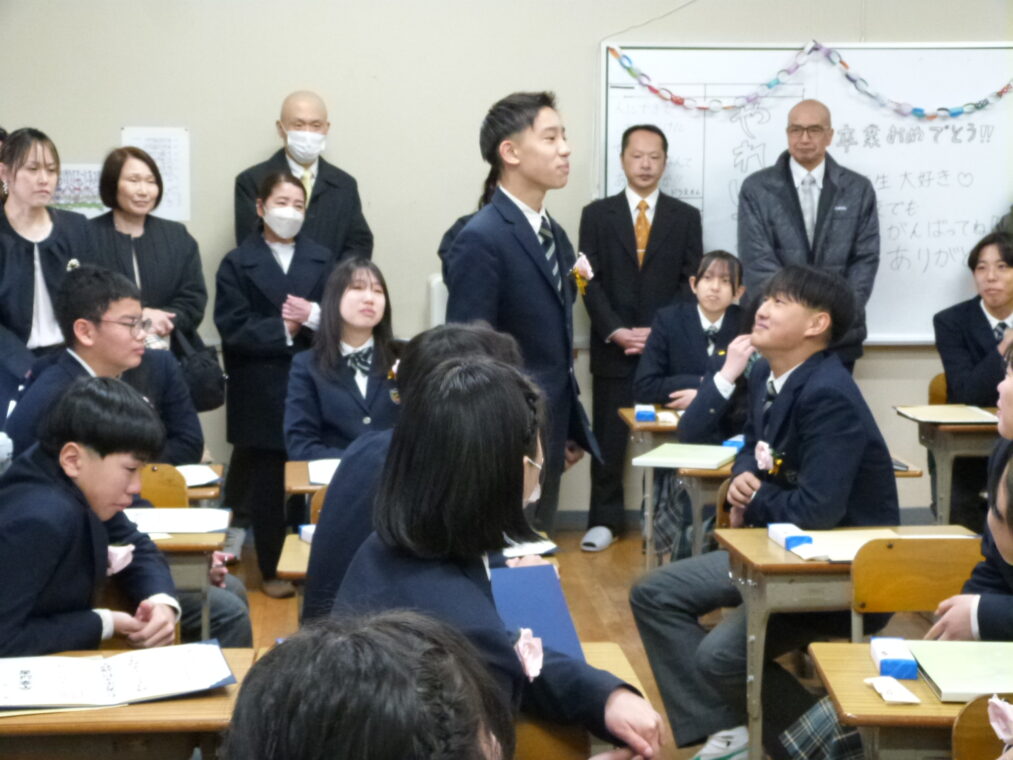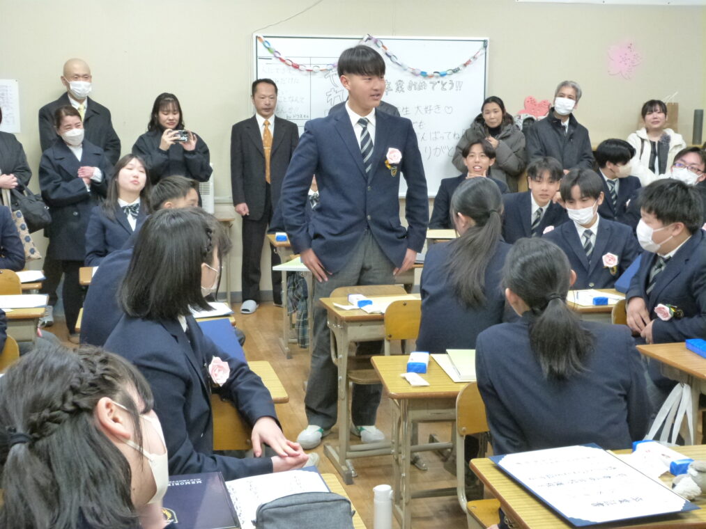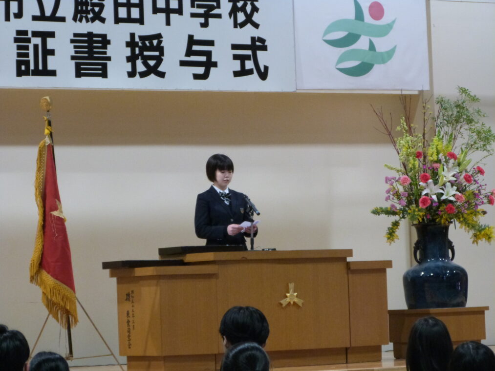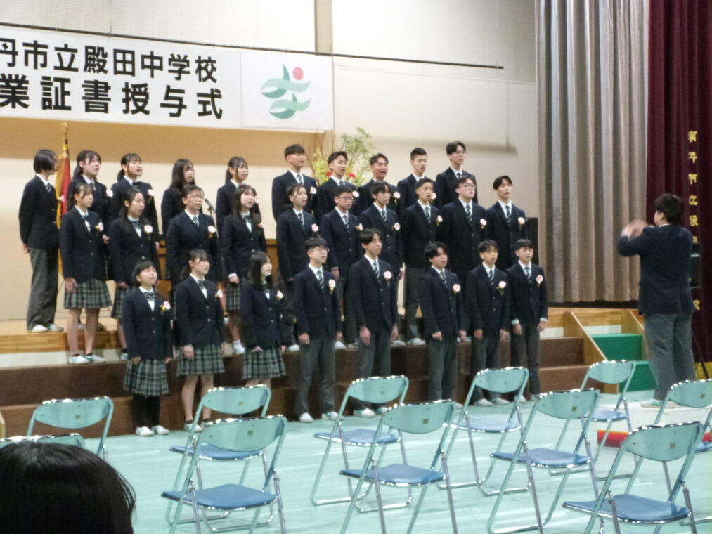 在校生代表の送辞には「これから先輩方の教えを思い出して成長していきたいと思います。そして、殿田中学校をますます活気のある学校にしていけるよう精進していきます。今まで私たちを支えてくださり、ありがとうございました。」という感謝と決意のメッセージが込められていました。また、卒業生代表の答辞は、3年生らしい「気づき」にあふれる内容でした。一つひとつの経験や、仲間との触れ合いや教職員からのメッセージから多くのことを学び、それを力にしてきたことと、家族をはじめ関わってくれたすべての人たちへの感謝にあふれるものでした。答辞から式歌、そして式後の学活では、涙が自然にあふれてきて、卒業生がどれほど素敵な生活を仲間や先生とともに過ごしてきたのかが伝わってきました。これまで本当にありがとう!そして、これからもそれぞれの道で頑張ってくれることを、心から祈っています。