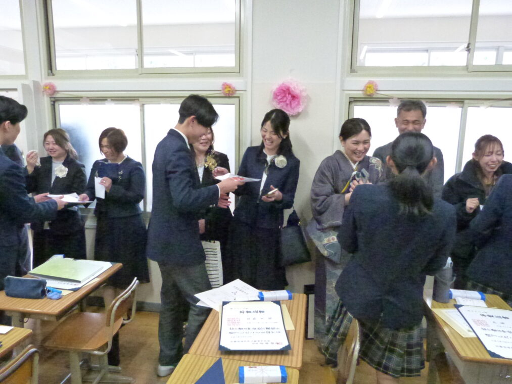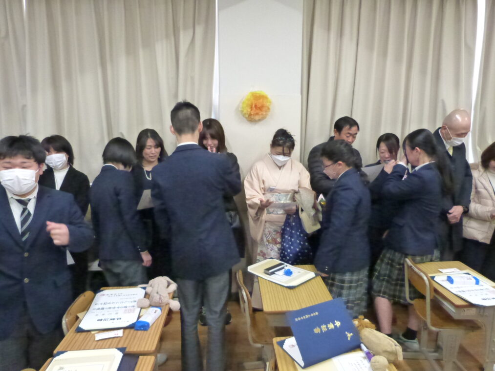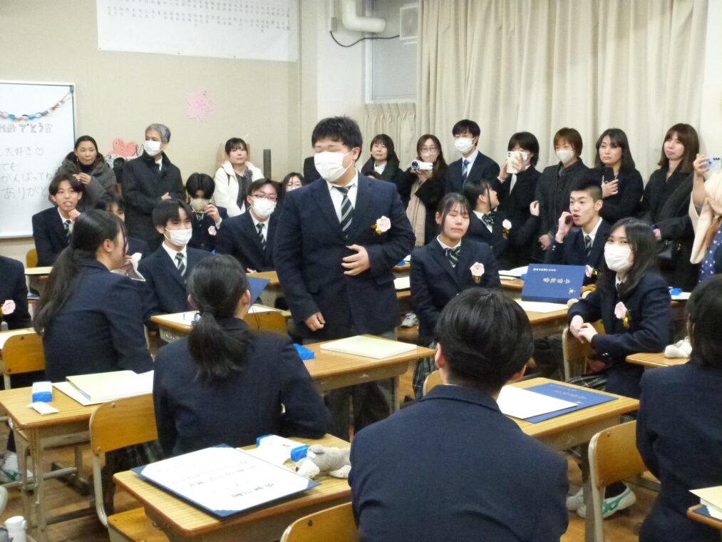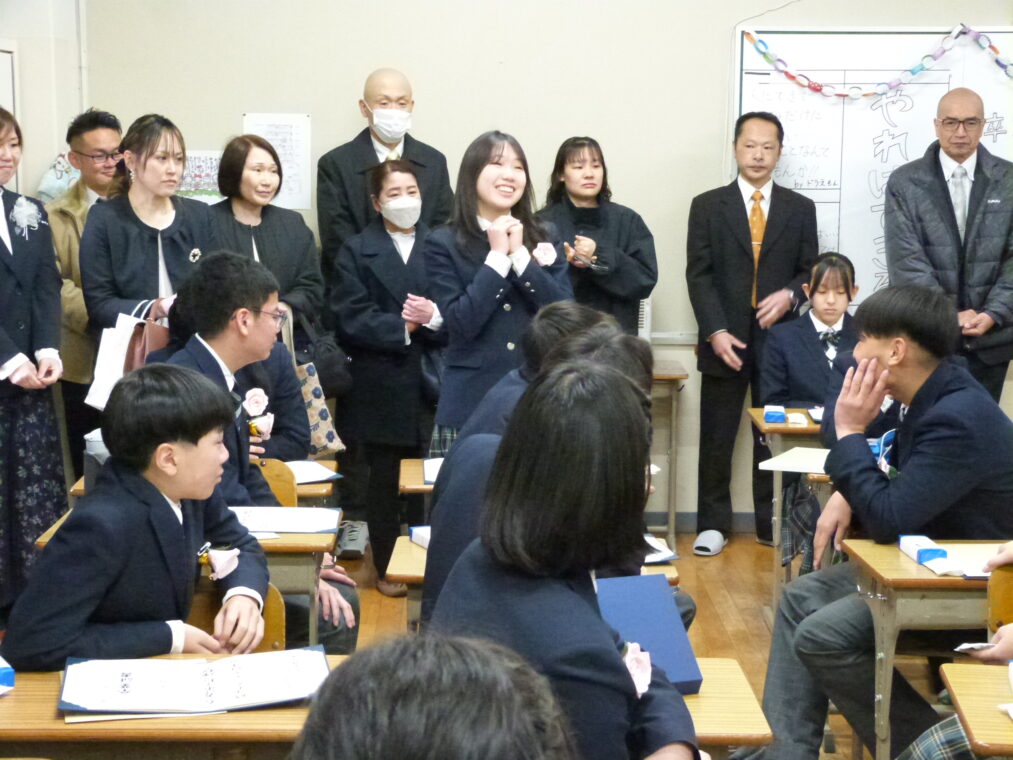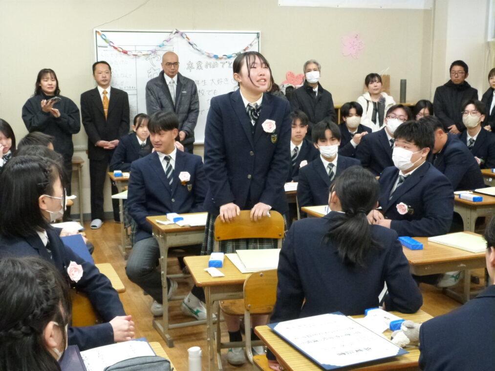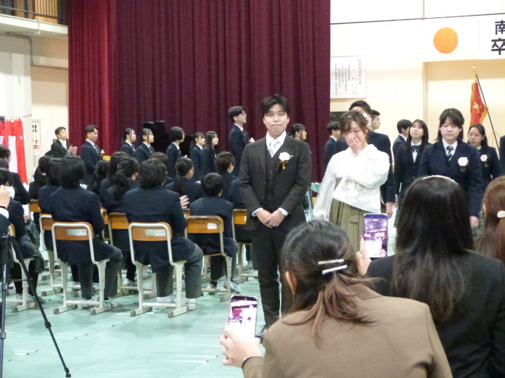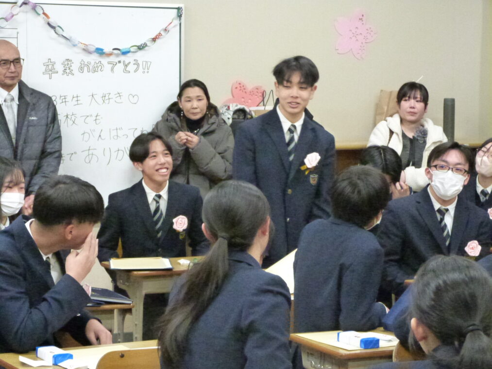 在校生代表の送辞には「これから先輩方の教えを思い出して成長していきたいと思います。そして、殿田中学校をますます活気のある学校にしていけるよう精進していきます。今まで私たちを支えてくださり、ありがとうございました。」という感謝と決意のメッセージが込められていました。また、卒業生代表の答辞は、3年生らしい「気づき」にあふれる内容でした。一つひとつの経験や、仲間との触れ合いや教職員からのメッセージから多くのことを学び、それを力にしてきたことと、家族をはじめ関わってくれたすべての人たちへの感謝にあふれるものでした。答辞から式歌、そして式後の学活では、涙が自然にあふれてきて、卒業生がどれほど素敵な生活を仲間や先生とともに過ごしてきたのかが伝わってきました。これまで本当にありがとう!そして、これからもそれぞれの道で頑張ってくれることを、心から祈っています。