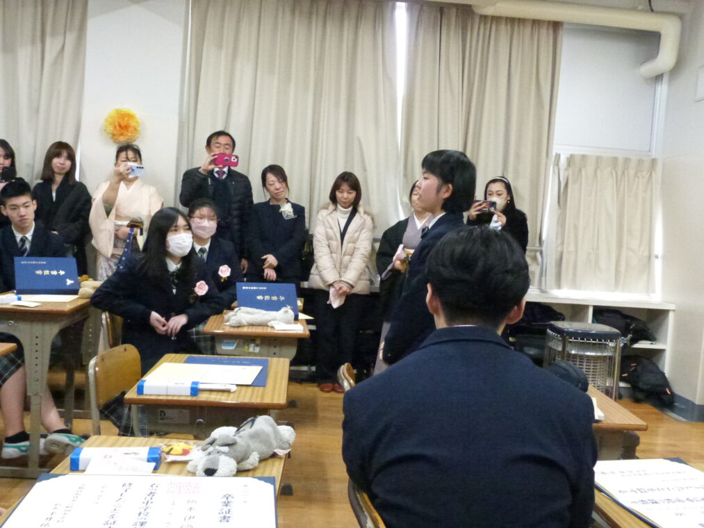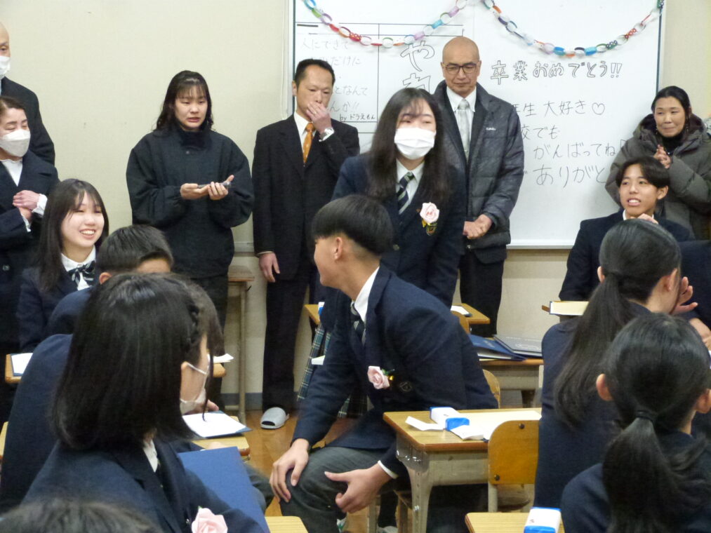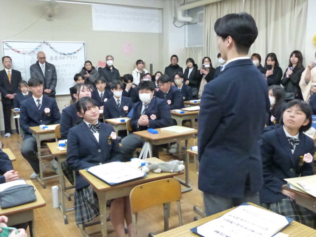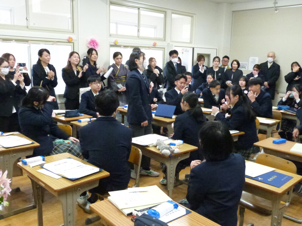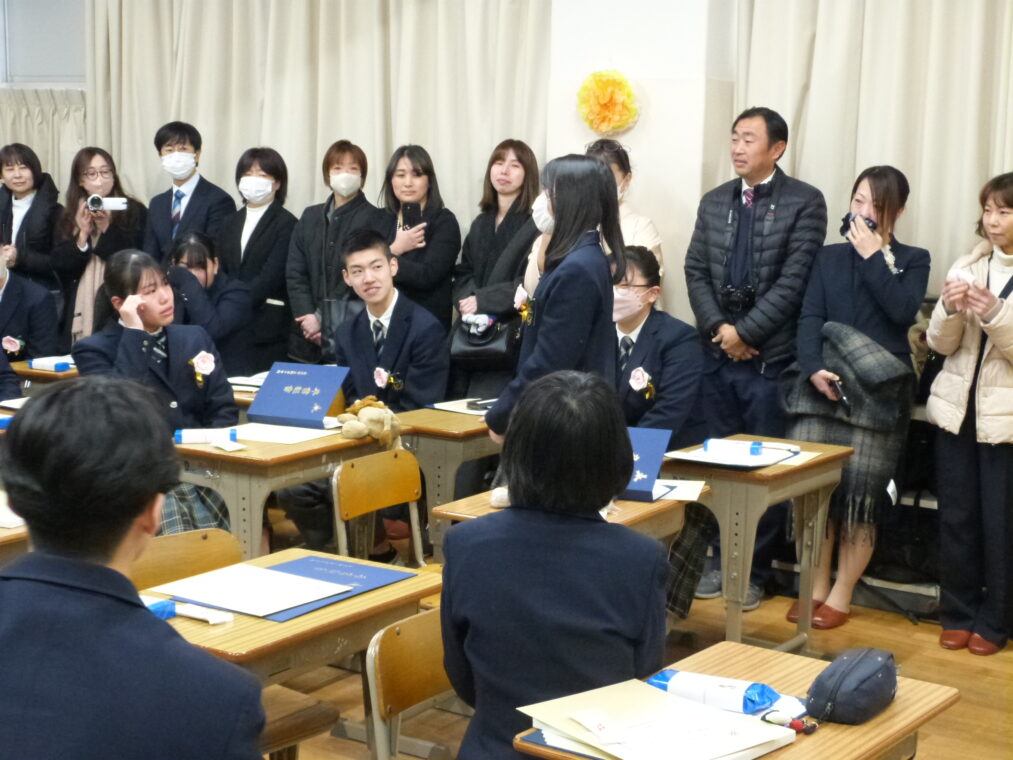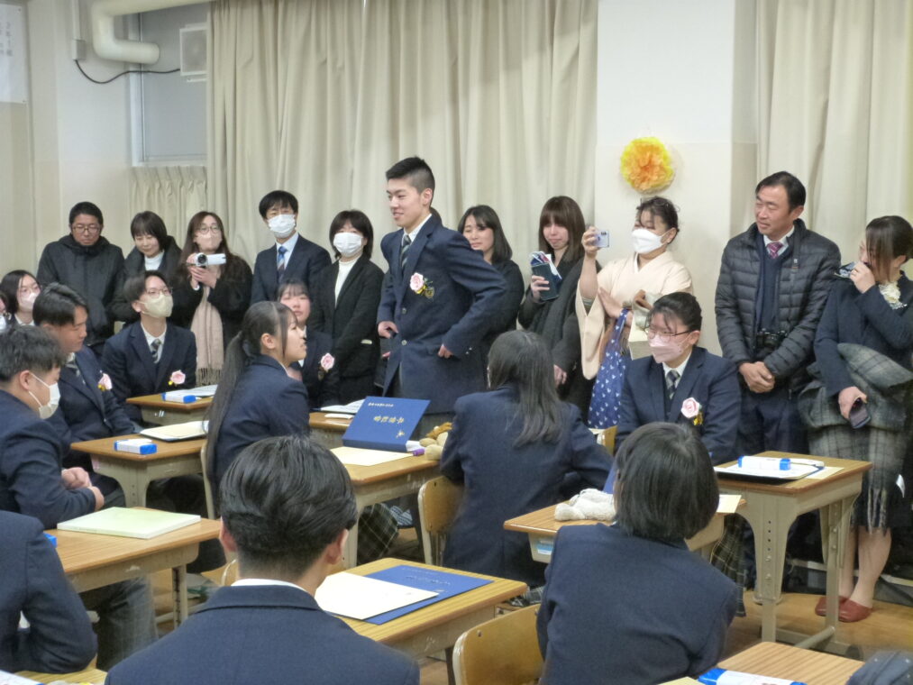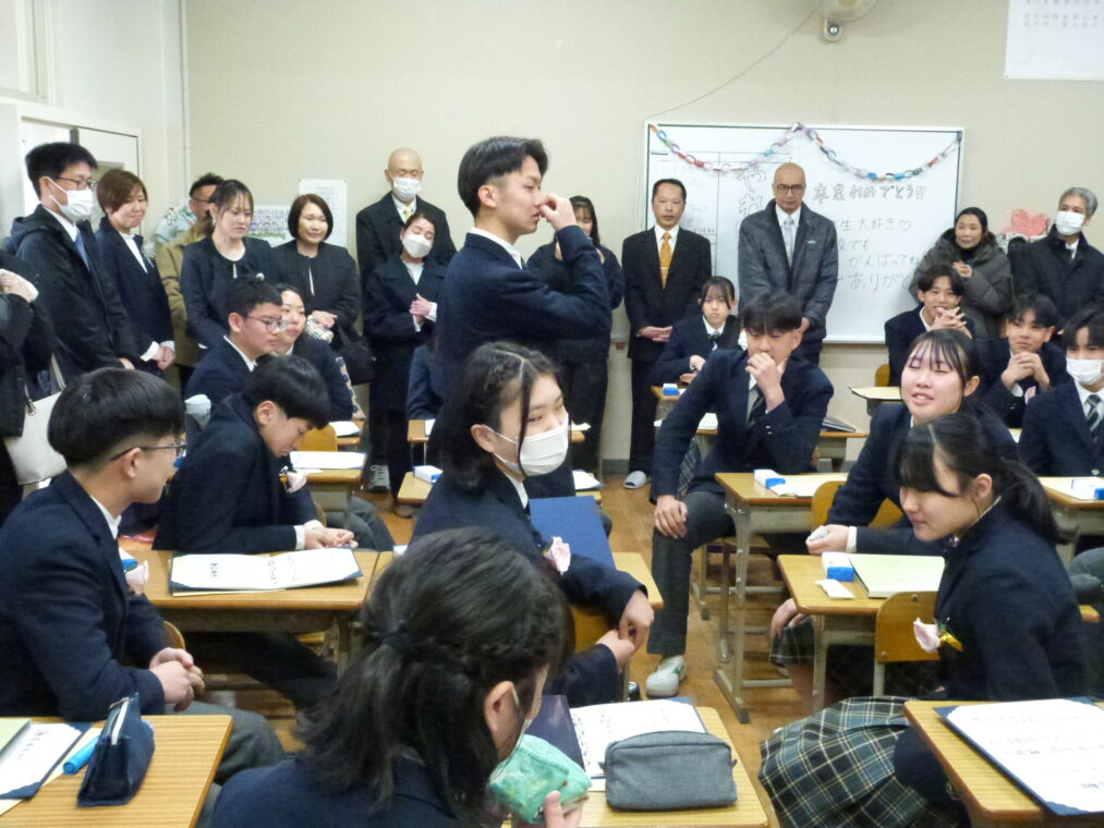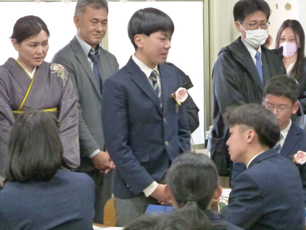 在校生代表の送辞には「これから先輩方の教えを思い出して成長していきたいと思います。そして、殿田中学校をますます活気のある学校にしていけるよう精進していきます。今まで私たちを支えてくださり、ありがとうございました。」という感謝と決意のメッセージが込められていました。また、卒業生代表の答辞は、3年生らしい「気づき」にあふれる内容でした。一つひとつの経験や、仲間との触れ合いや教職員からのメッセージから多くのことを学び、それを力にしてきたことと、家族をはじめ関わってくれたすべての人たちへの感謝にあふれるものでした。答辞から式歌、そして式後の学活では、涙が自然にあふれてきて、卒業生がどれほど素敵な生活を仲間や先生とともに過ごしてきたのかが伝わってきました。これまで本当にありがとう!そして、これからもそれぞれの道で頑張ってくれることを、心から祈っています。