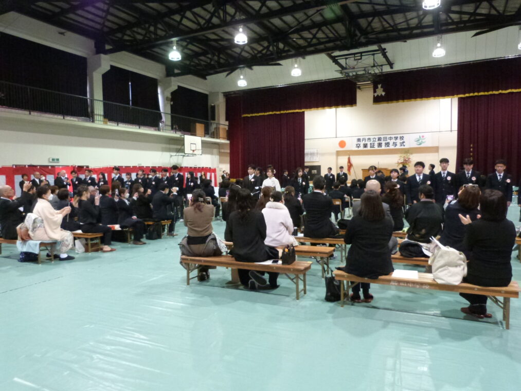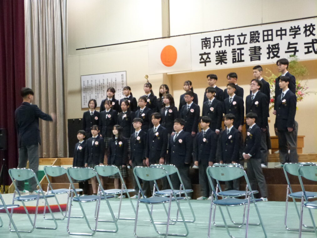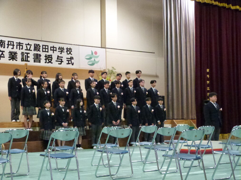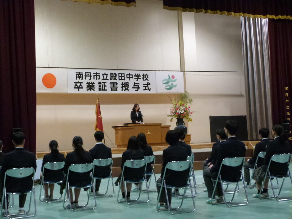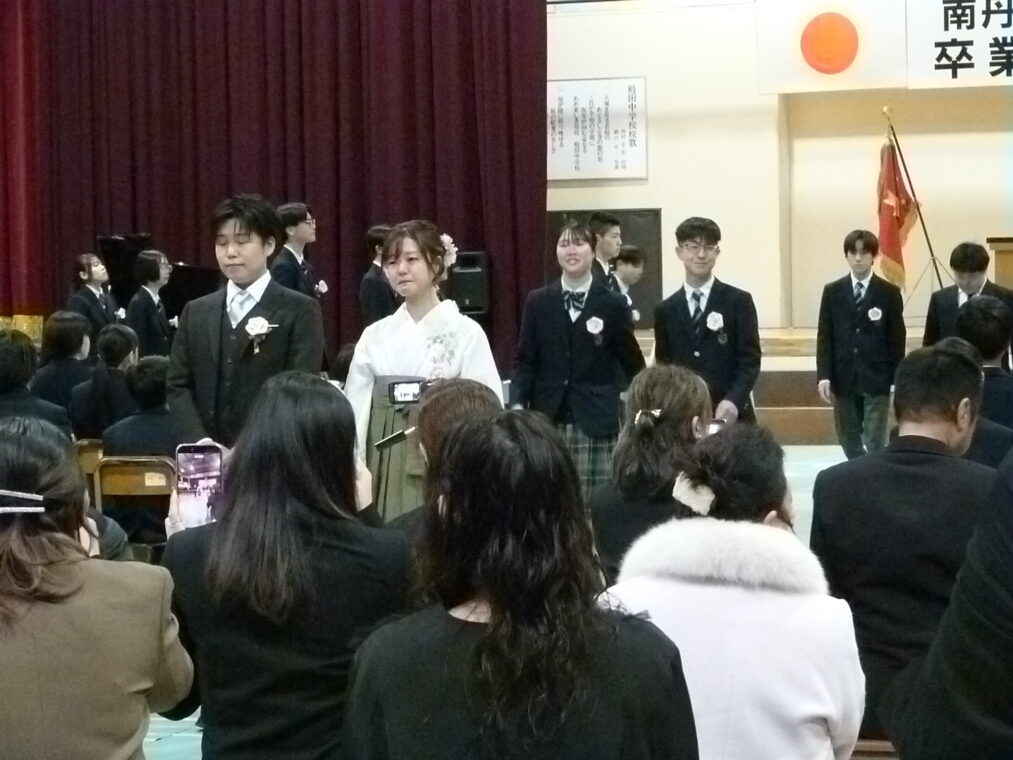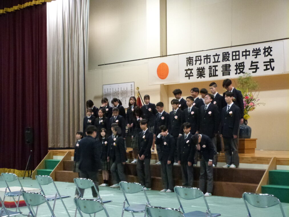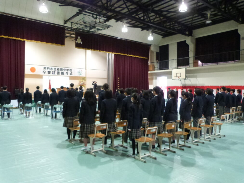 3月13日(金)、第77回殿田中学校卒業証書授与式を行い、31名の3年生が殿田中学校を巣立っていきました。ご来賓の方々をはじめ、多くの保護者の方々に見守られながら厳かな中にも温かさを感じる素敵い式典となりました。