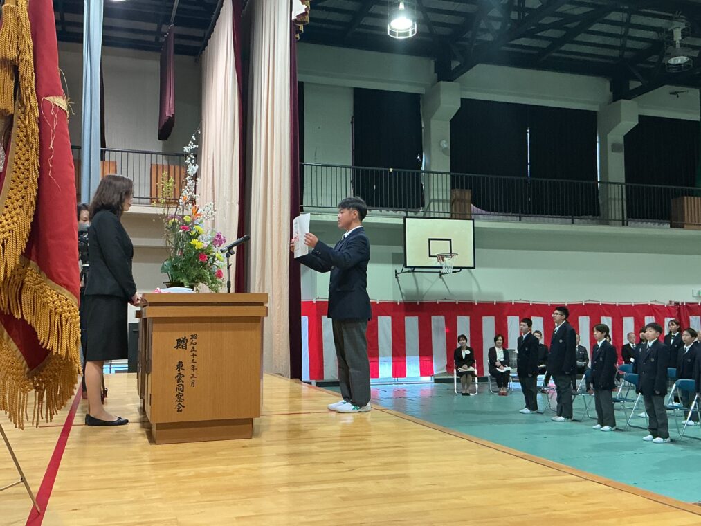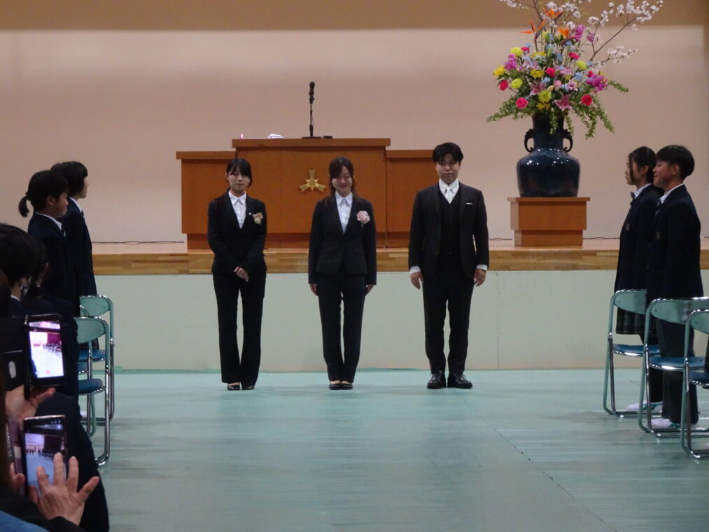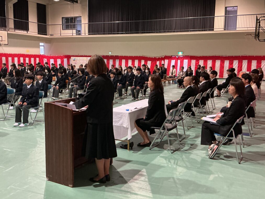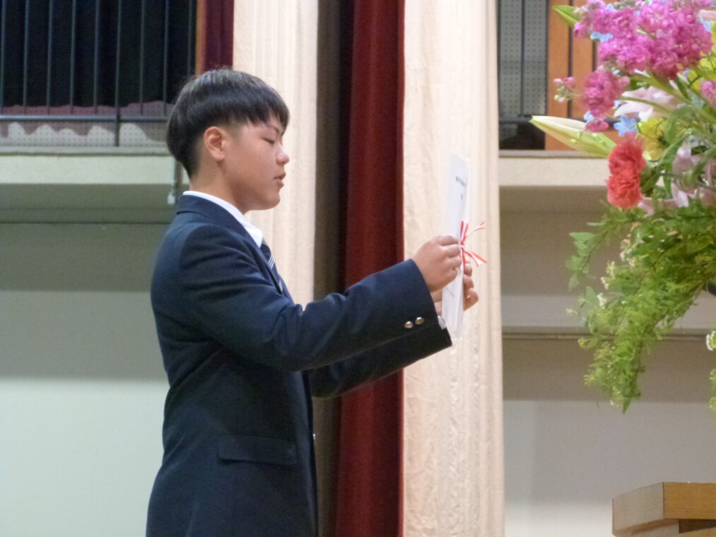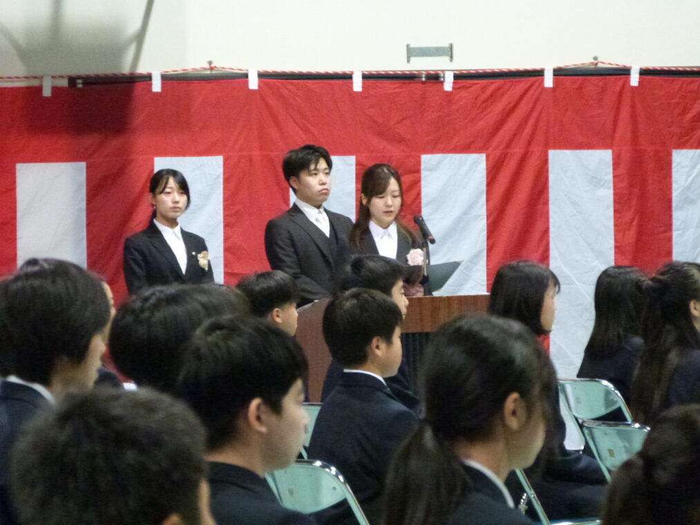 2・3年生は前日準備の段階から、良い入学式にしたいと会場や教室の準備を一生懸命行い、挑戦することを大切にしてほしいと、代表の生徒が歓迎の言葉の中で述べました。入学生代表の誓いの言葉の中では、一人一人が目標を持ち、お互いを高め合いながら成長していきたいという決意が述べられていました。