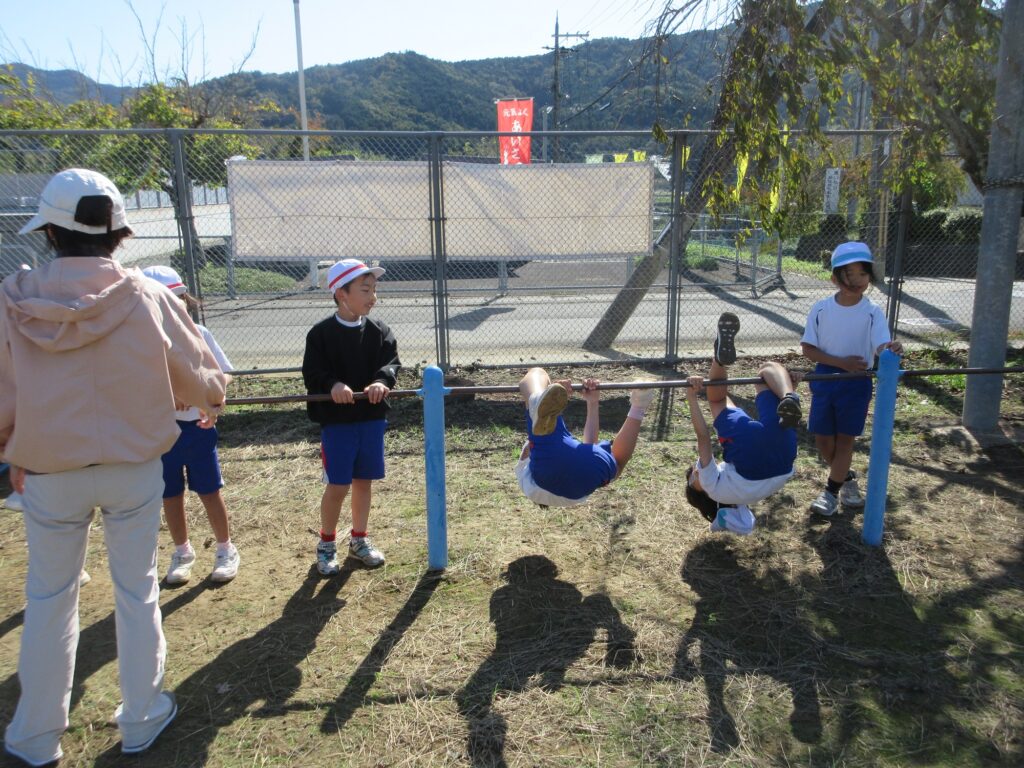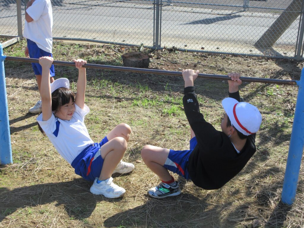 小1、小2は逆上がりに挑戦しています。友達と教えあい、励まし合いながら練習しています。
