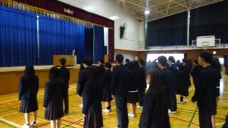 日誌 3学期始業式 誇りある桃映中学校を創っていきましょう! 1月8日(木)今日から3学期が始まり、体育館で全校生徒がそろって始業式を行いました。校長先生の式辞の中で各学年にこの3学期で付けてほしい力を示してもらいました。3年生は責任学年として自分の力... 2026.01.08 日誌