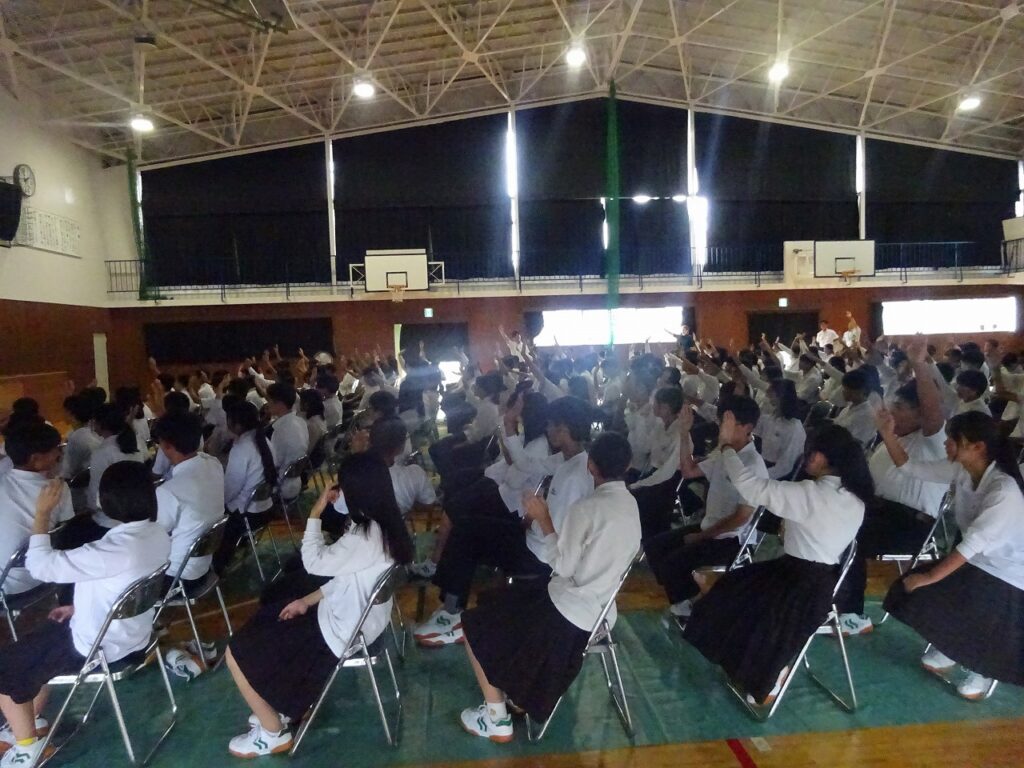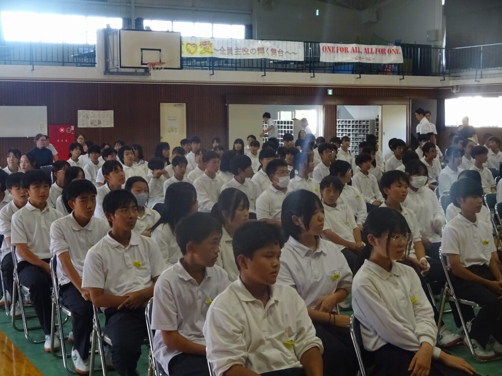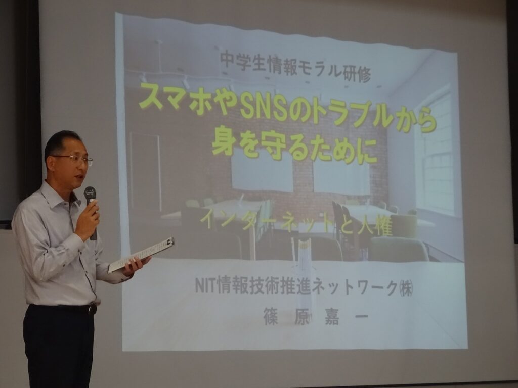 10月7日(火)5時間目、6時間目を使って全校生徒を対象に体育館にて「ネットトラブルストップ講座」を実施しました。講師としてNIT情報技術推進ネットワーク株式会社の篠原嘉一様に来ていただき「スマホやSNSのトラブルから身を守るために」という演題で講演していただきました。