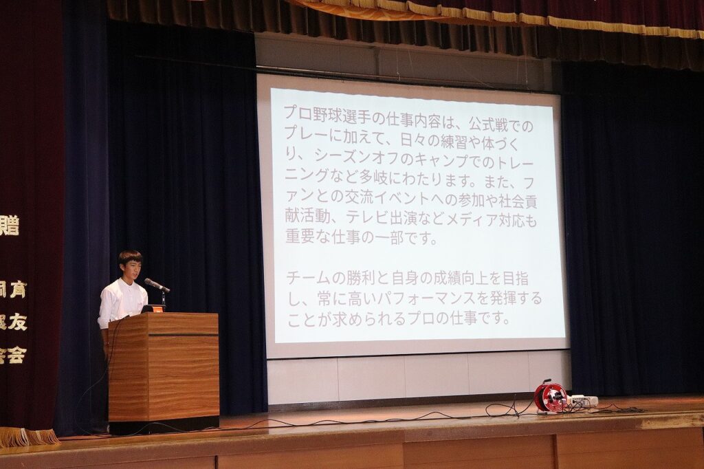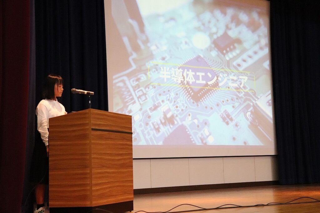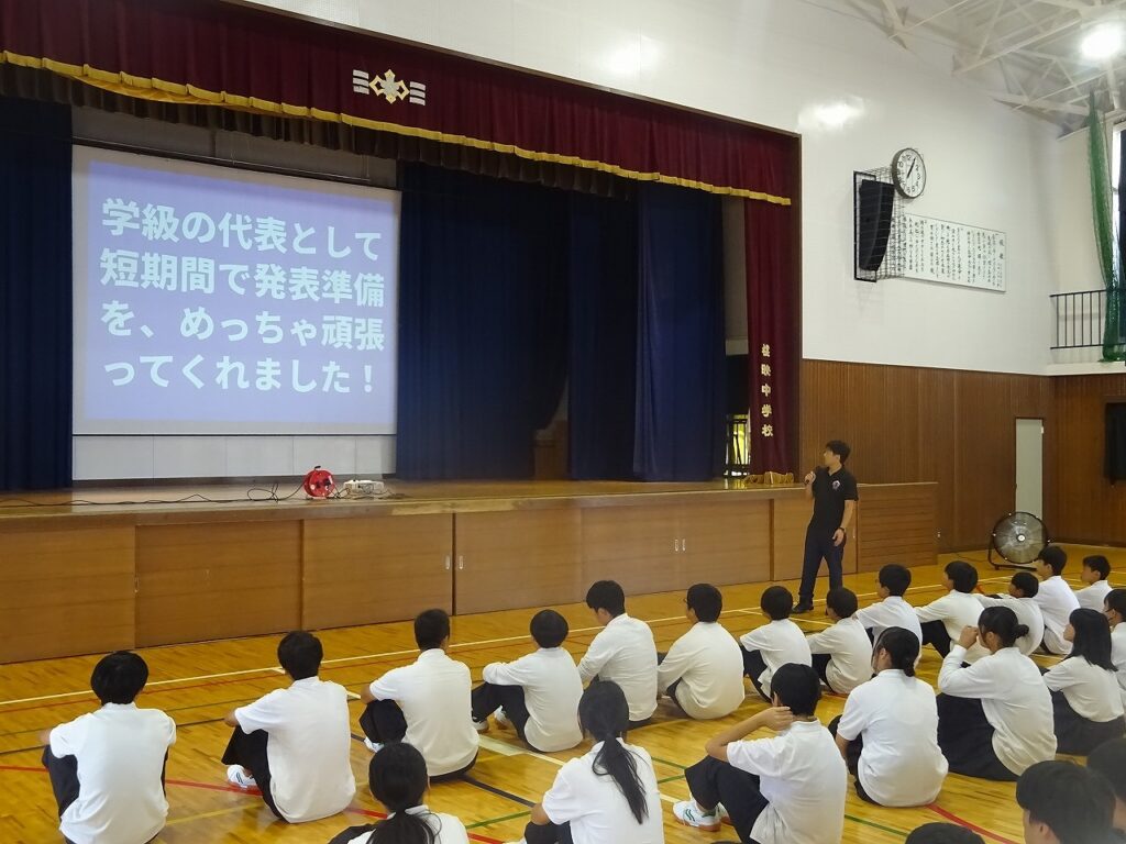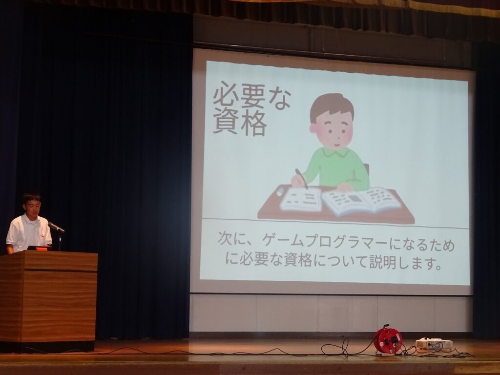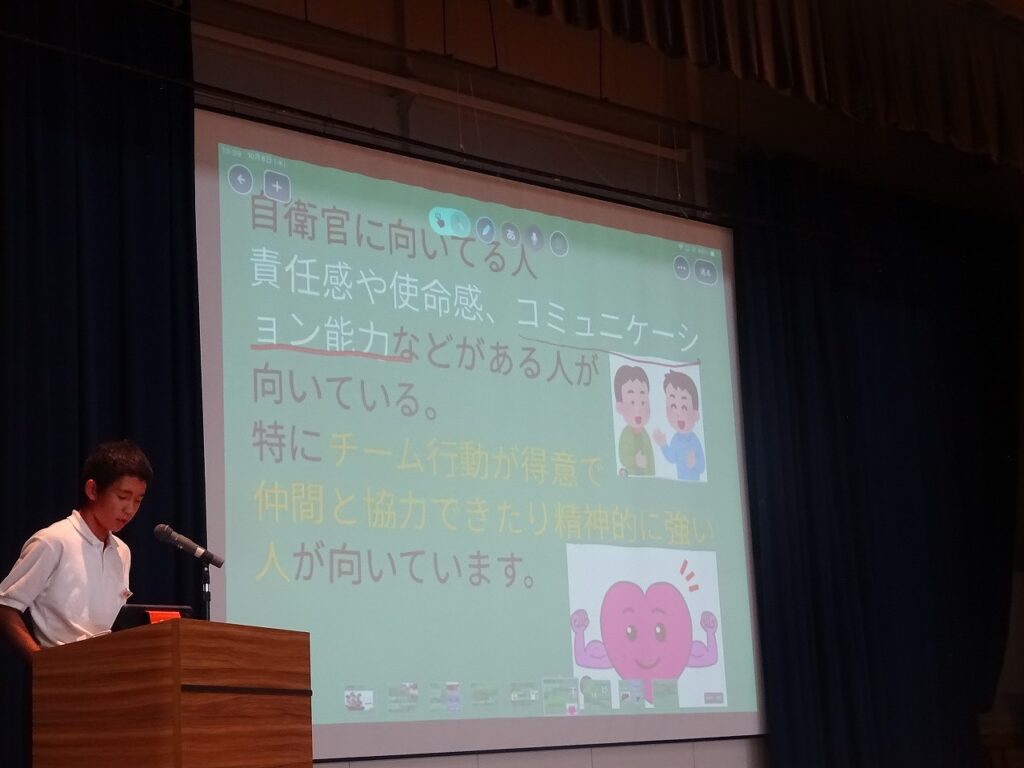 10月8日(水)2年生が興味のある職業について各自で調べ、代表者10名が体育館で2年生全体の前で発表しました。以前に学級で発表したものよりもレベルアップした発表を行ってくれました。発表してくれた職業は「自衛官」「パティシエール」「ゲームプログラマー」「プロ野球選手」「半導体エンジニア」「アプリケーションプログラマー」「Google社員」「漫画家」「イラストレーター」と聞いたことがある職業から初めて知る職業まで様々な職業を紹介されていました。多くの職業に求められるスキルとして「コミュニケーション能力」「向上心」「問題解決能力」などが挙げられていました。これからの中学校生活で更に身につけていきたいですね。