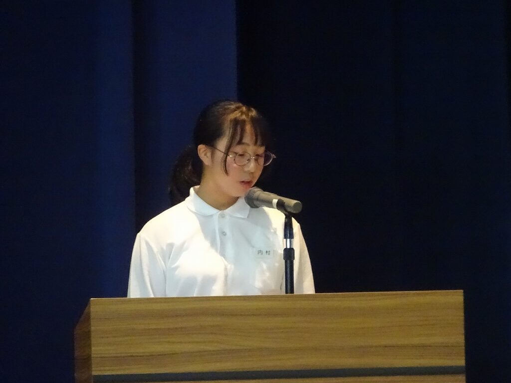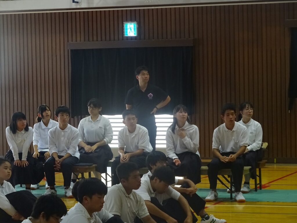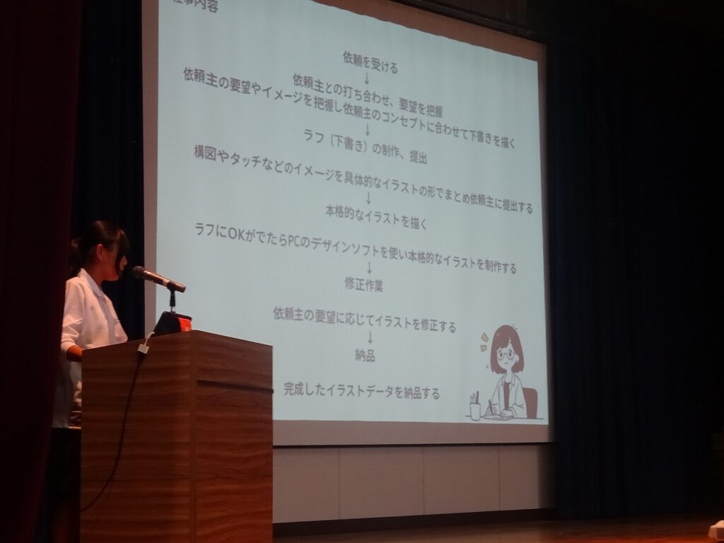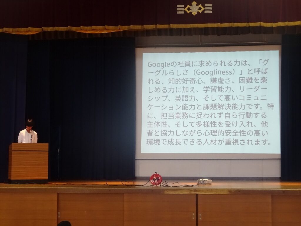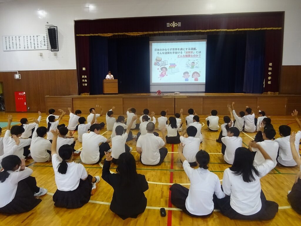 10月8日(水)2年生が興味のある職業について各自で調べ、代表者10名が体育館で2年生全体の前で発表しました。以前に学級で発表したものよりもレベルアップした発表を行ってくれました。発表してくれた職業は「自衛官」「パティシエール」「ゲームプログラマー」「プロ野球選手」「半導体エンジニア」「アプリケーションプログラマー」「Google社員」「漫画家」「イラストレーター」と聞いたことがある職業から初めて知る職業まで様々な職業を紹介されていました。多くの職業に求められるスキルとして「コミュニケーション能力」「向上心」「問題解決能力」などが挙げられていました。これからの中学校生活で更に身につけていきたいですね。