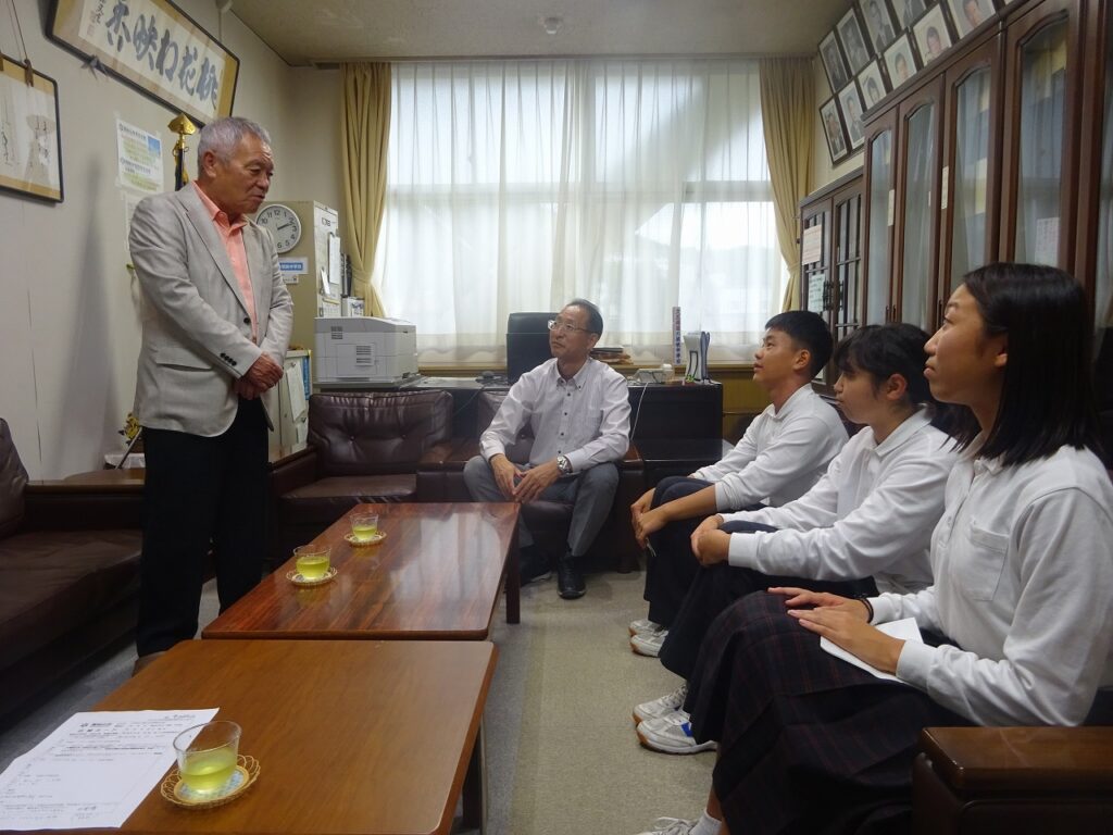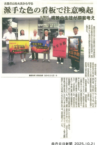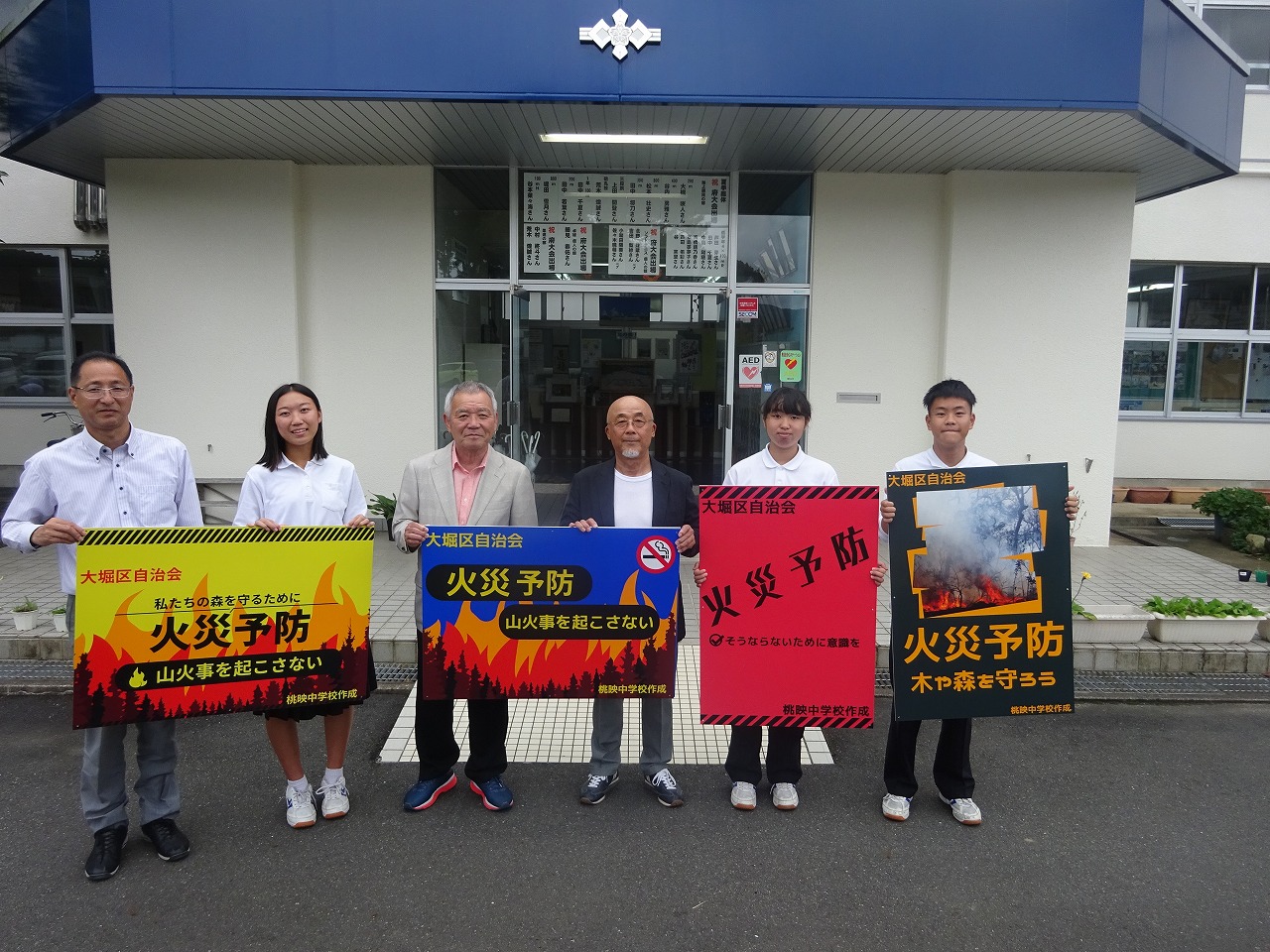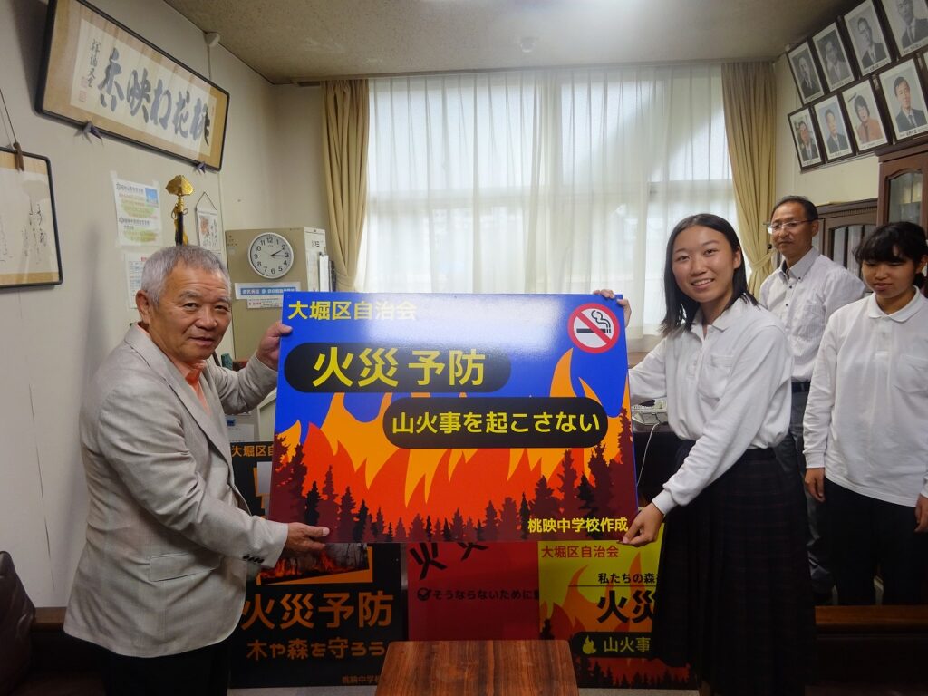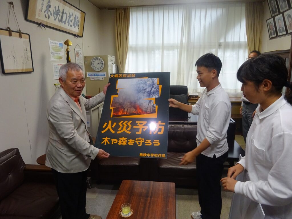 大堀区からの依頼で、毎年植栽活動でお世話になっている山林の火災予防のポスターを作成し、渡すことができました。生徒会役員、各学年の学級委員会がポスター案を作成し、ポスター案に選ばれた3人が代表して贈呈式に参加しました。大堀区の自治会長様からも「桃映中学校に依頼して立派なポスターをつくっていただいた。大堀区の山の入口に設置させてもらい、長く使わせていただきたい。」と話をされていました。10月21日付の両丹日日新聞にも大きく掲載されました。この大堀区と学校の火災予防の取組を知った福知山消防署長から、感謝を伝えていただくようなこともありました。今年度も植栽活動をさせてもらう予定です。よろしくお願いします。