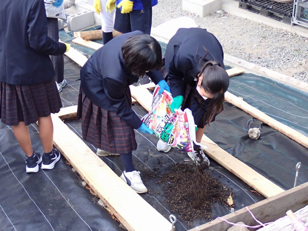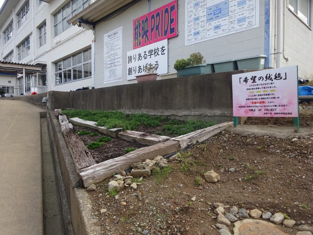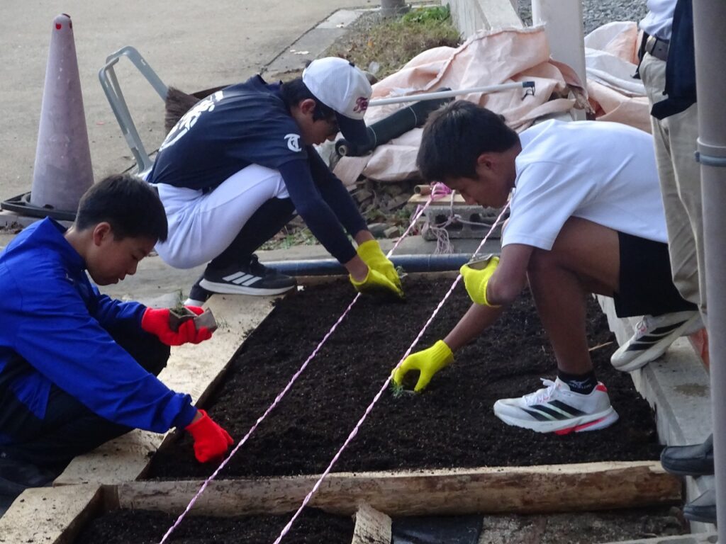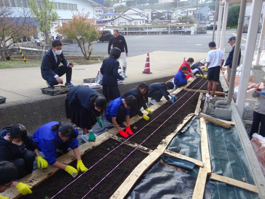 11月6日(木)環境委員と用務員さんの力を借りて、4月につくった「希望の絨毯」の拡張作業を行いました。坂を挟んで両側に芝桜が映えるようにしました。用務員さんがつくってくれた木の枠に土を入れ、増やした苗を丁寧に植えました。来年の4月・5月に坂の両側から咲く芝桜が想像できました。これからの冬を乗り越え、綺麗な姿を見せてほしいですね。