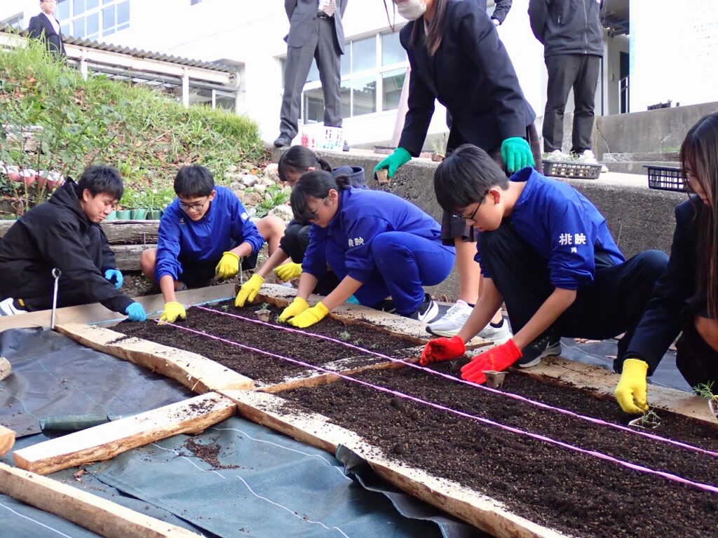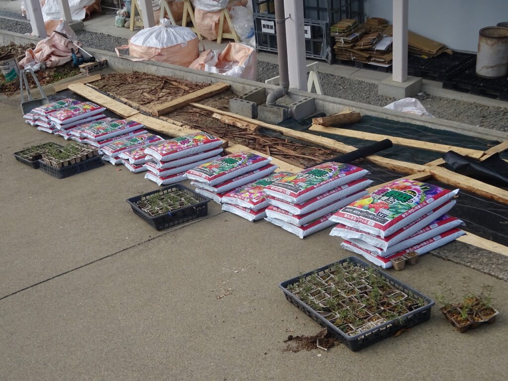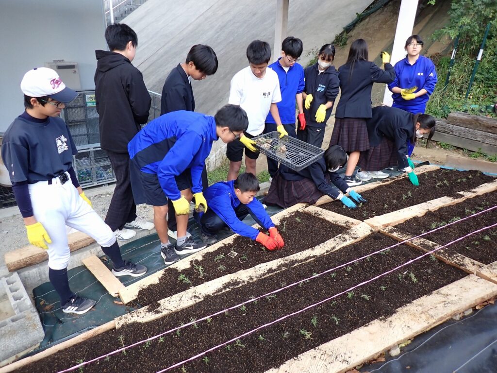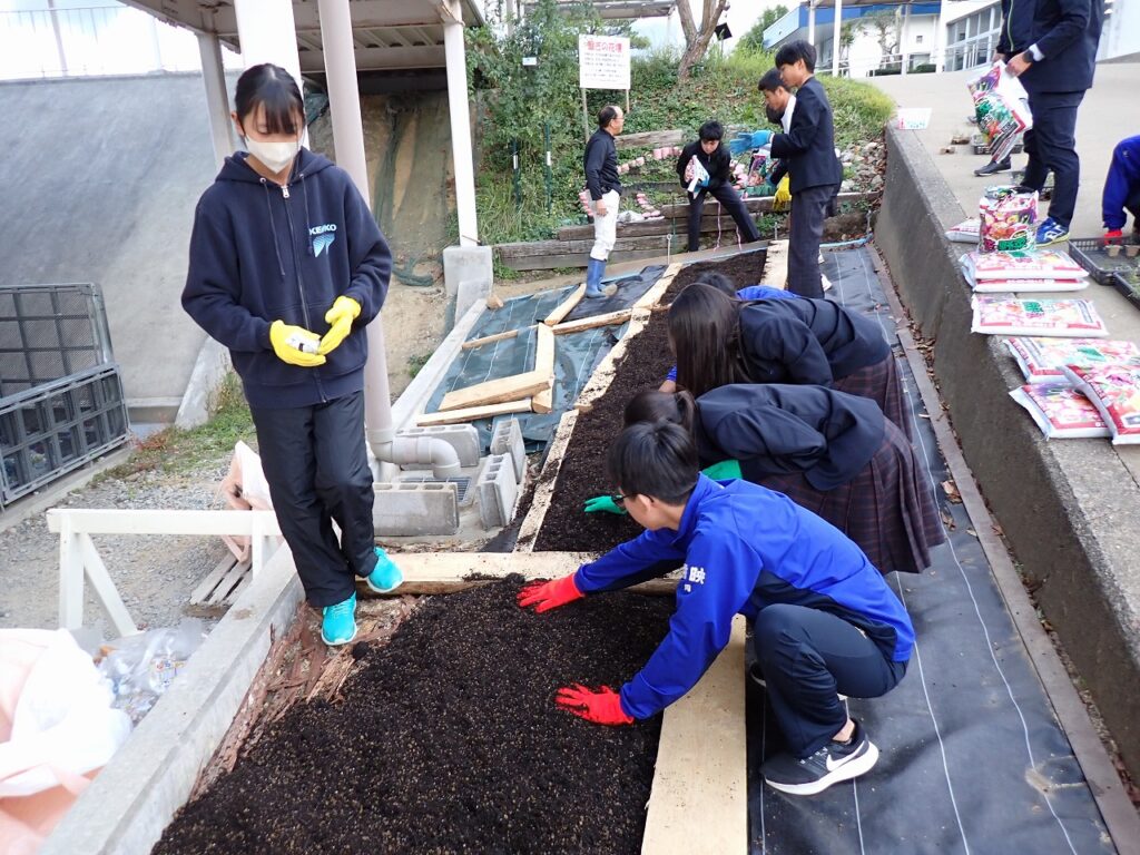 11月6日(木)環境委員と用務員さんの力を借りて、4月につくった「希望の絨毯」の拡張作業を行いました。坂を挟んで両側に芝桜が映えるようにしました。用務員さんがつくってくれた木の枠に土を入れ、増やした苗を丁寧に植えました。来年の4月・5月に坂の両側から咲く芝桜が想像できました。これからの冬を乗り越え、綺麗な姿を見せてほしいですね。