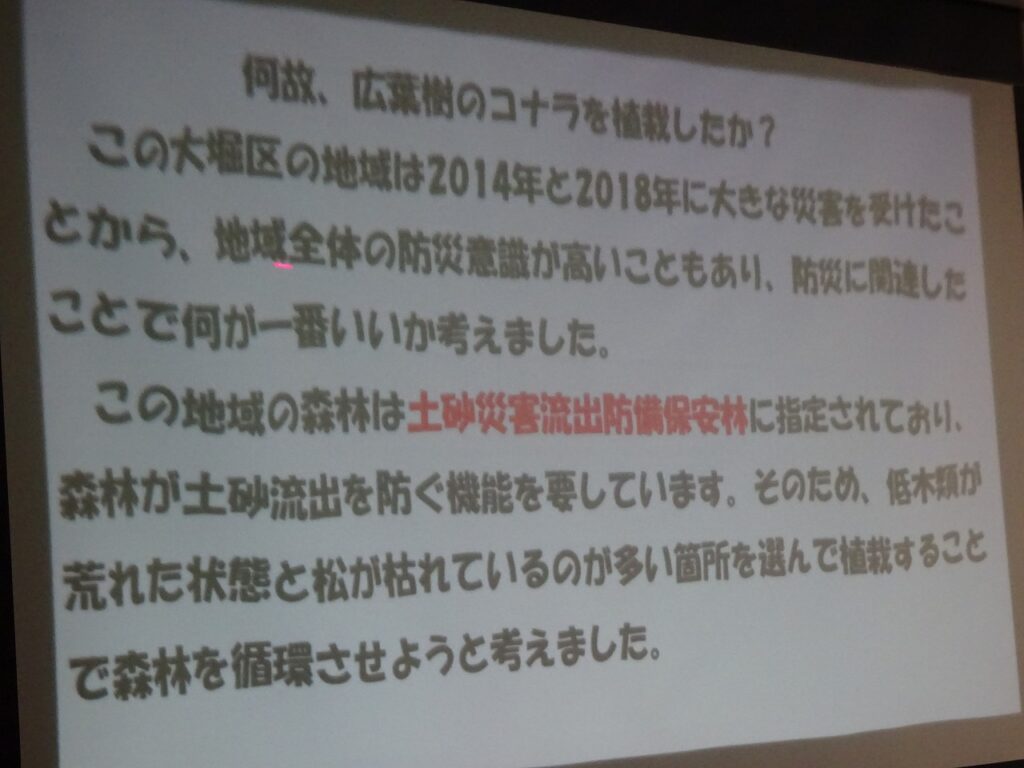 福知山は過去にも大きな水害に見舞われて、その対策として治山事業を進められていることや学校と地域がつながりながら防災について学習したり、ふるさとを誇りに思える事業であることがわかる機会となりました。2年生は全員で12月に大堀区で植栽事業を体験させてもらいます。今からとても楽しみです。