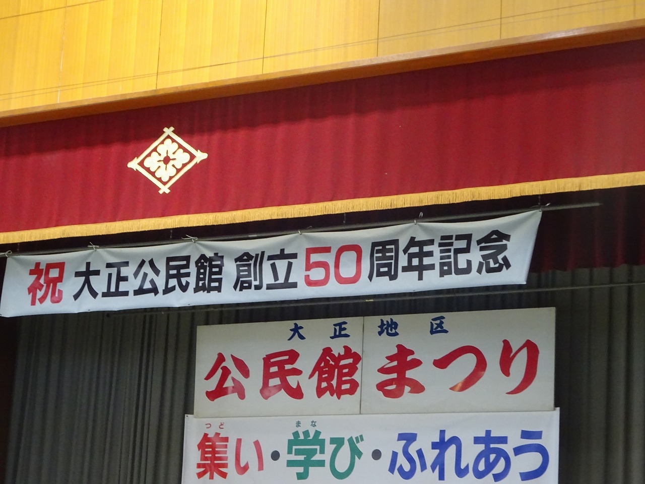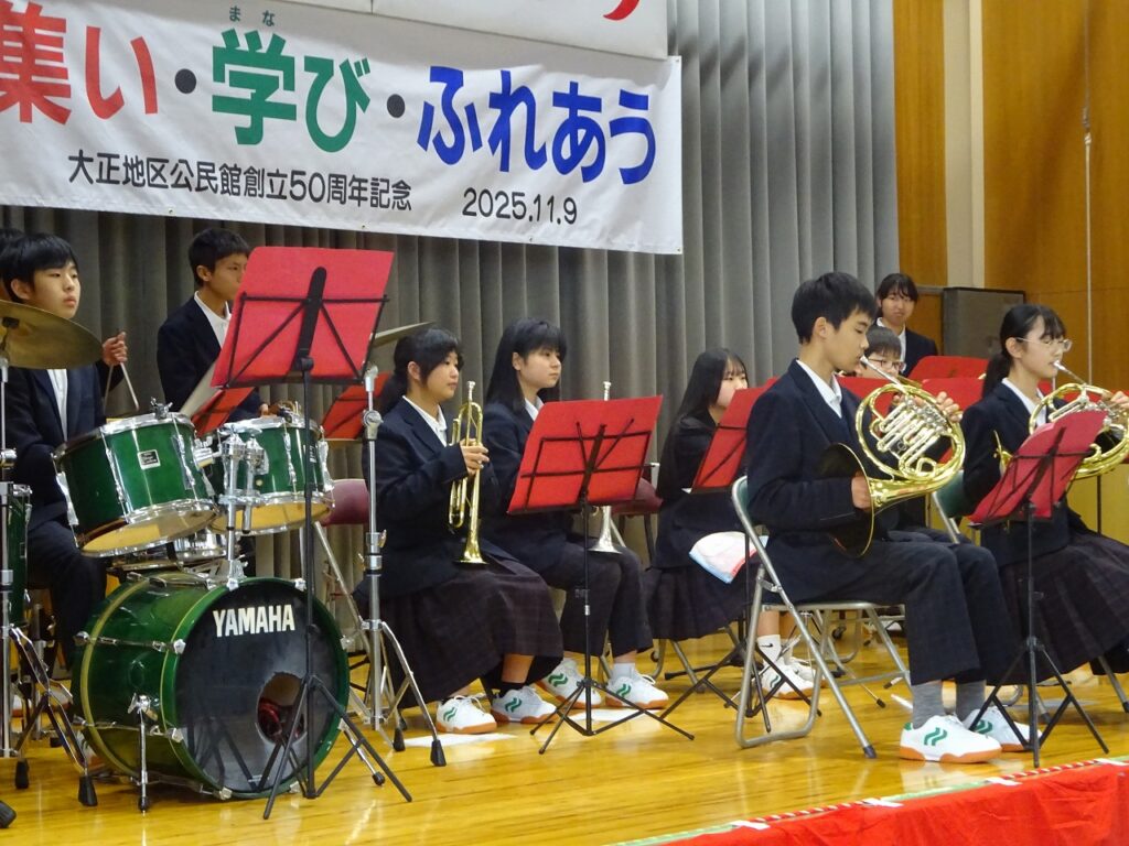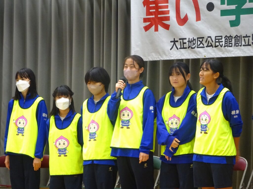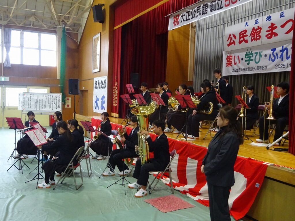 11月9日(日)雨が1日中降り続けた日でしたが、大正小学校で大正公民館50周年記念の大正公民館まつりが行われました。桃映中学校からは、吹奏楽部と夢・絆ボランティアが参加をしました。大正公民館50周年記念事業として1学期、全校生徒にもスローガン案をアンケートをしたスローガン発表もしました。吹奏楽部は、オープニングを務めました。緊張もある中でしたが、先日の中学校文化祭に引き続き、堂々としたステージ発表でした。また、ボランティアの15名は、飲食スペースの販売補助を中心に活動しました。桃映中らしく、爽やかに活動している姿が印象的でした。