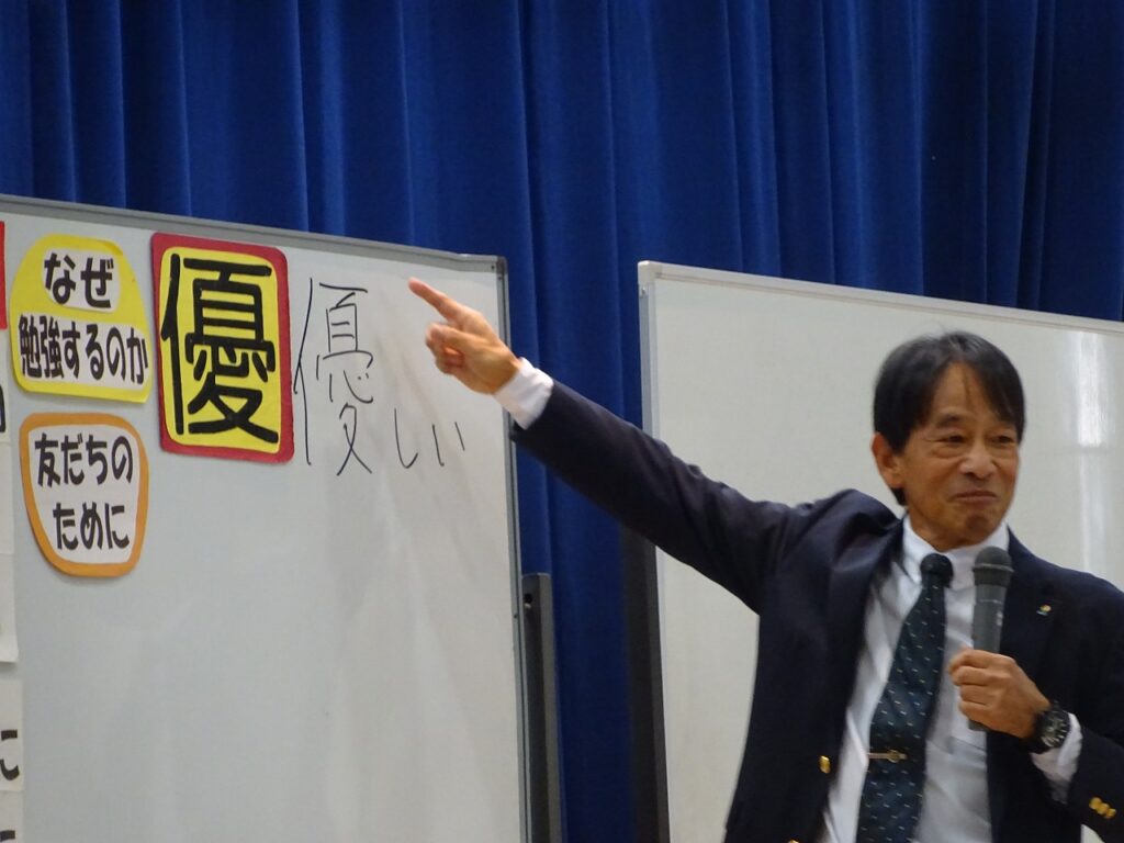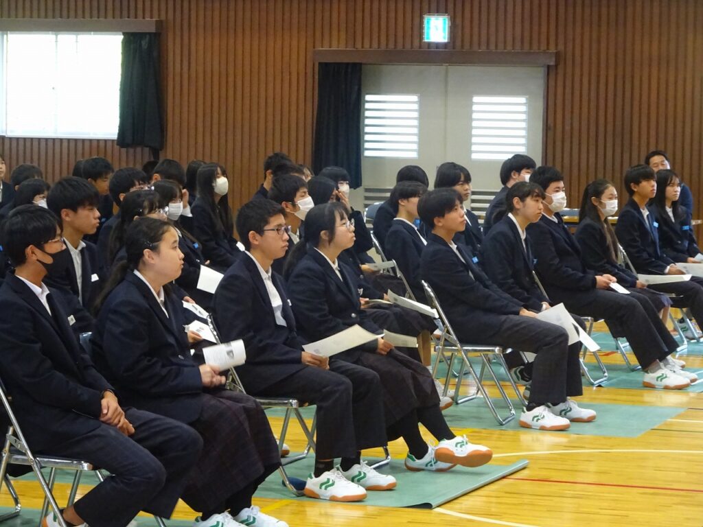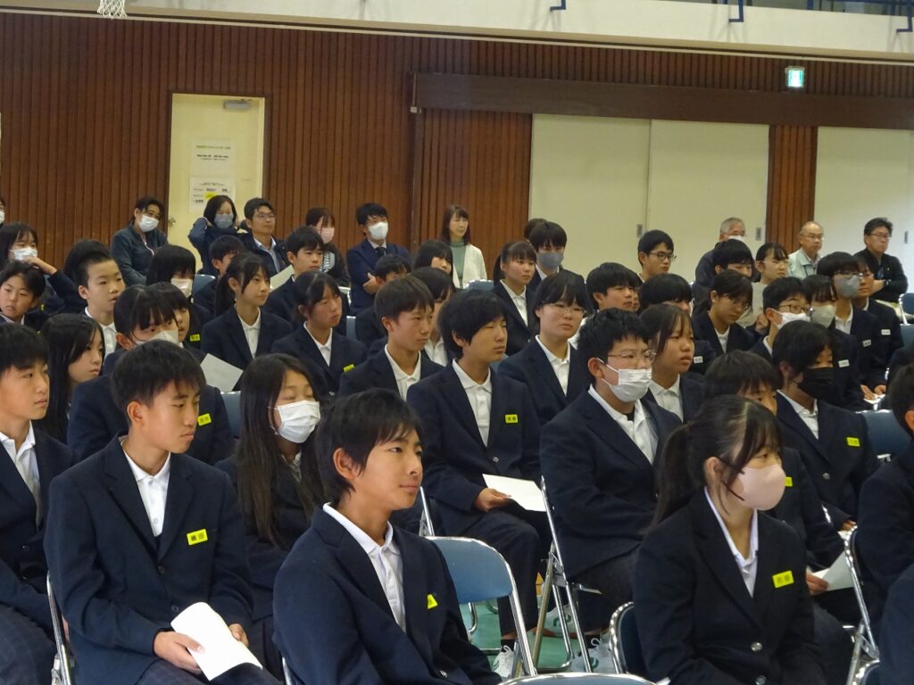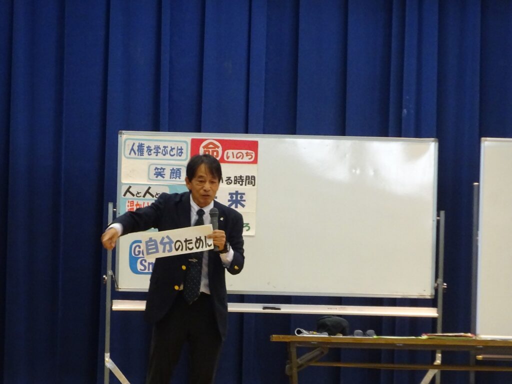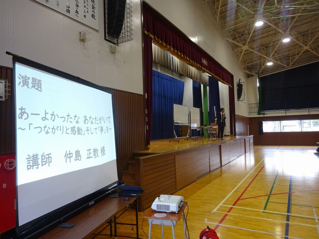 11月14日(金)5時間目に各学級授業参観、6時間目に体育館で全校生徒・保護者に向けて講師に仲島正教(なかじま まさのり)様を講師に招いてPTA人権講演会をしていただきました。