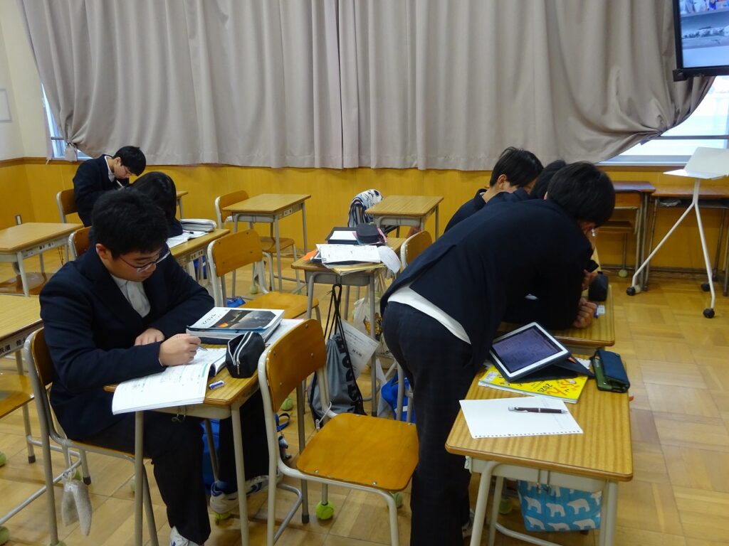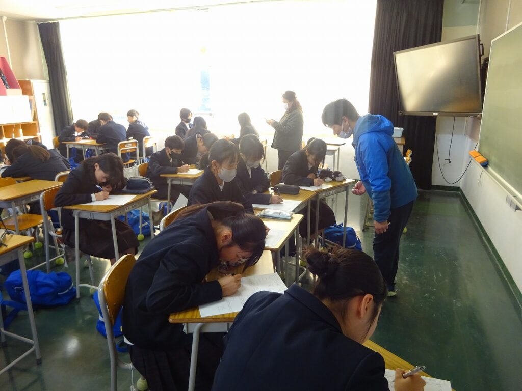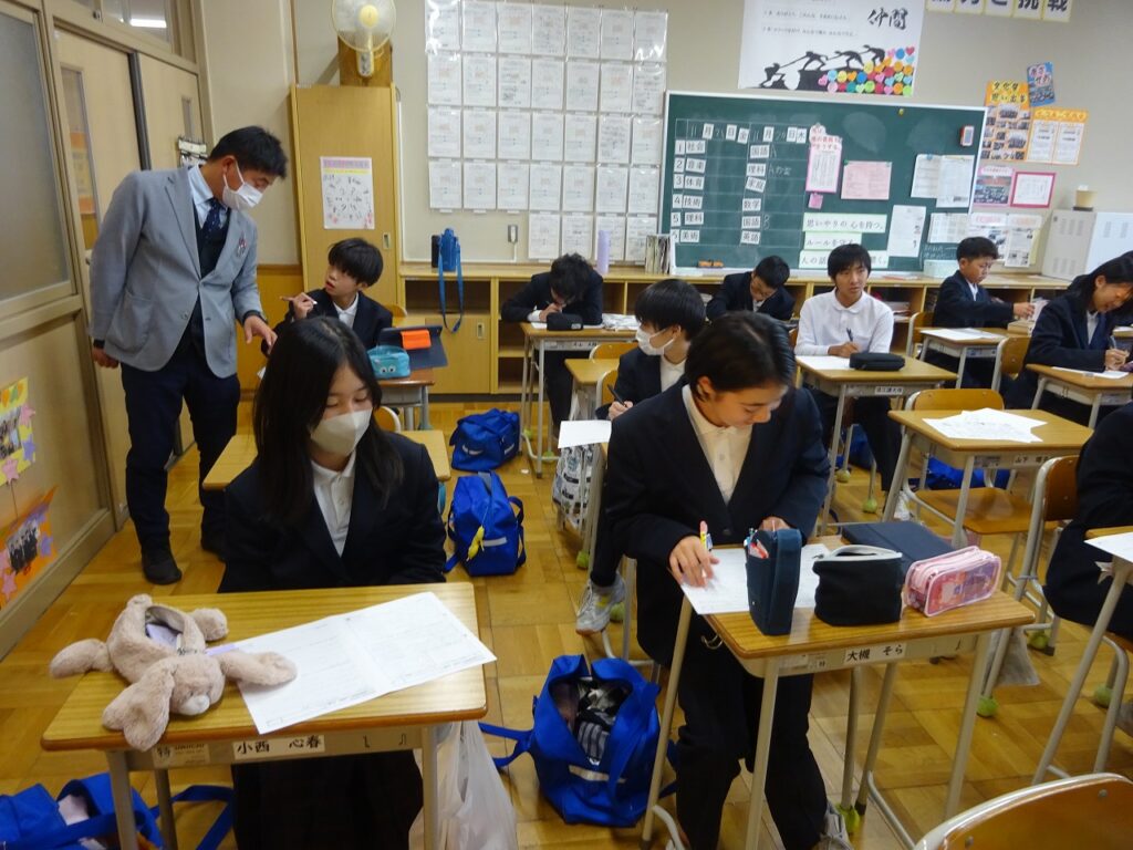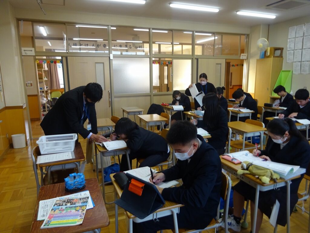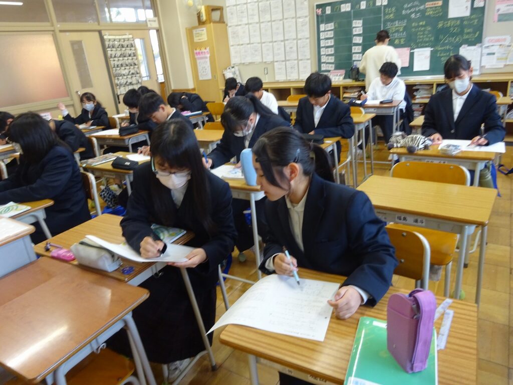 11月20日(木)来週に迫ってきた期末テストに向けてテスト前GGで放課後に学習に取り組む姿が各学年で行われています。テスト前GGは事前にアンケートを取り、希望者がテストに向けて放課後学習を進めていく取組です。どの学年でも個人で、グループでテストに向けての学習を深めています。「ここの解き方を教えて。」「この答えなんやったっけ?」などお互いに勉強を助け合う学習の輪が自然と広がっています。また文化委員の学習時間調べも始まり、テストに向けて意識が高まっています。
