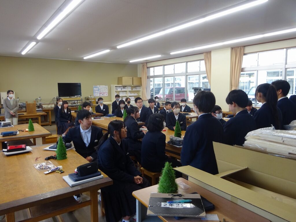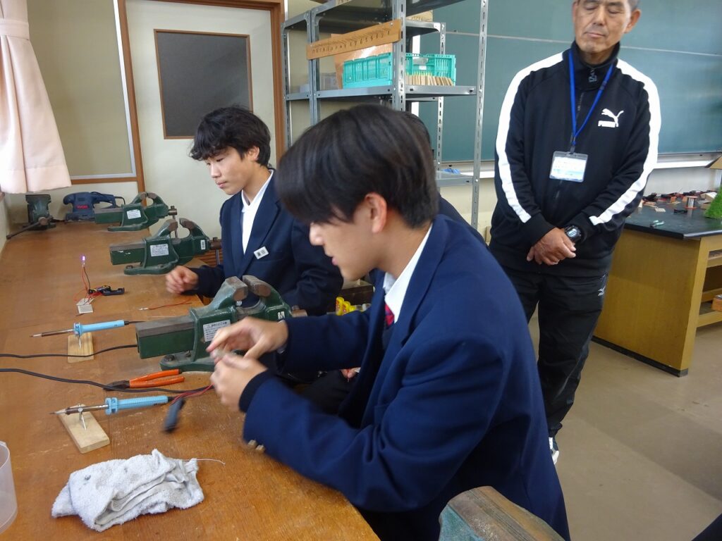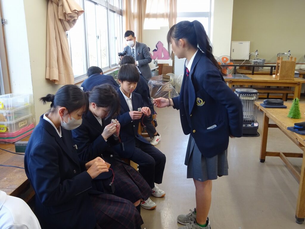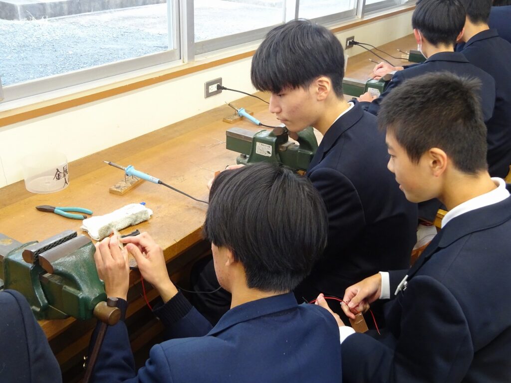 12月9日(火)2年生の技術でハンダ付けの実習の授業で工業高校の3年生7名に来てもらいました。グループに分かれて高校生に注意事項や、やり方を丁寧に教わりクリスマスツリーにLEDの電飾を付ける回路作成に挑みました。1人1人真剣にハンダ付けをしてLEDが点灯したときには大いに喜びました。高校生のみなさんありがとうございました。
