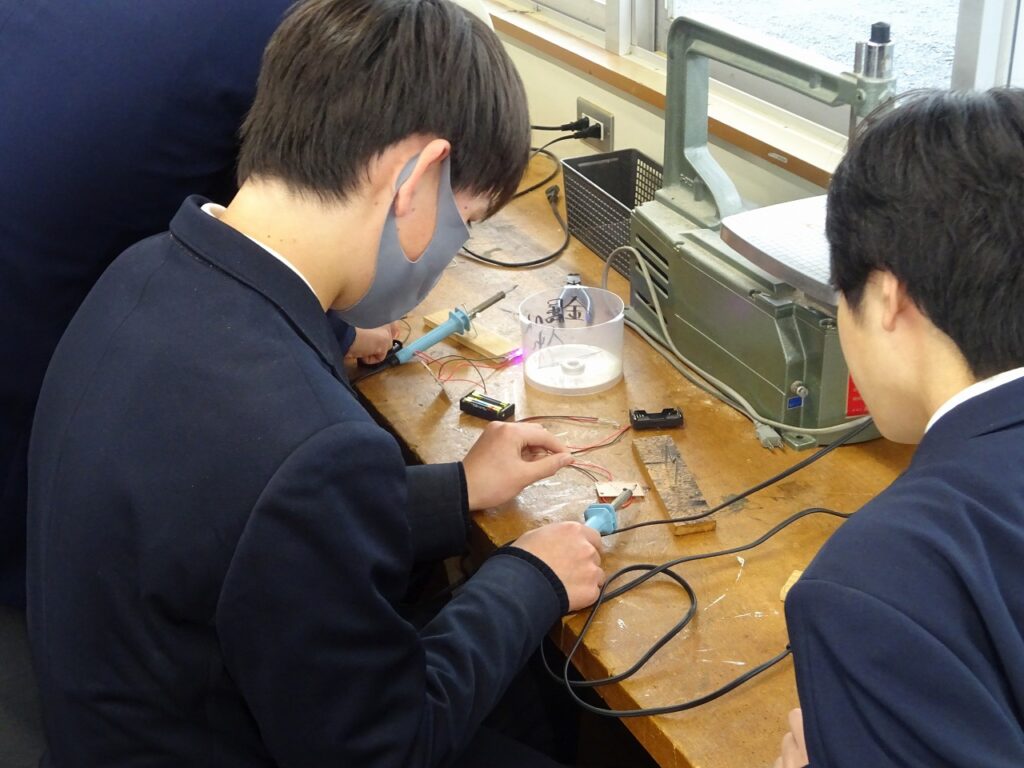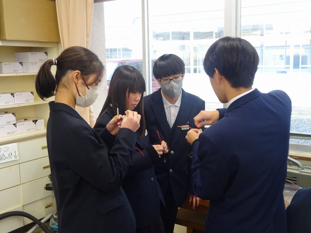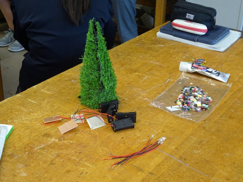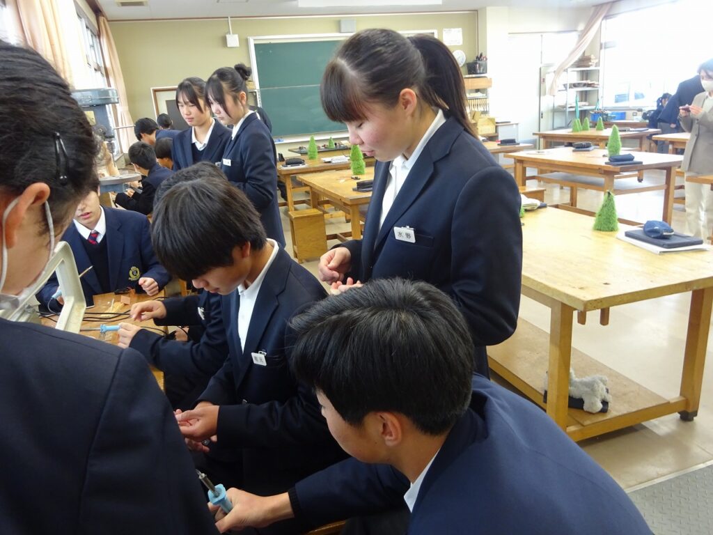 12月9日(火)2年生の技術でハンダ付けの実習の授業で工業高校の3年生7名に来てもらいました。グループに分かれて高校生に注意事項や、やり方を丁寧に教わりクリスマスツリーにLEDの電飾を付ける回路作成に挑みました。1人1人真剣にハンダ付けをしてLEDが点灯したときには大いに喜びました。高校生のみなさんありがとうございました。
