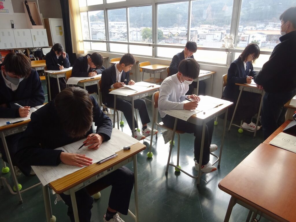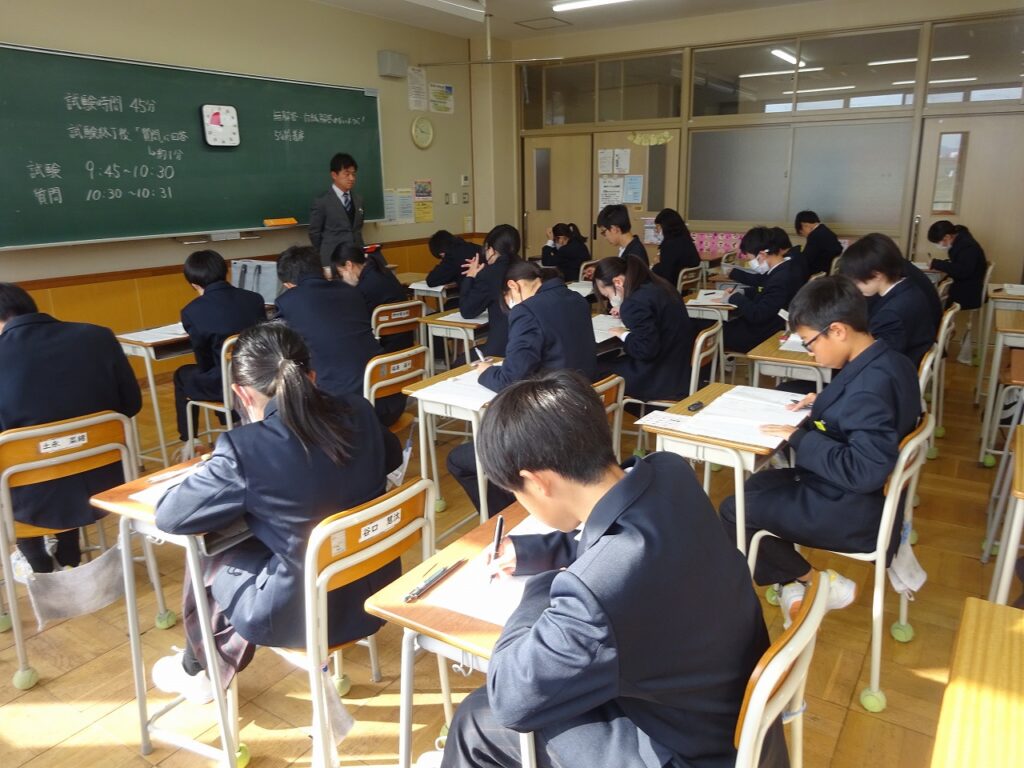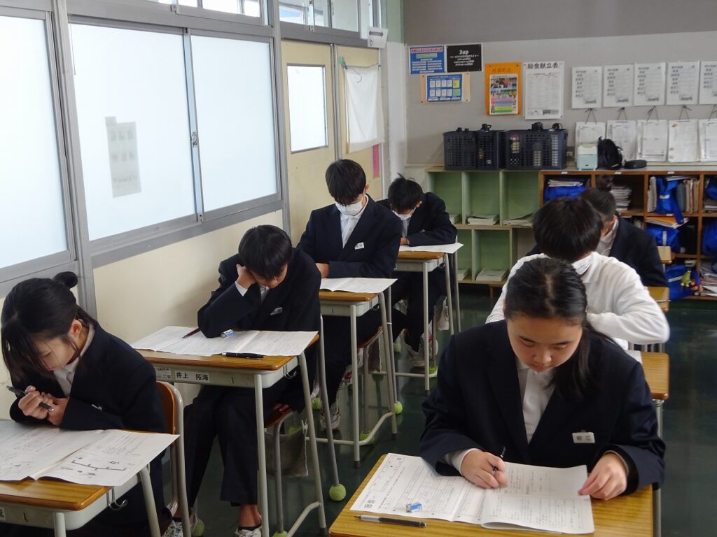 12月11日(木)1年生、2年生が国語、数学、英語の実力テストを受けました。2学期の期末テストが終わり、12月も残すところあと少しになってきましたが、今までの学習の理解を確認する機会になりました。明日は3年生が受験に向けての5教科の実力テストを受けます。どの学年も頑張っていきましょう。