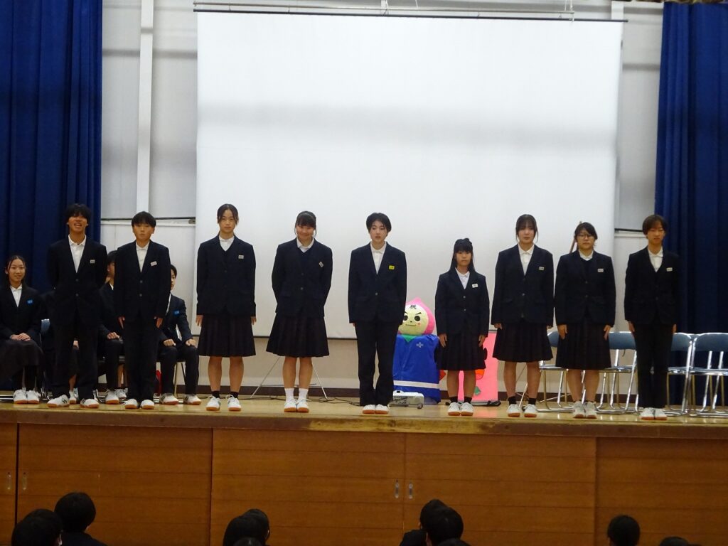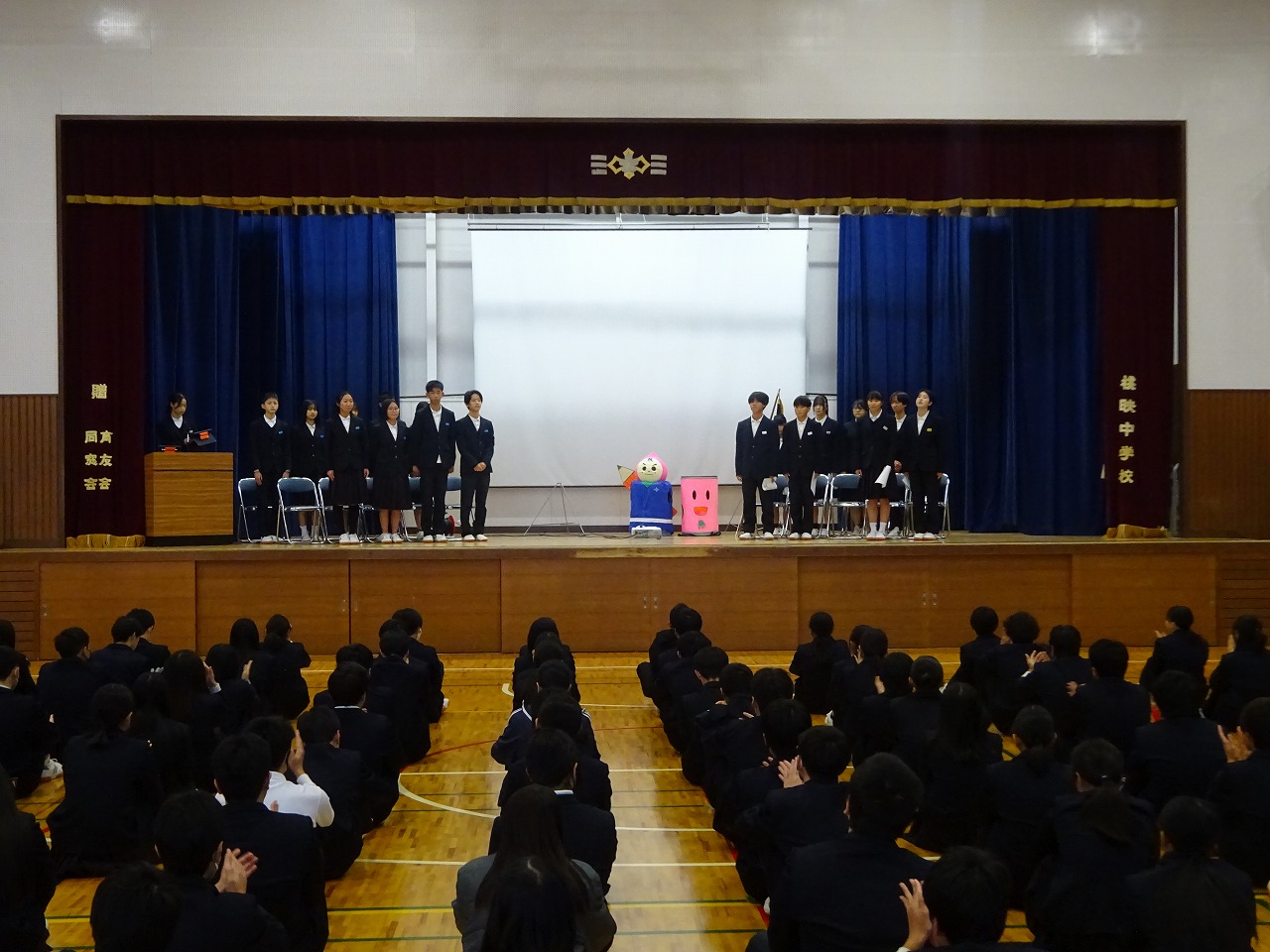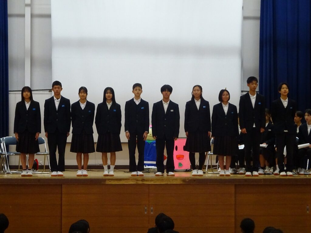 12月23日(火)1時間目の時間に全校生徒が集まり、生徒会本部の認証式・引継式が行われました。令和7年生徒会から令和8年生徒会へバトンが渡されました。今年1年の生徒会活動の振り返りや新生徒会の決意などを全校の前で新旧の生徒会長が発表しました。令和7年生徒会本部の皆さんお疲れ様でした。令和8年生徒会本部の皆さんの活躍を楽しみにしています。