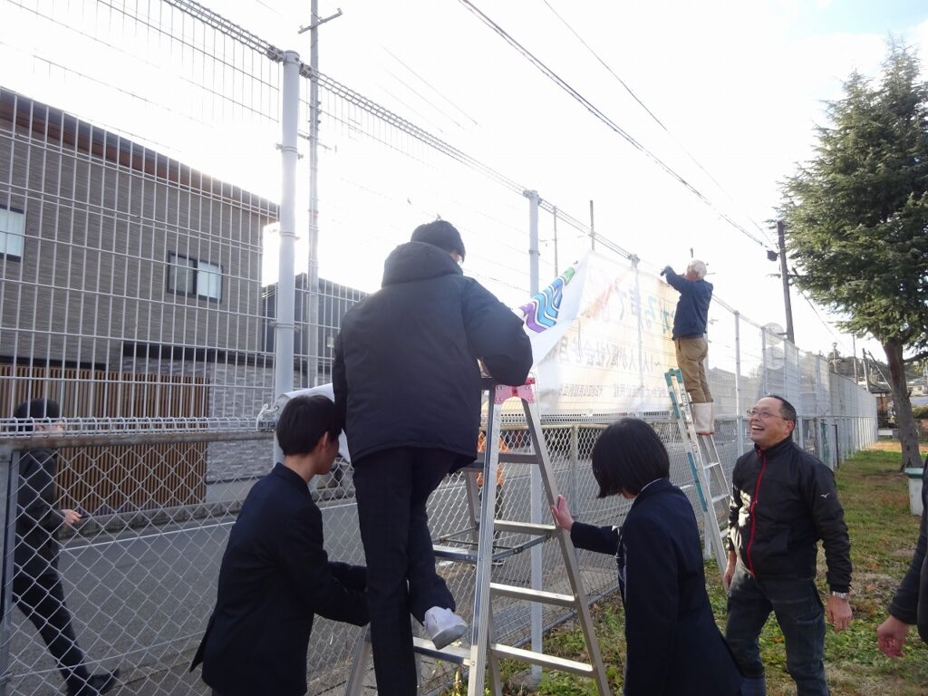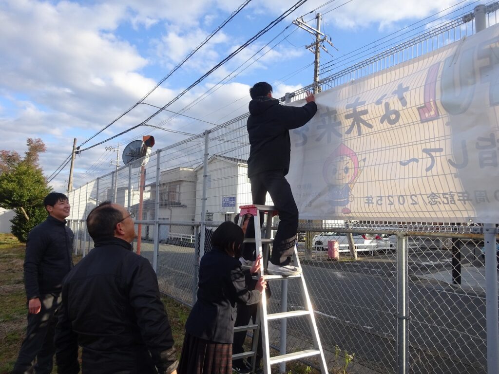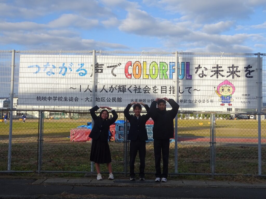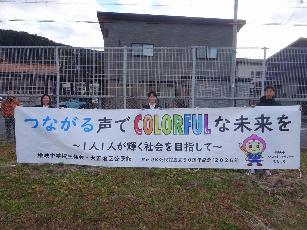 1月9日(金)大正地区公民館50周年記念として桃映中学校生徒会と大正公民館の共同でスローガンを作成し、それを桃映中学校のグラウンドフェンスに設置しました。スローガンは「 つながる声でCLORFULな未来を ~1人1人が輝く社会を目指して~ 」です。前年度の生徒会スローガンと今年度の生徒会スローガンの2つから「つながる」「カラフル」の言葉を使い、地域と声でつながり合い、個性豊かなカラフルな未来にしていこうという意味を込めたスローガンにしました。