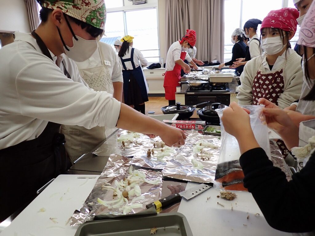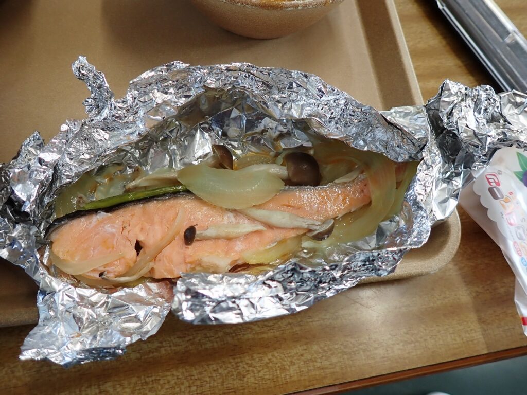 2月4日(水)5日(木)にかけて2年生でも調理実習の授業を行い、鮭のホイル焼きを班で協力しながらつくりました。野菜の切り方などをiPadや班員と確認しながら丁寧につくりました。給食の時間に美味しくいただきました。