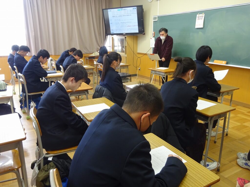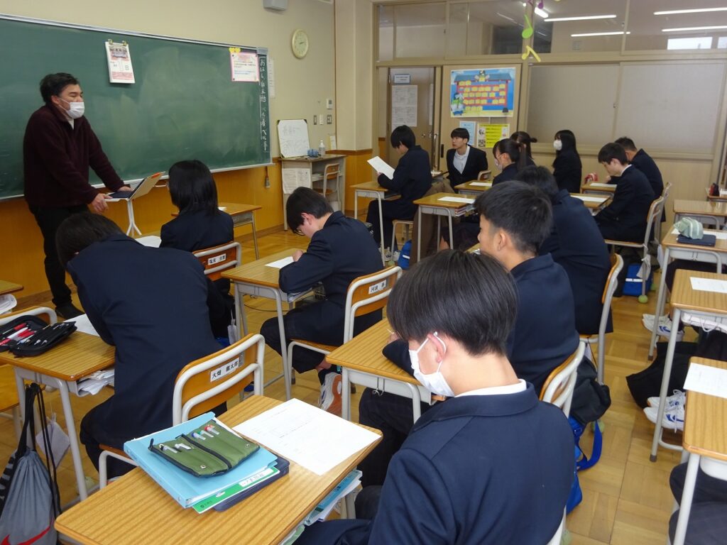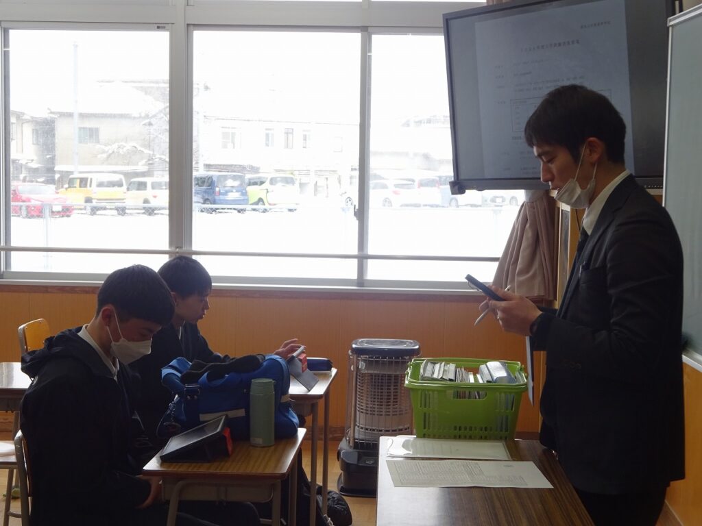 2月9日(月)昨日からの雪の影響で桃映中学校も雪景色でした。明日は多くの3年生が近隣の私立高校の入試の日です。今日、3年生は明日の入試に向けての最終確認をしました。明日も雪が残っている可能性があります。気をつけて受験に臨んでください。