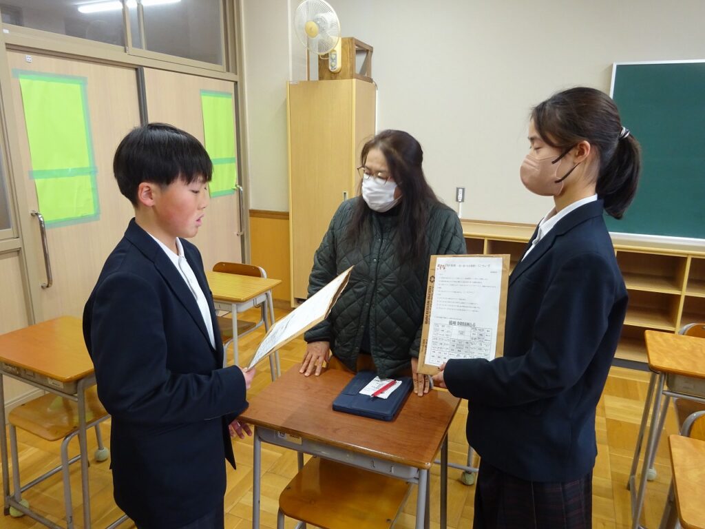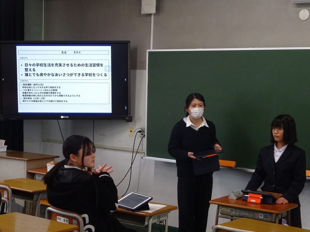 2月10日(火)、12日(木)で新しく就任した専門委員長が3年生の卒業プロジェクトについてと来年度の方針提案を一斉委員会で行いました。来年度の生徒会活動をより充実したものにしていくため、委員長の方針提案を各委員に伝えていました。