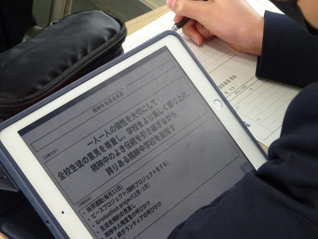 来年度からの桃映中学校を決めるのはあなたたちです。来週から3月に入り、いよいよ3年生が卒業になります。これからの桃映中学校をよりよくしていくために1年生、2年生の力で生徒会活動を盛り上げていきましょう。