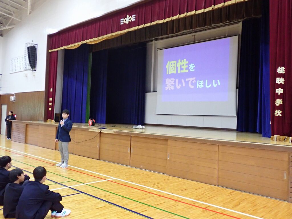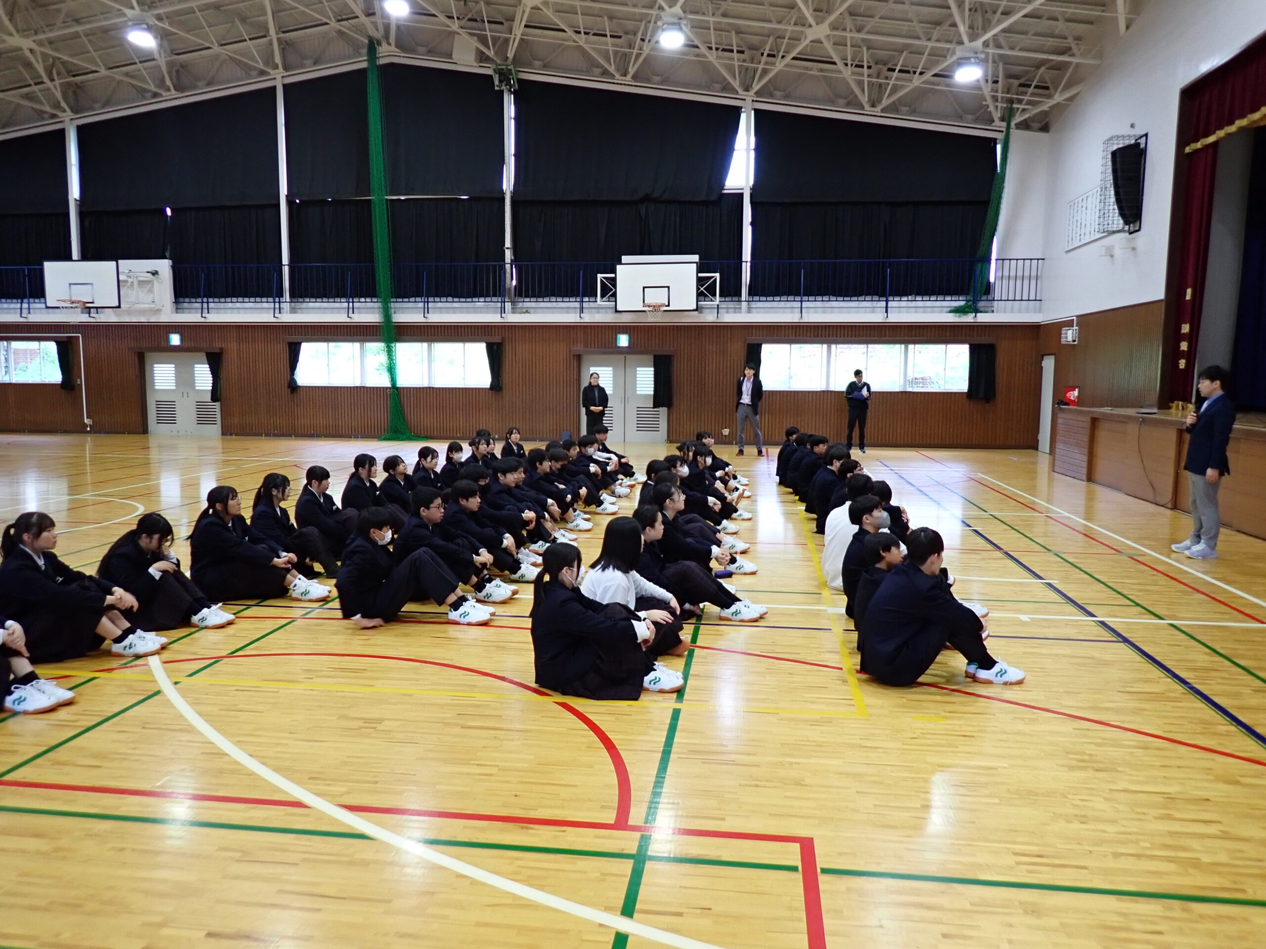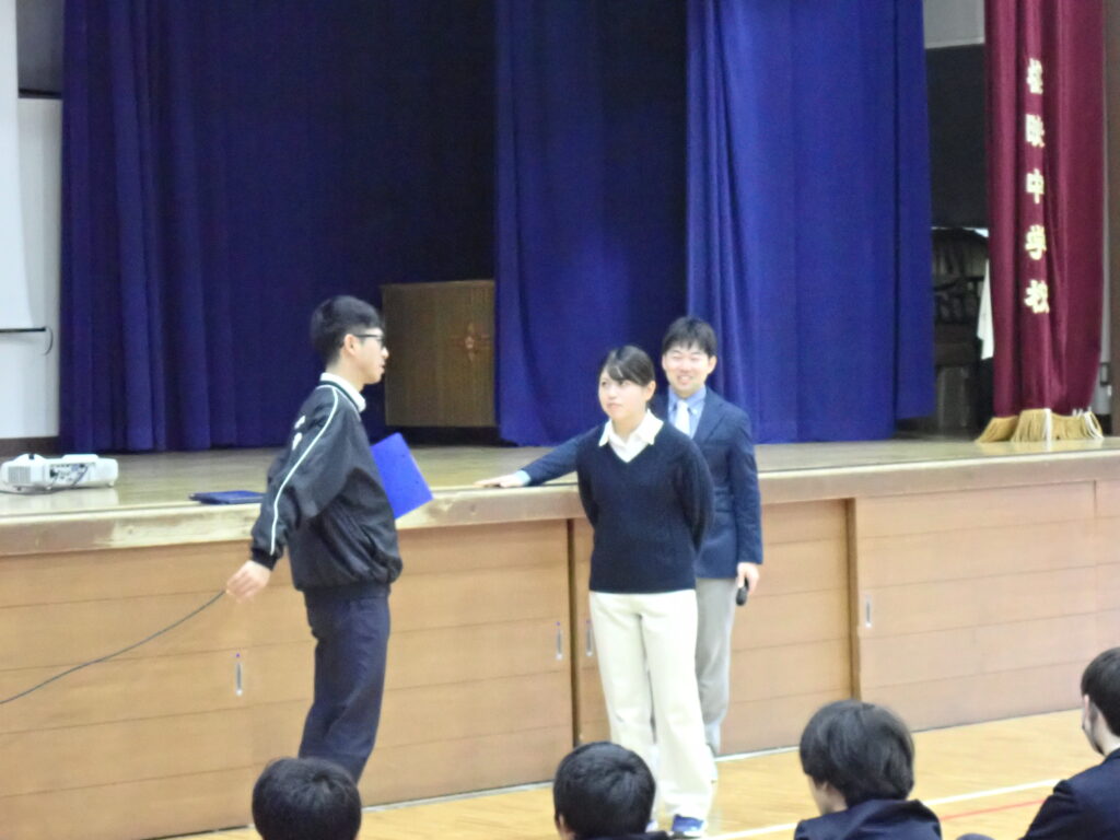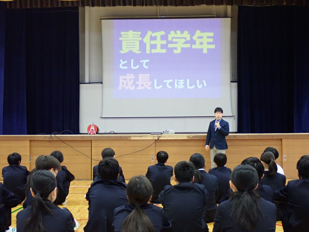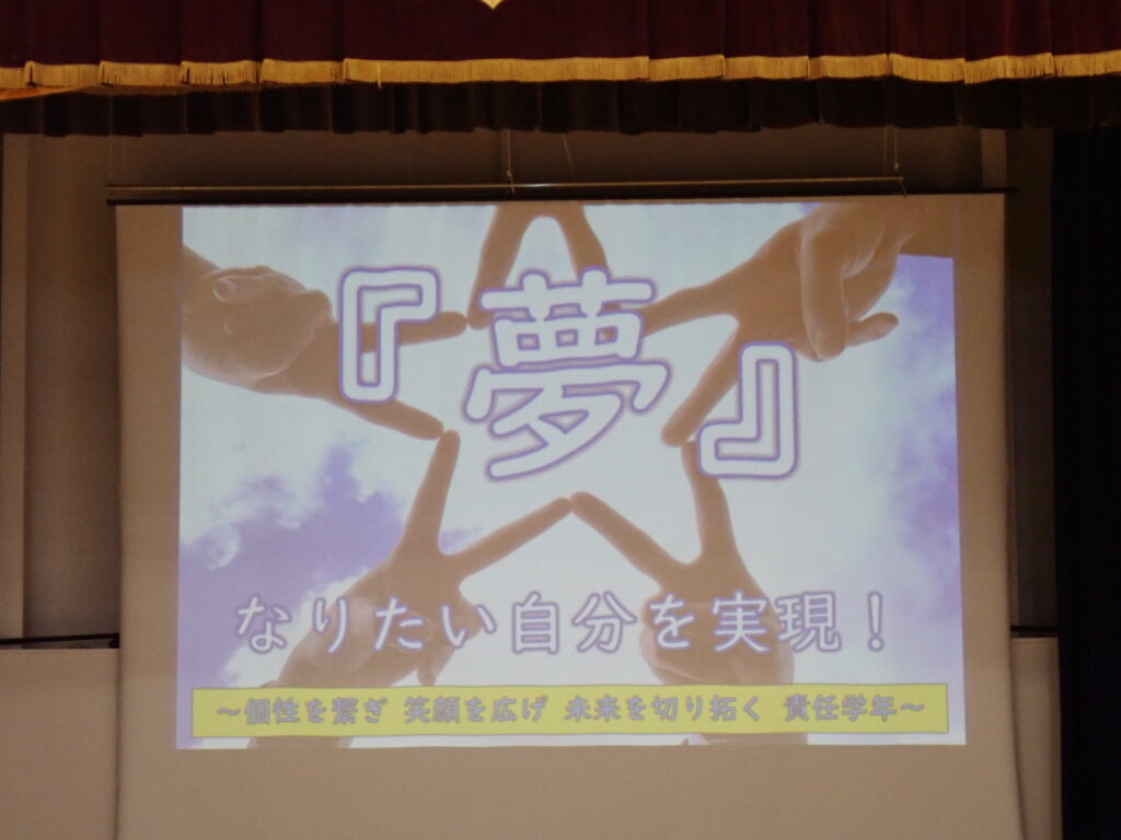 本日、3年生の学年集会を行いました。3年生スローガン「夢 なりたい自分を実現~個性を繋ぎ 笑顔を広げ 未来を切り拓く 責任学年~」の発表があり3年生の顔も引き締まっていました。