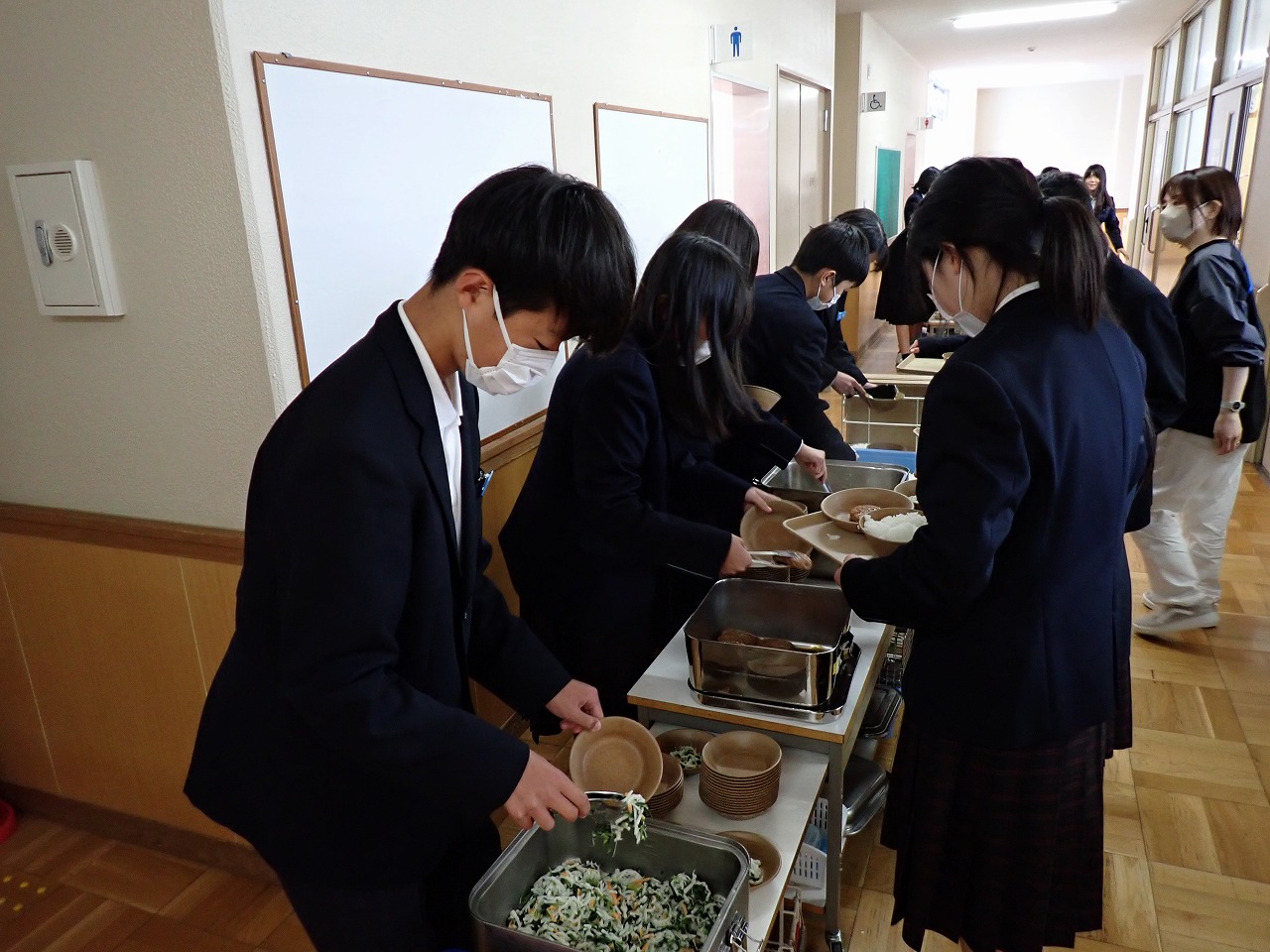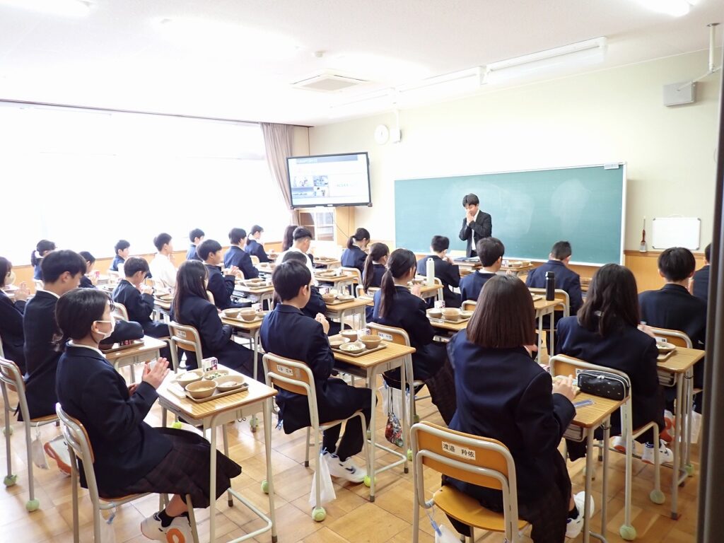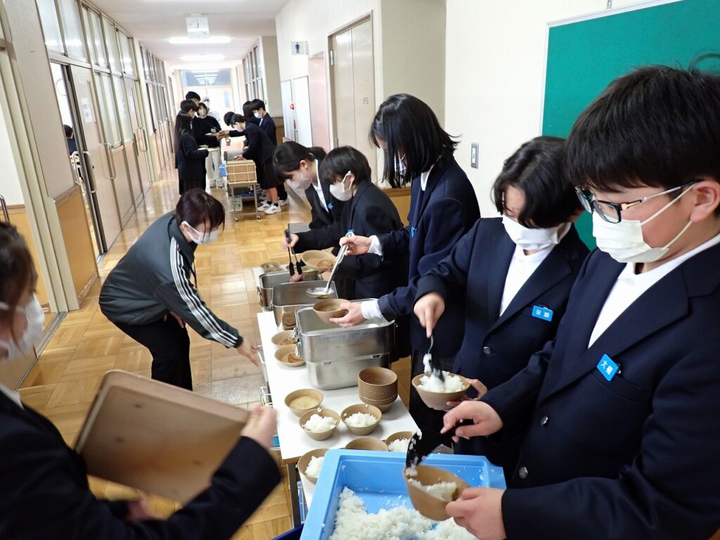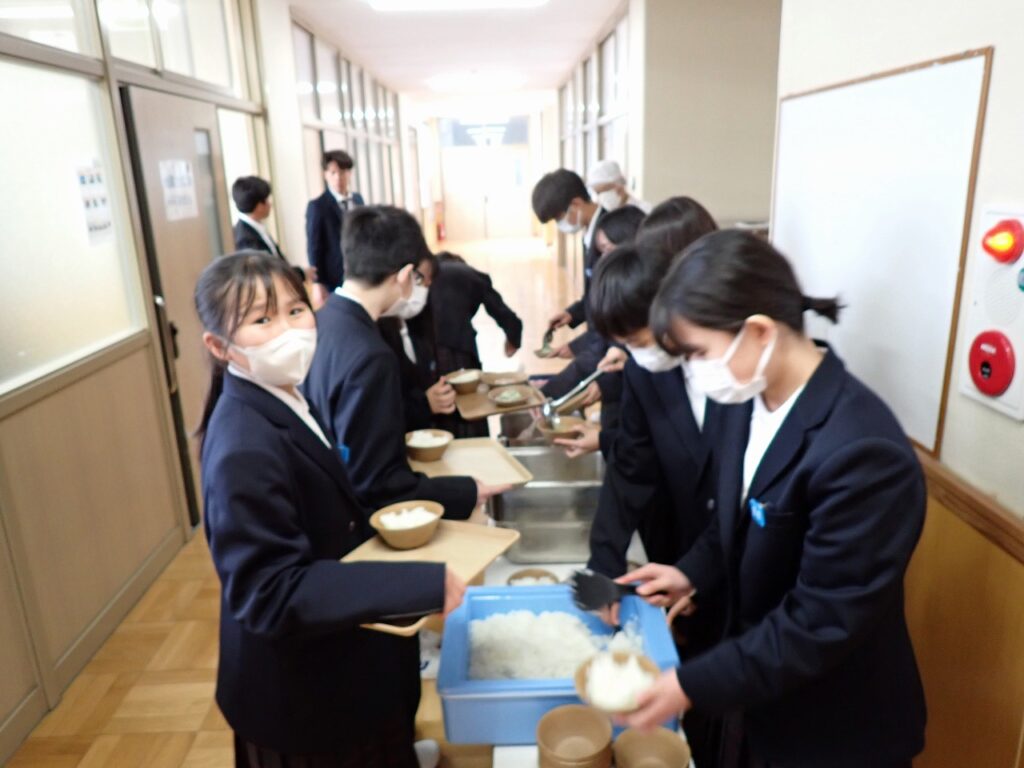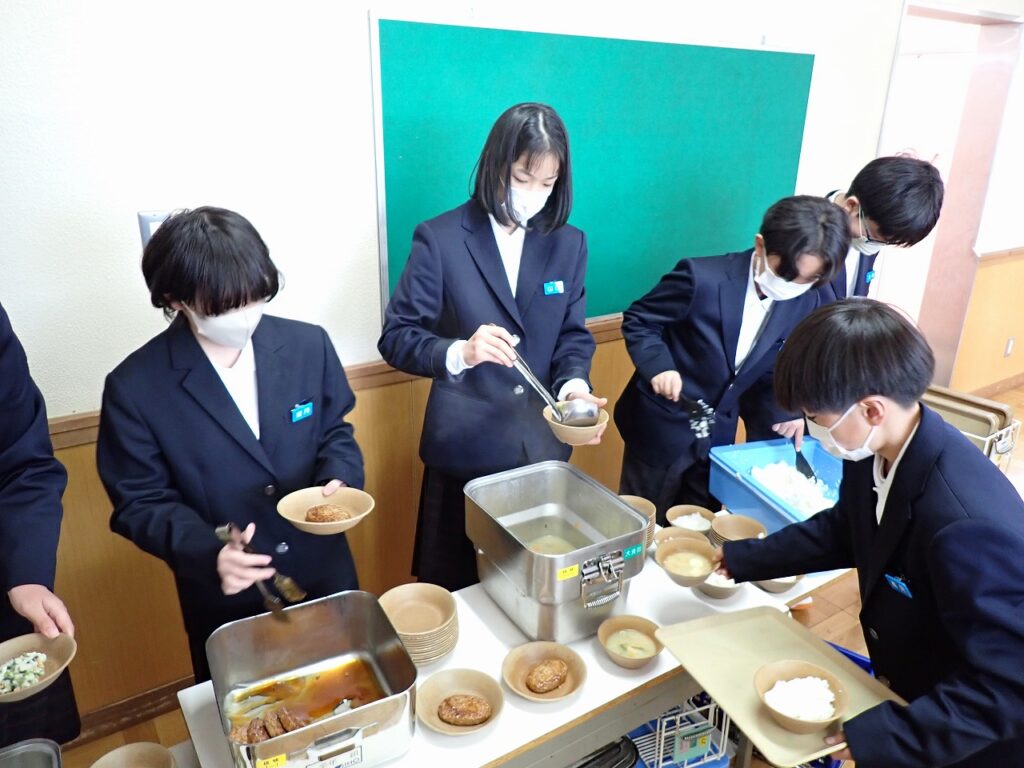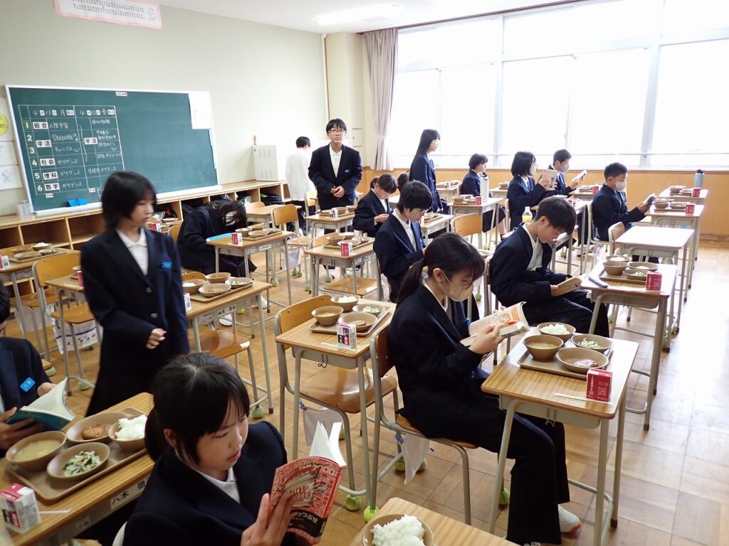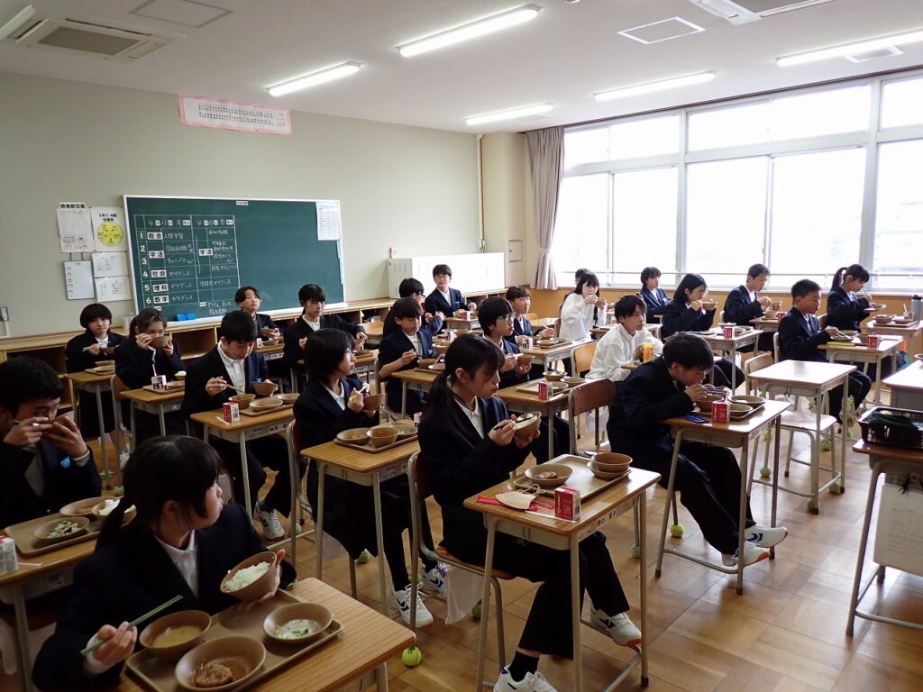 新しい教室で仲間と一緒に食べる給食に、生徒たちは少し緊張しながらも楽しそうな様子でした。