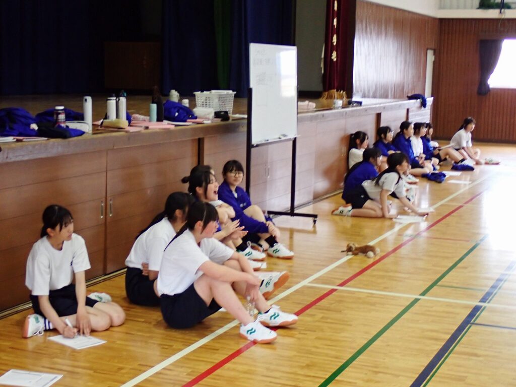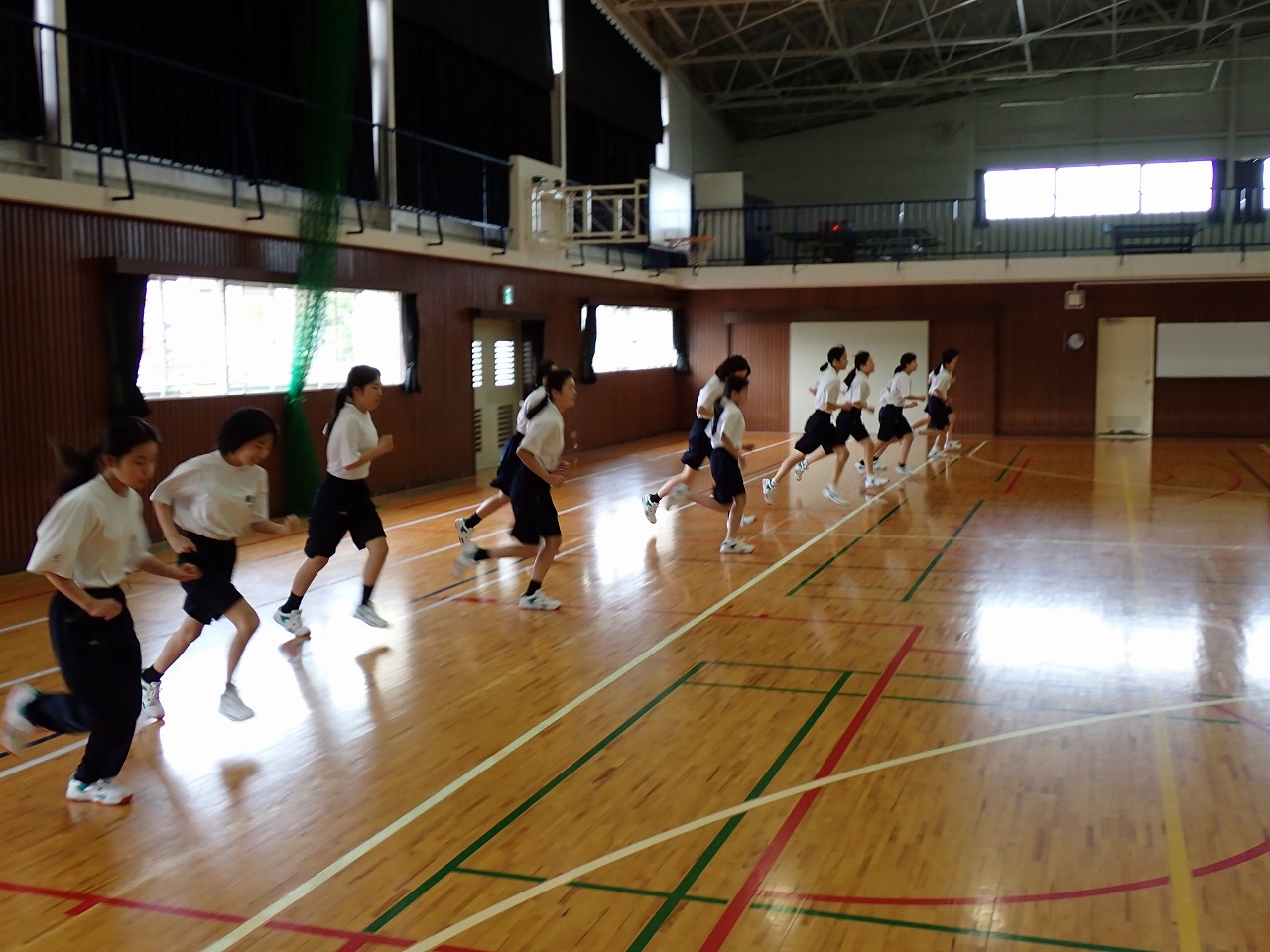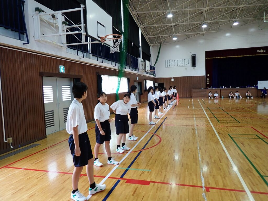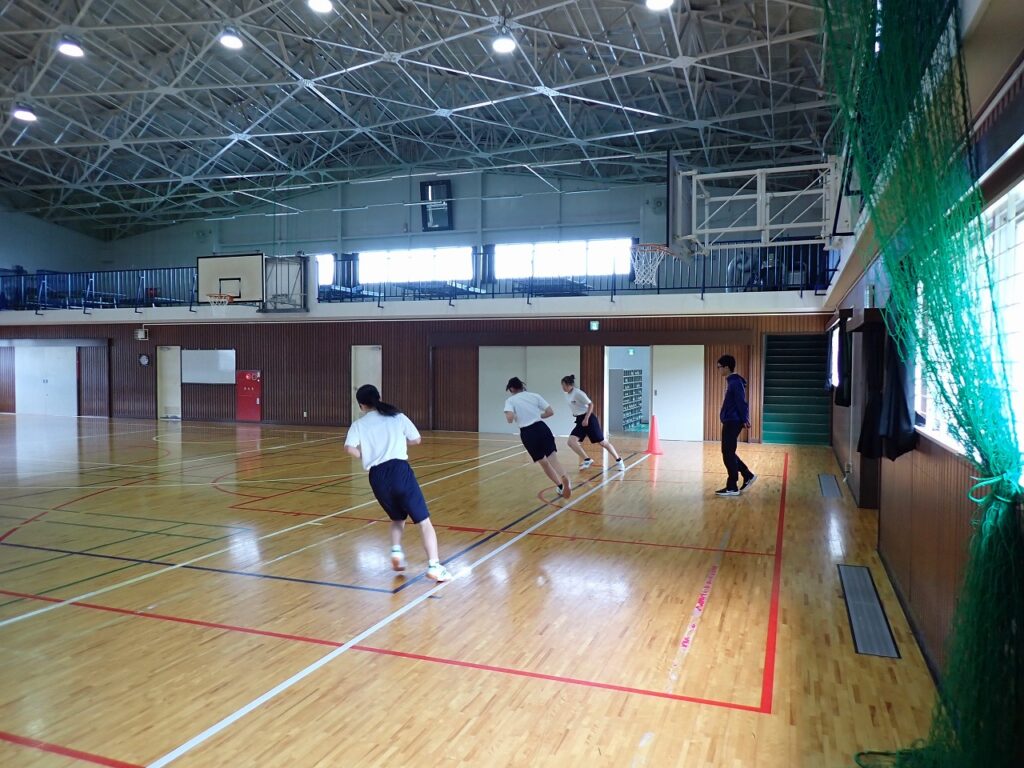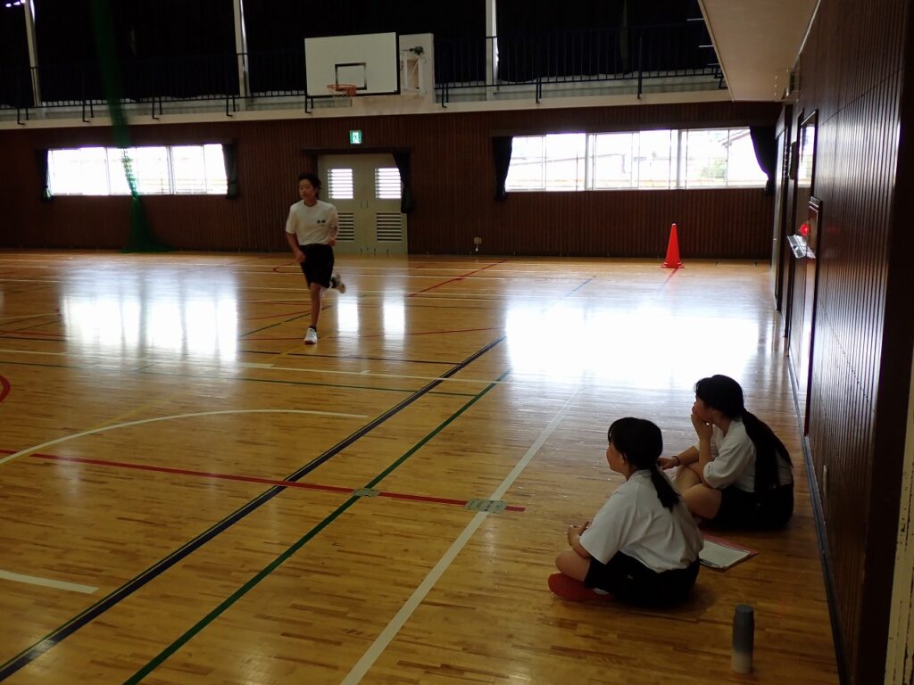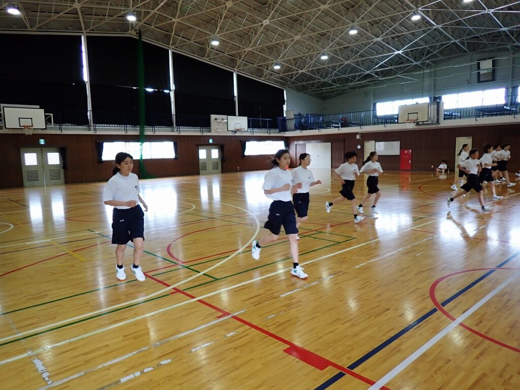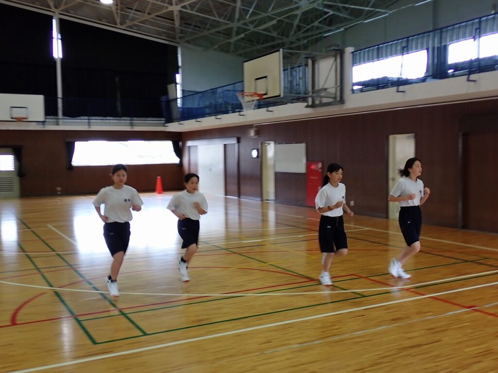 各学年でスポーツテストを行っています。今日は女子の体育でシャトルランを実施しました。生徒たちはそれぞれが自己ベストや限界を目指し、最後まで懸命に走り抜いていました。中には100回を超える記録を出した生徒もおり、みんなさわやかな表情をしていました。担任も駆けつけて声援を送り、仲間や先生方の応援が大きな力となる様子が見られました。