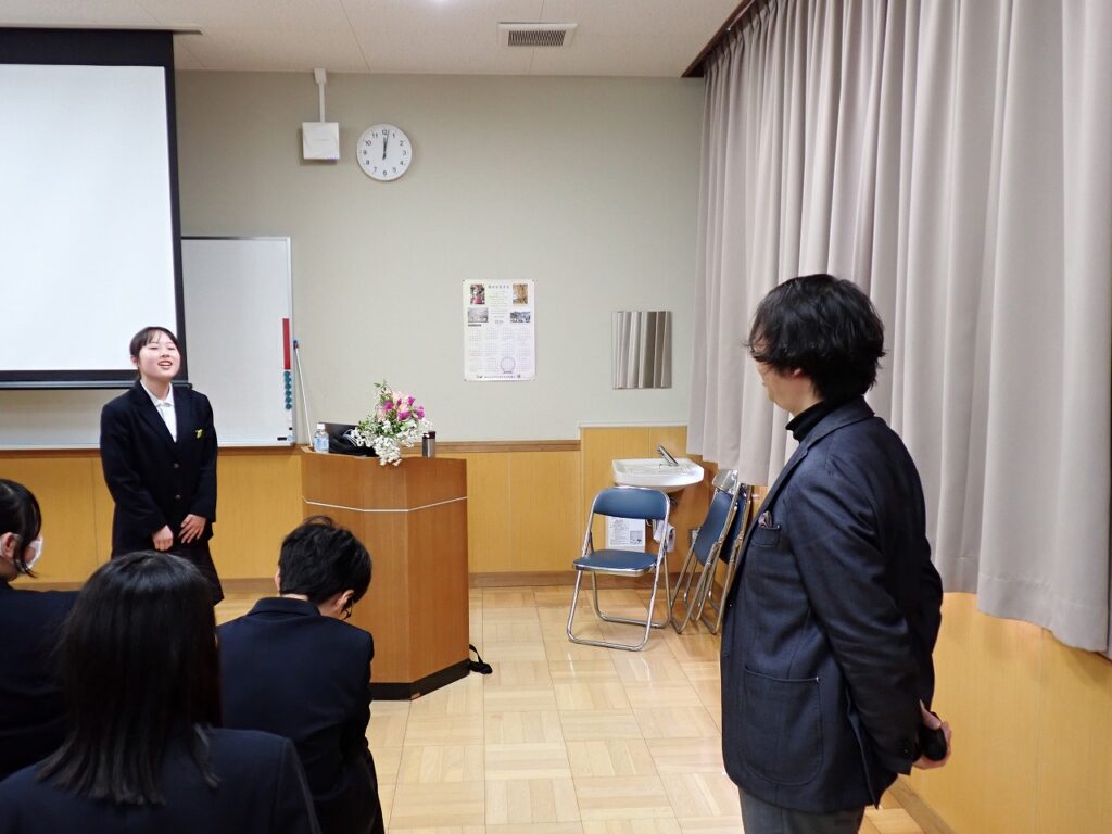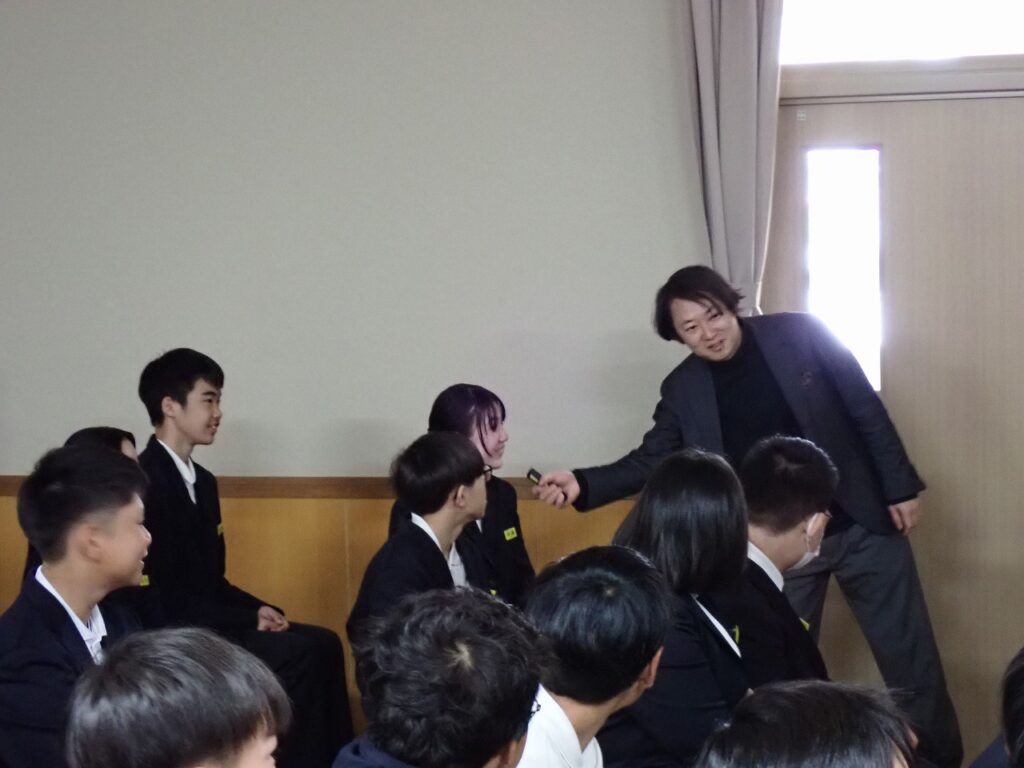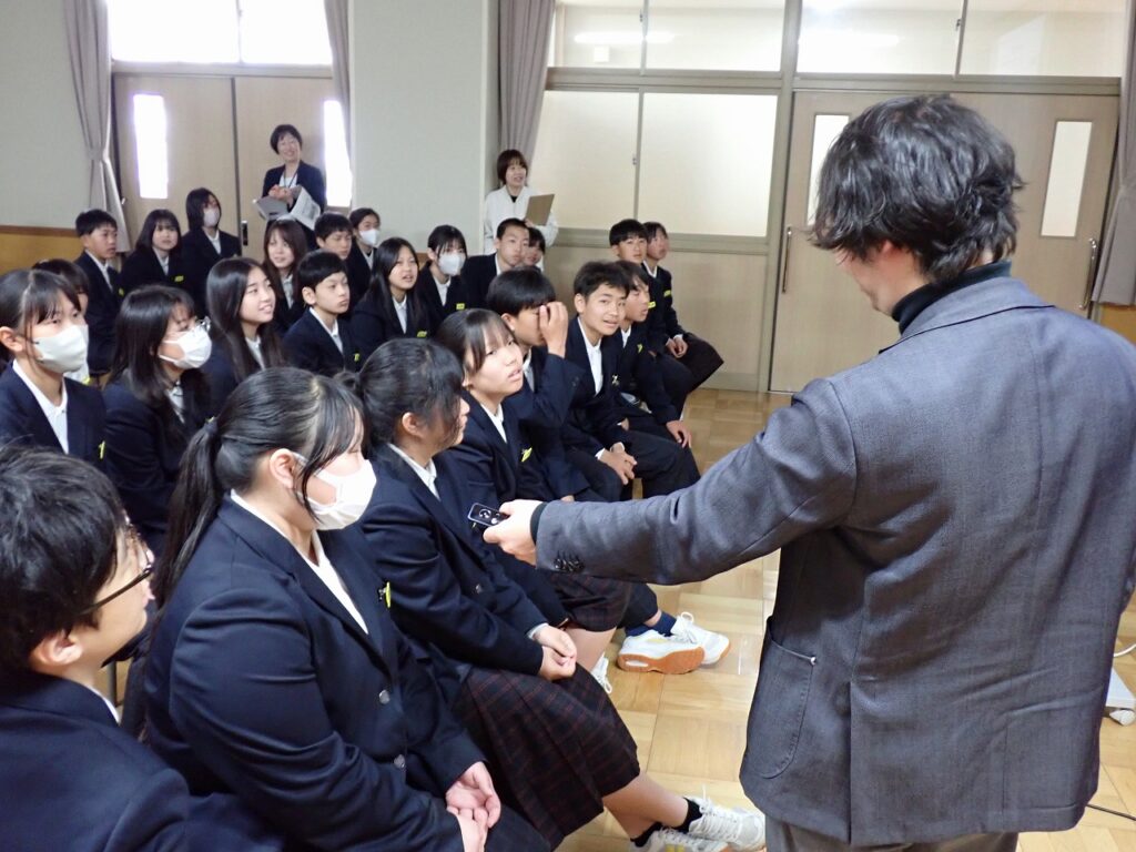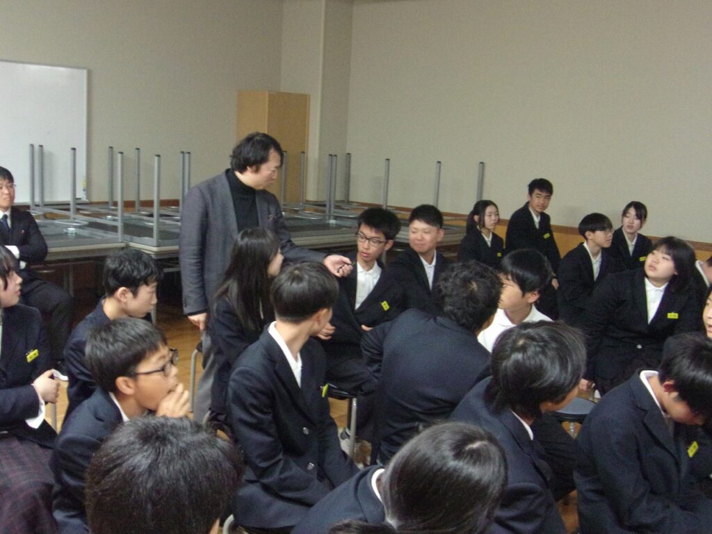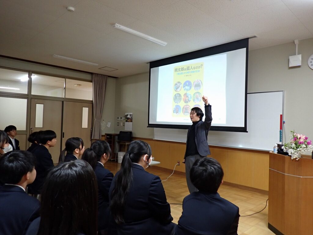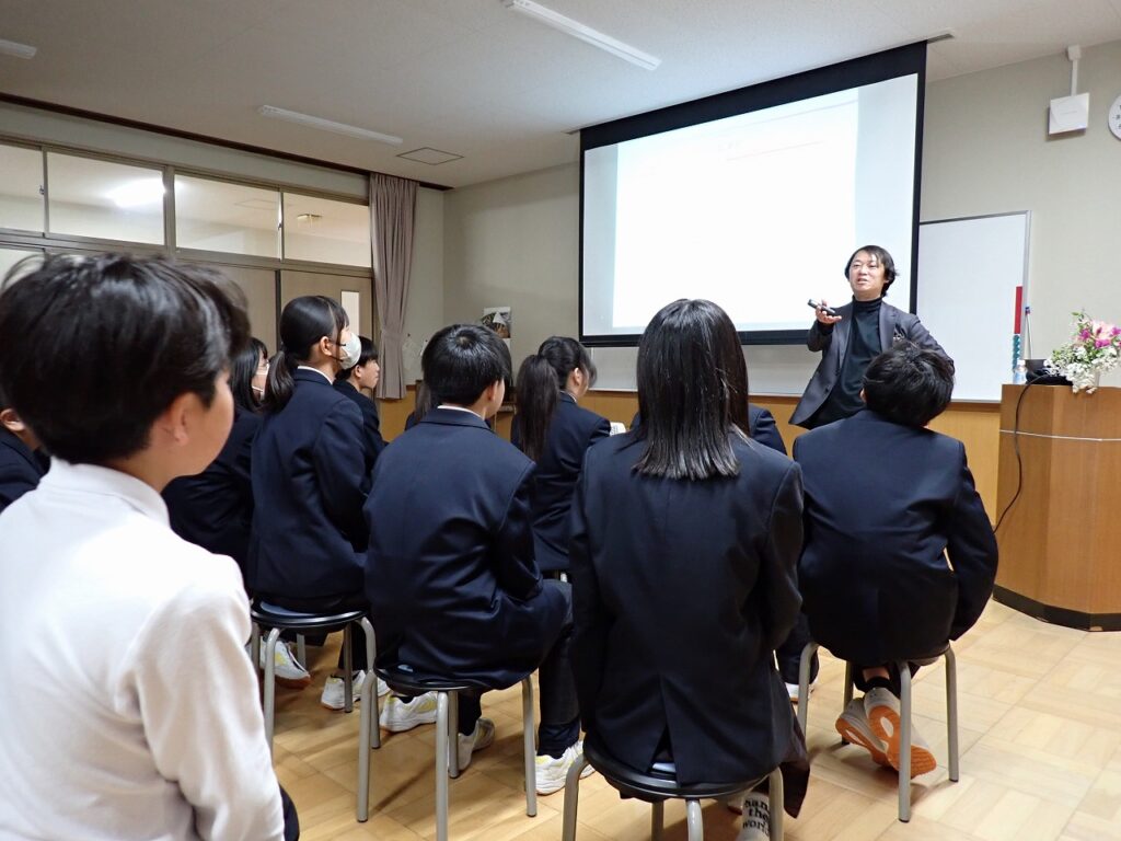 今年度から総合的な学習の時間を活用し、3年間を見通して探究的な学習『TOEI TANKYU GAKUSHU~なりたい自分になる~』を実施します。学年ごとのテーマをもとに、身近な興味関心から「なぜ?」と問いを立て、仲間とともに探究します。そのさきがけとして、福知山公立大学の杉岡准教授をお招きし、「探究」と「問いの立て方」について、2年生にご講義いただきました。生徒たちは、講義を通して探究的に学ぶことの大切さや、問いをもつことの意味について理解を深めていました。また、「なりたい自分になる」ためには何が必要かを一人一人が考える貴重な機会となりました。今後の学びや生活につながる有意義な時間となりました。