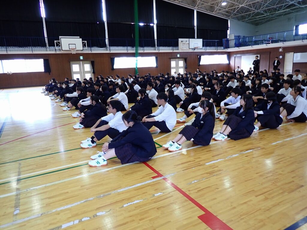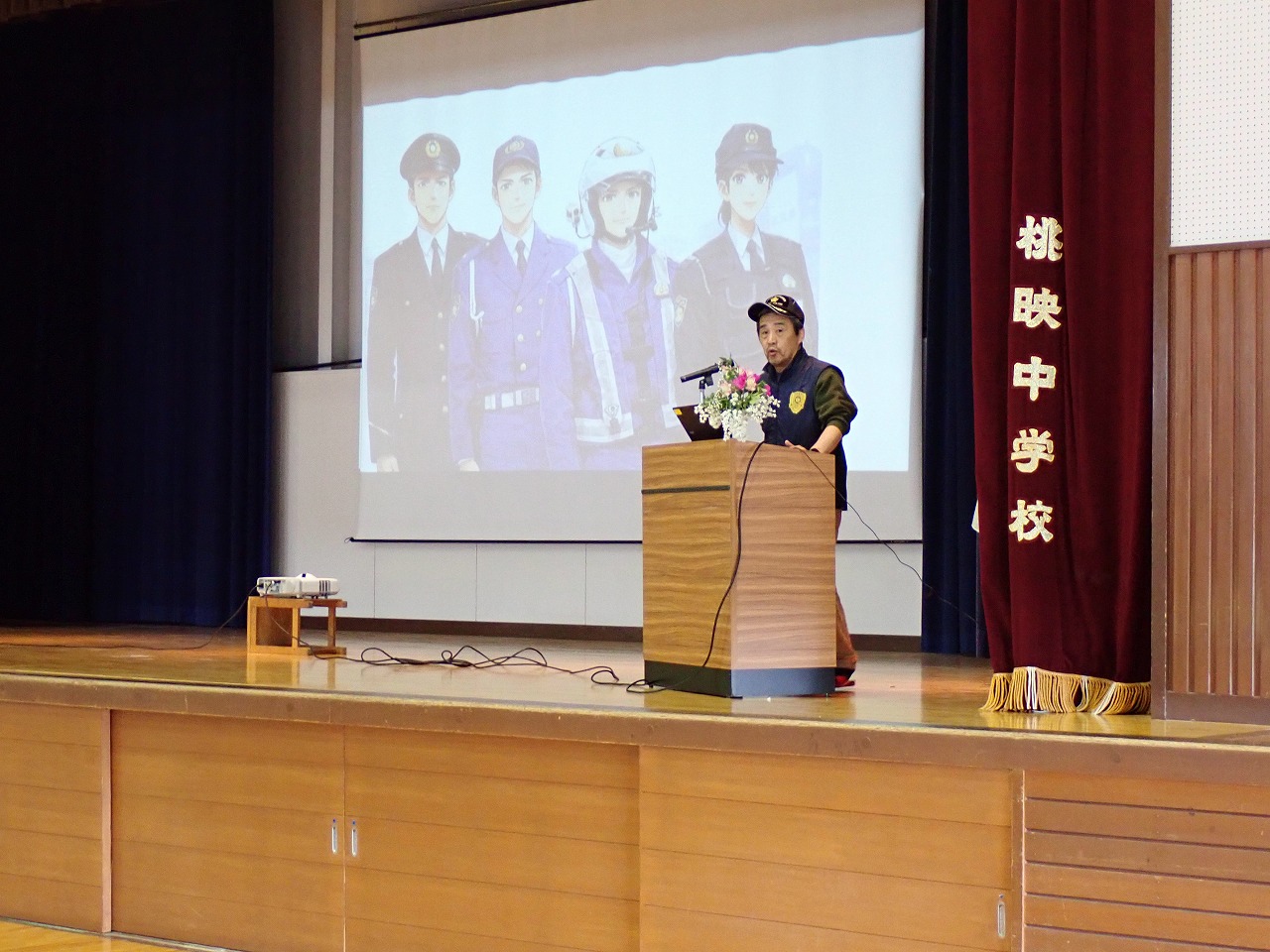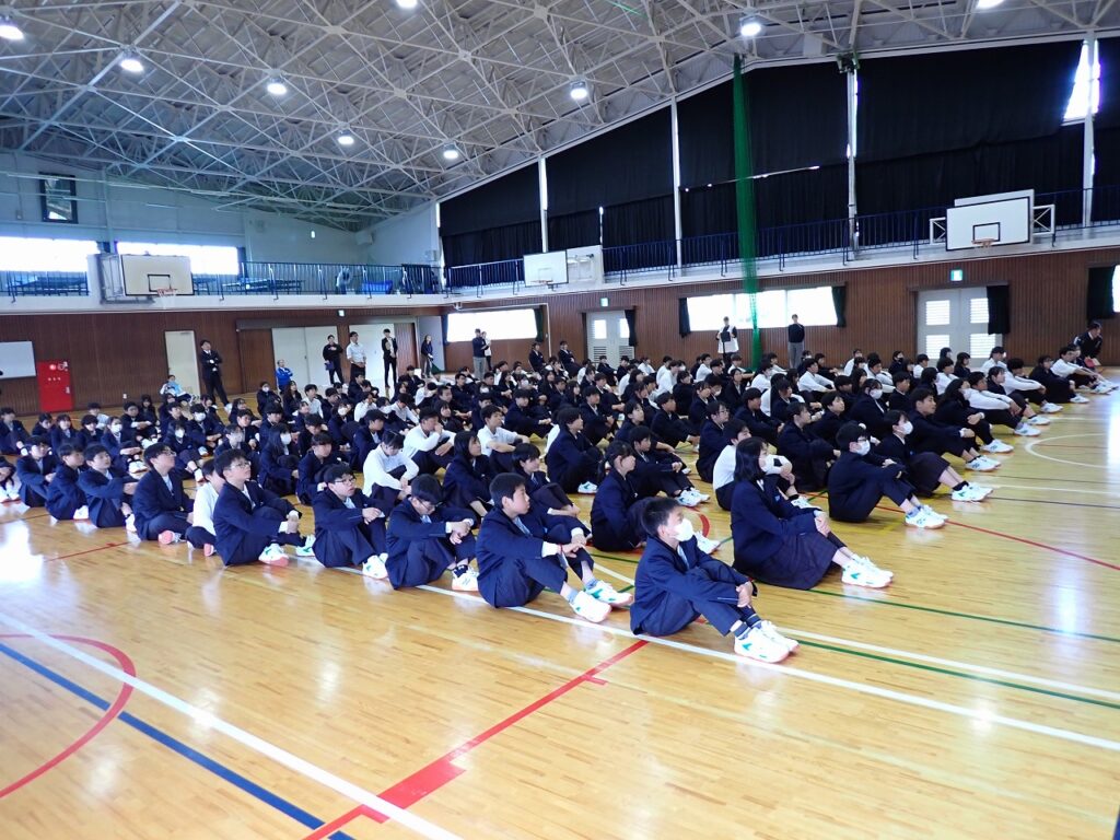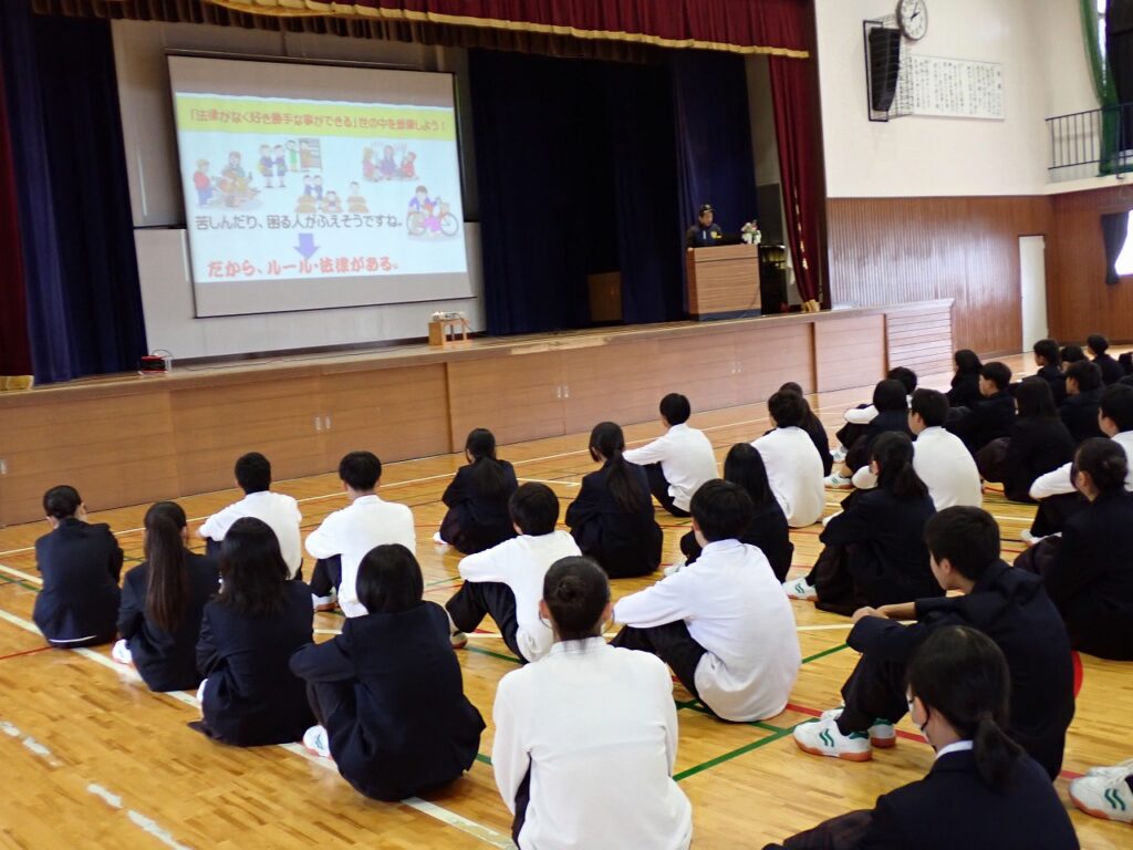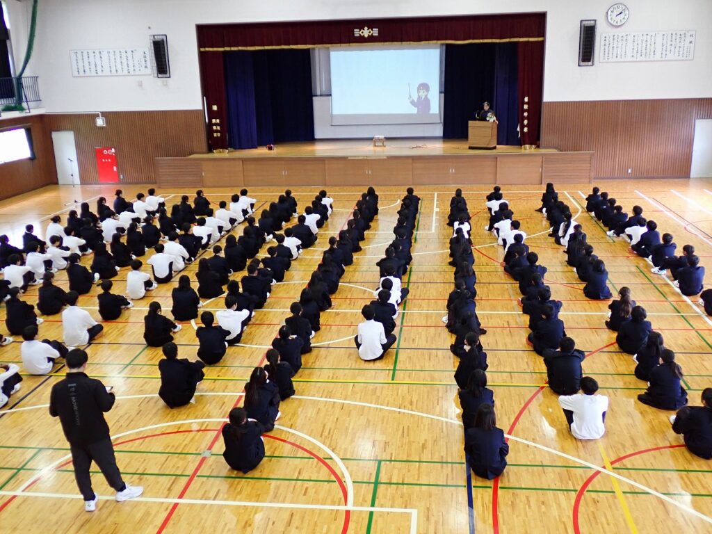 福知山警察署からスクールサポーターの方をお招きし、非行防止教室を実施しました。講演では、日常生活に潜む危険や非行につながる行動について、具体的にお話しいただきました。また、SNSの使い方によるトラブルや、軽い気持ちでの投稿が大きな問題につながることについても学びました。生徒たちは真剣に話を聞き、自分自身の行動を見つめ直す貴重な機会となりました。